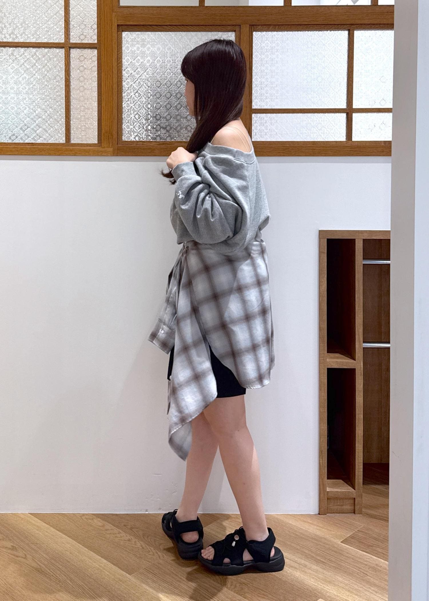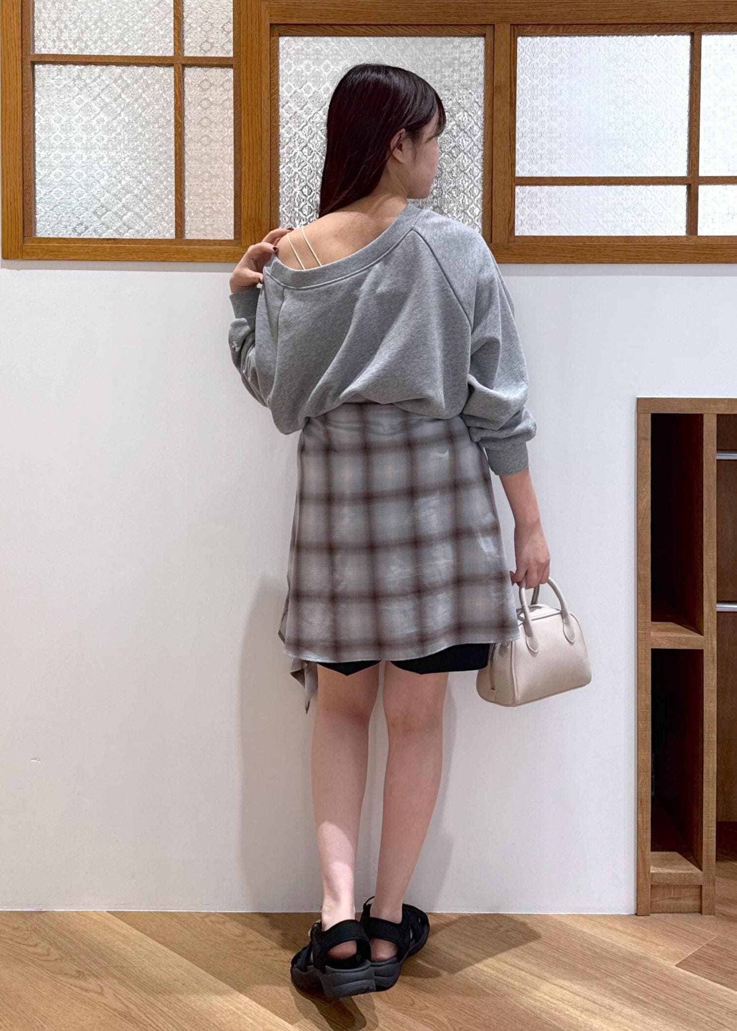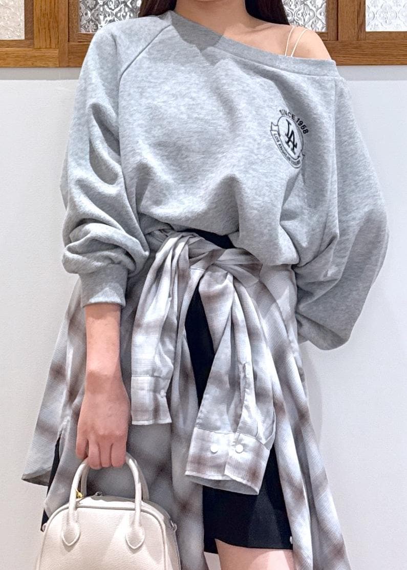 肩出しで抜け感を作れるスウェットを主役にカジュアルなコーディネートを組みました。