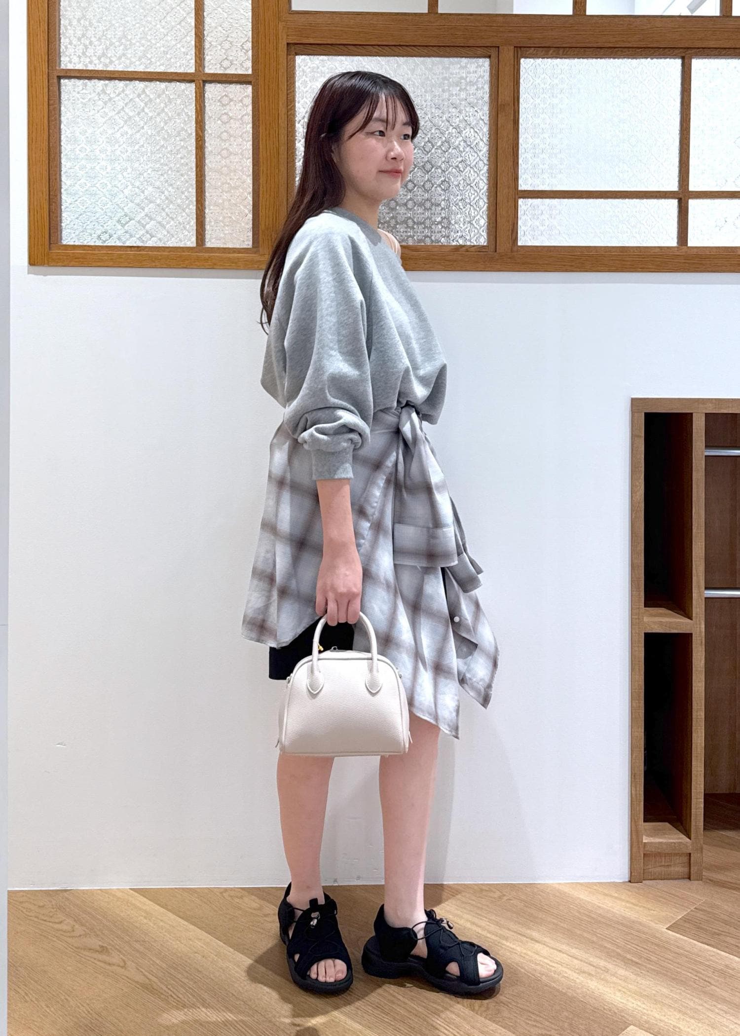 チェックのシャツを腰に巻き、秋らしさを取り入れているのがポイントです。