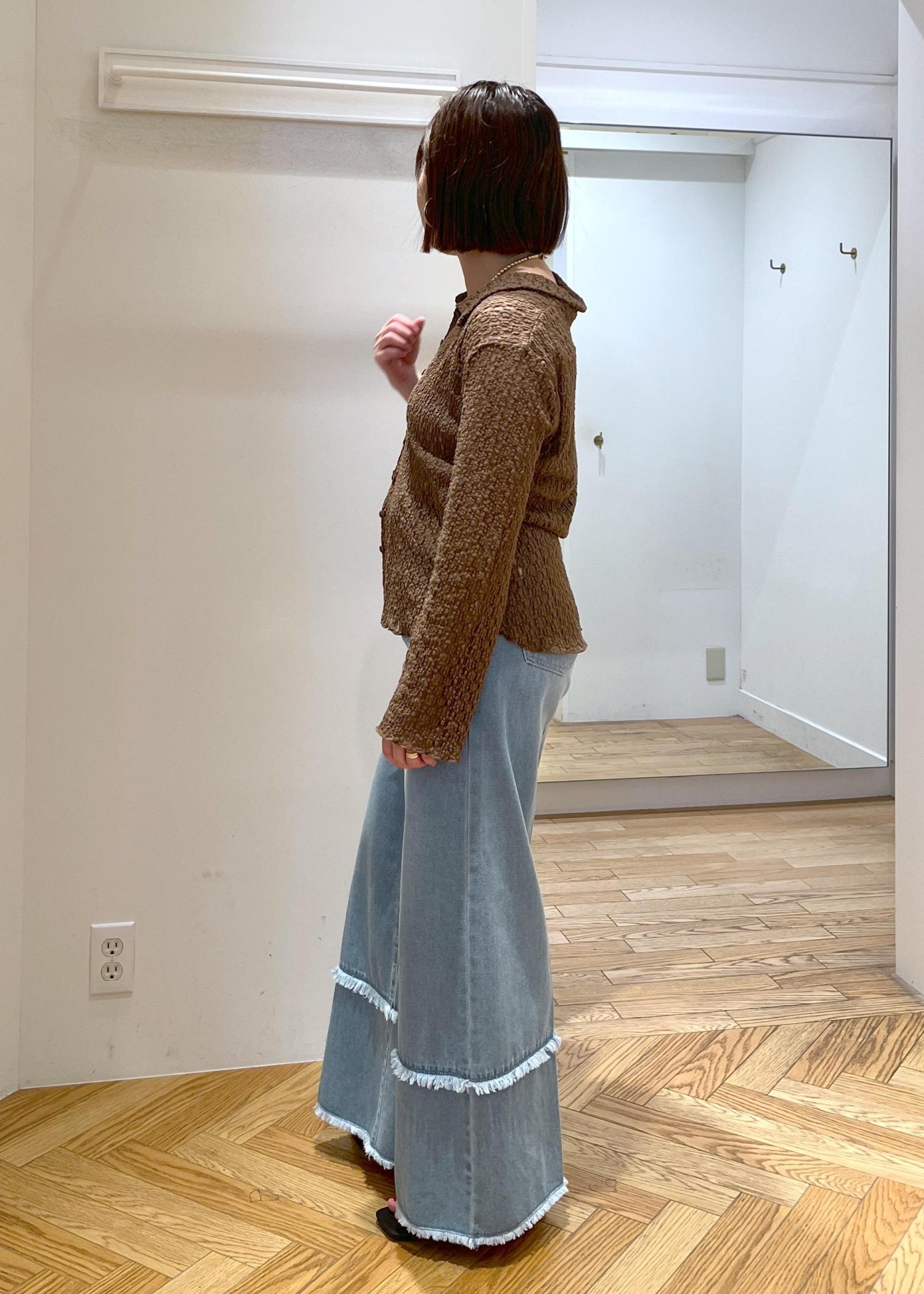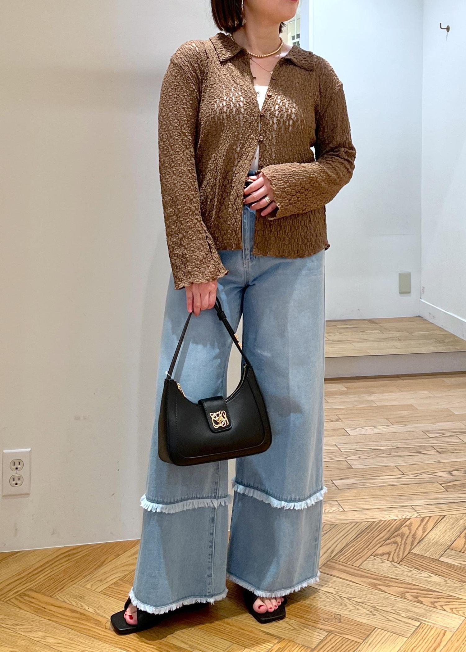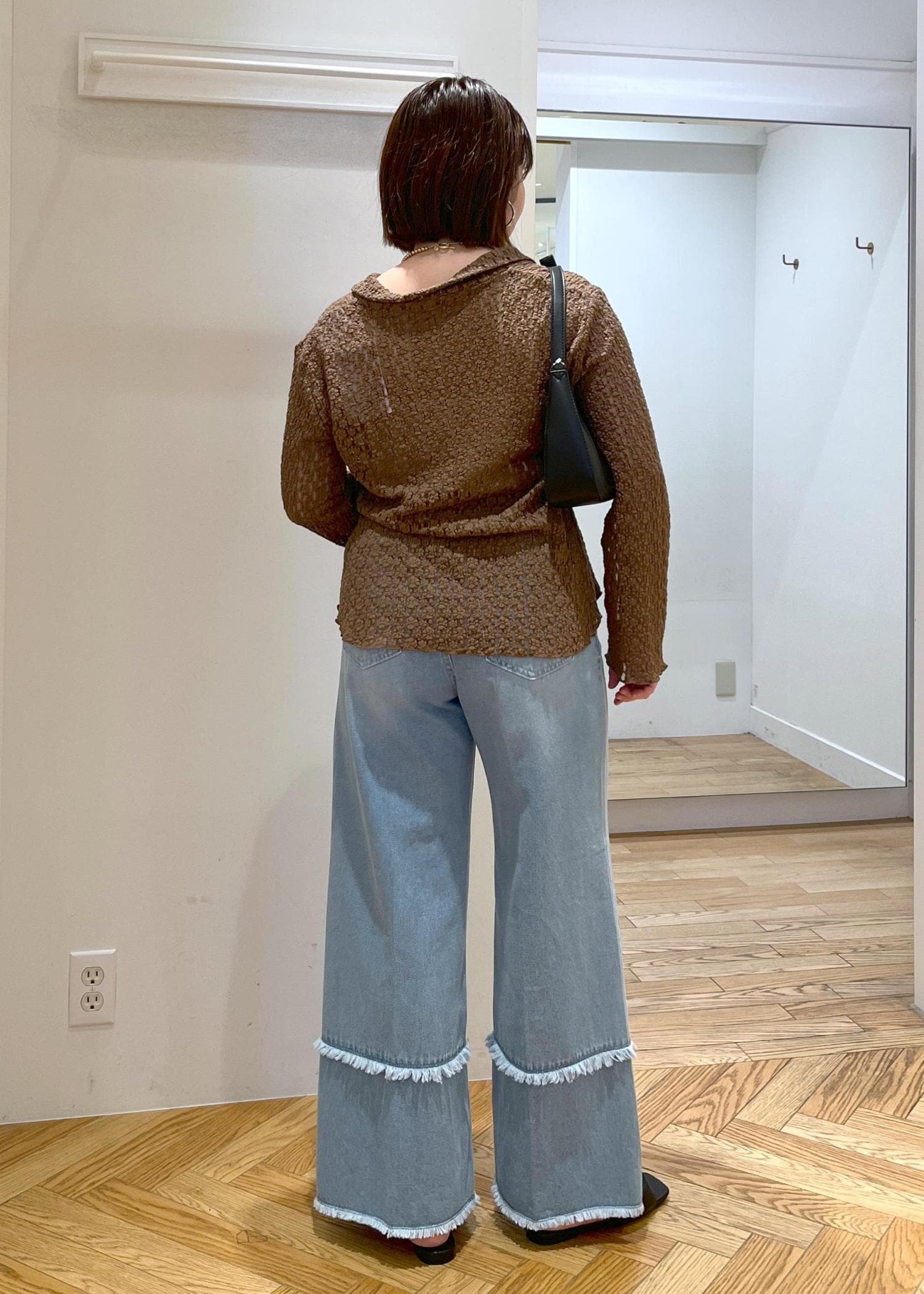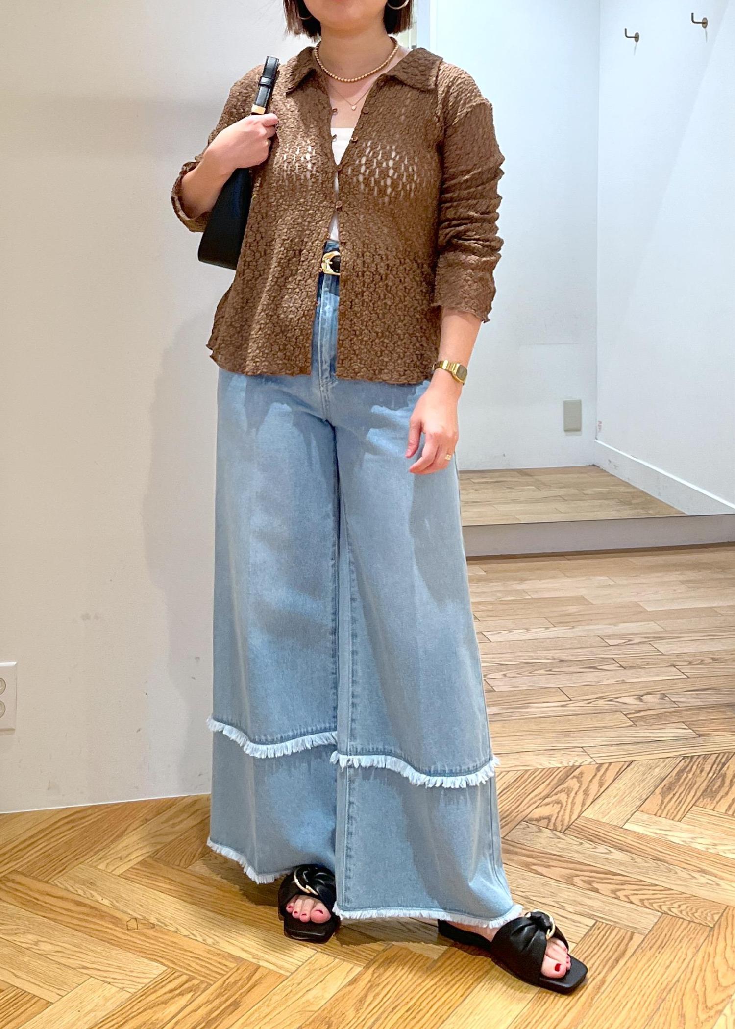 秋っぽさを楽しめる、総レースのカーディガンを使ったスタイルです。