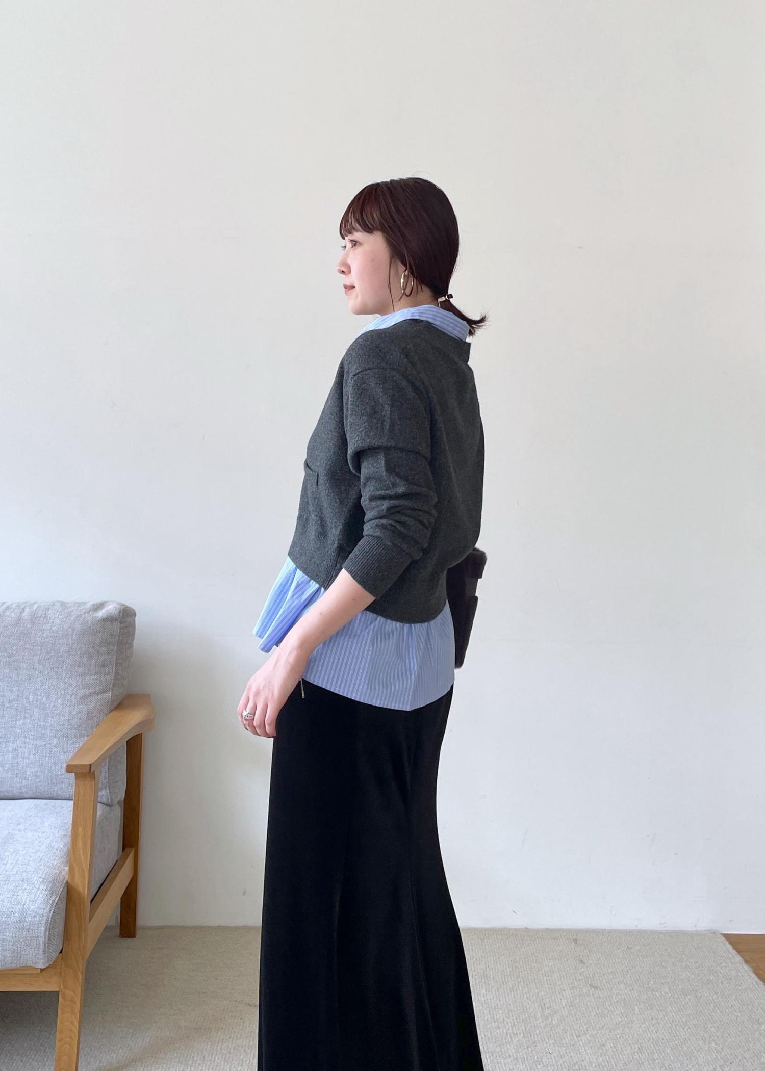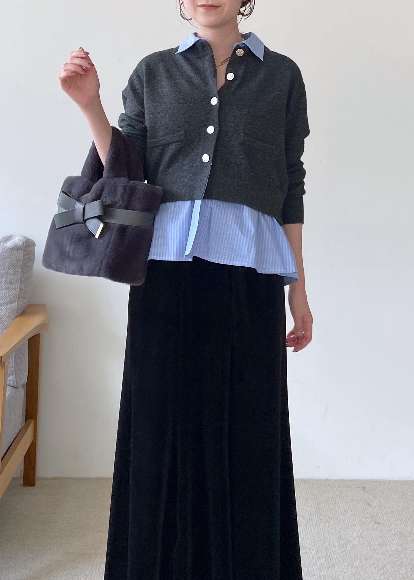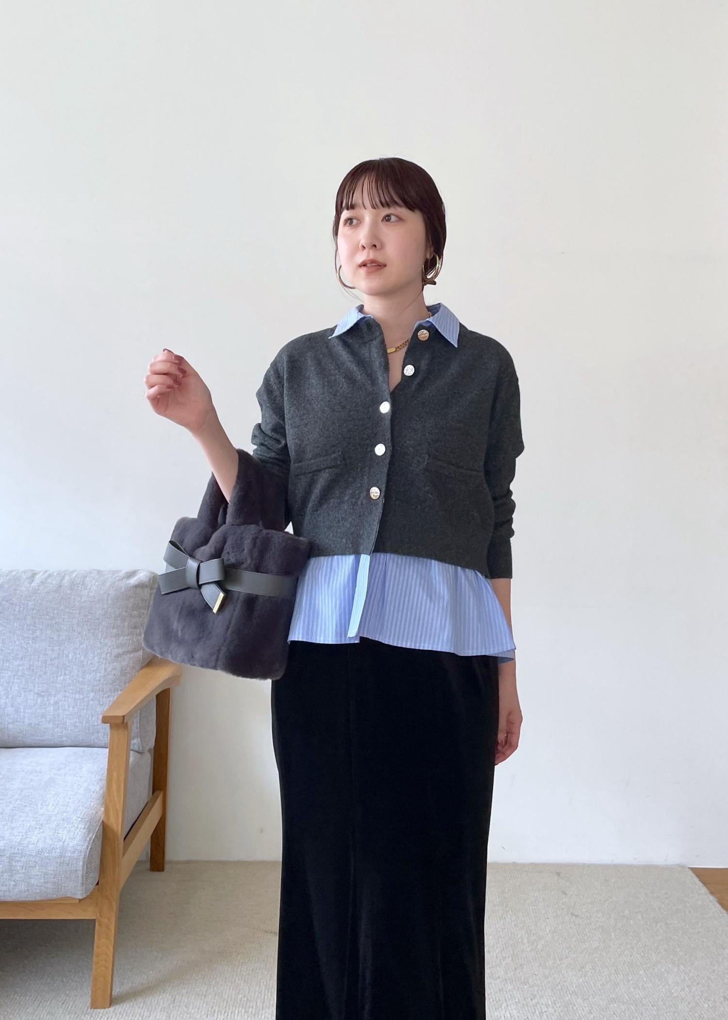 VISシャツレイヤード風メタルボタンカーディガンチャコール / F¥6,589レビュー1枚でお洒落が完成する優秀アイテム♡程よくゆるさのあるサイズ感、身長159cmでヒップにかかる着丈なので体型カバーも叶います。ニット部分はチクチク感無く肌あたりも柔らかいです◎綺麗め〜カジュアルまで、様々なシーンで着用できます!