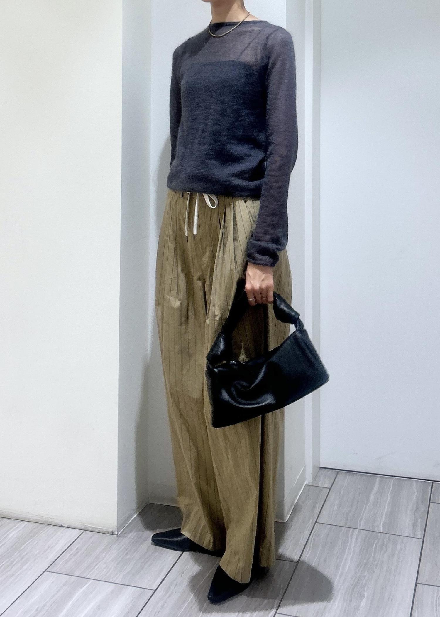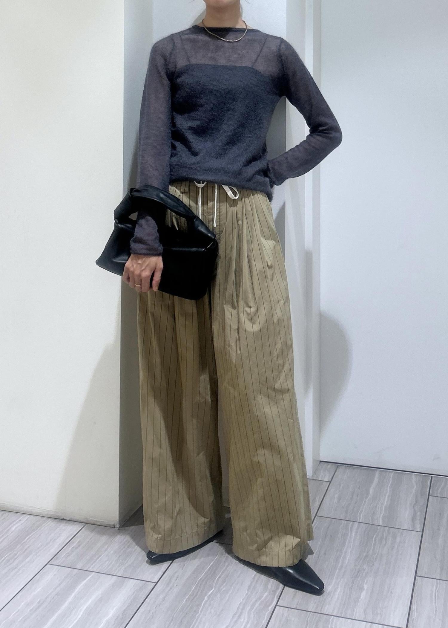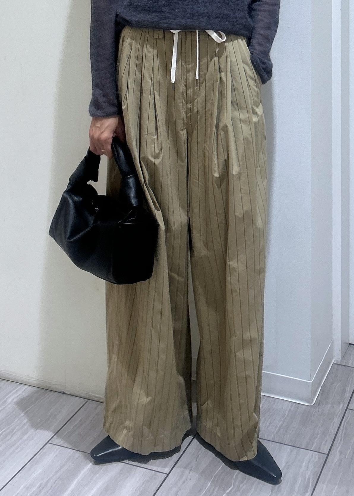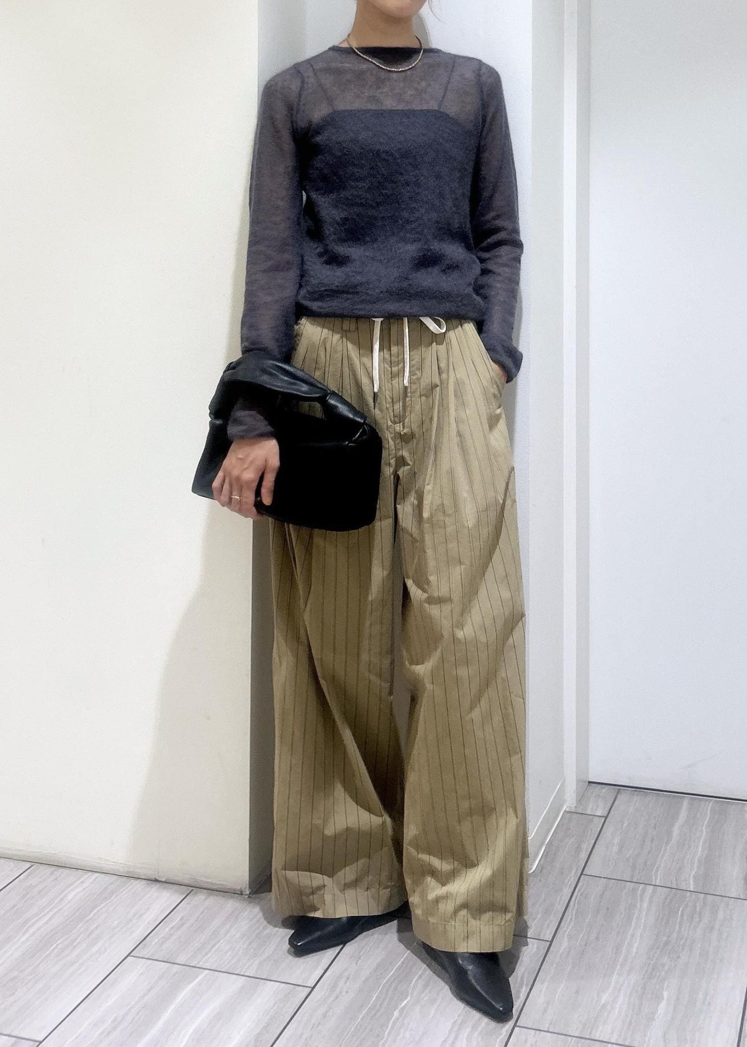 ボトムは、シャツ地ならではの軽さが心地よいストライプスラックスを合わせてリラックス感のある秋のスタイリングです♪