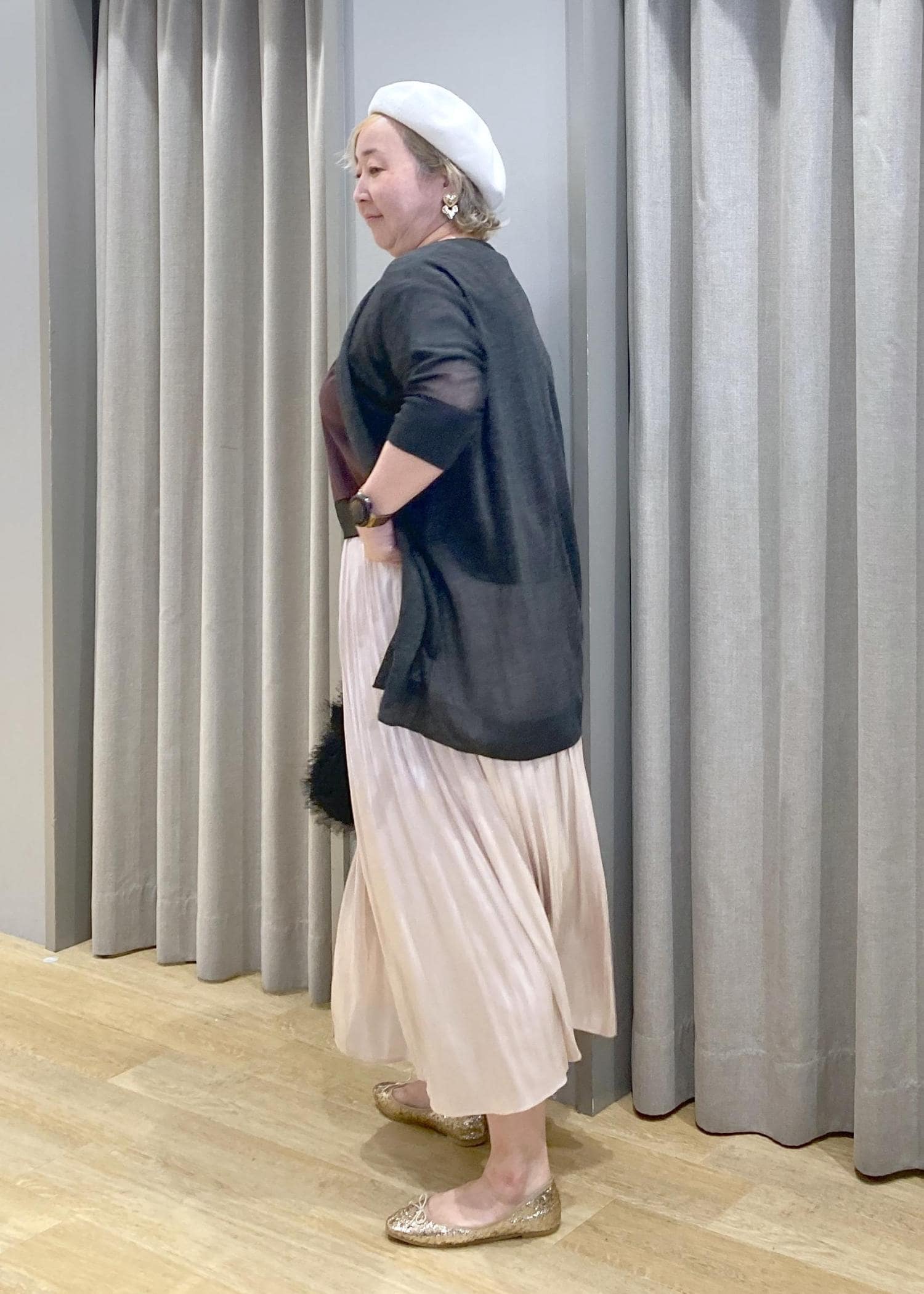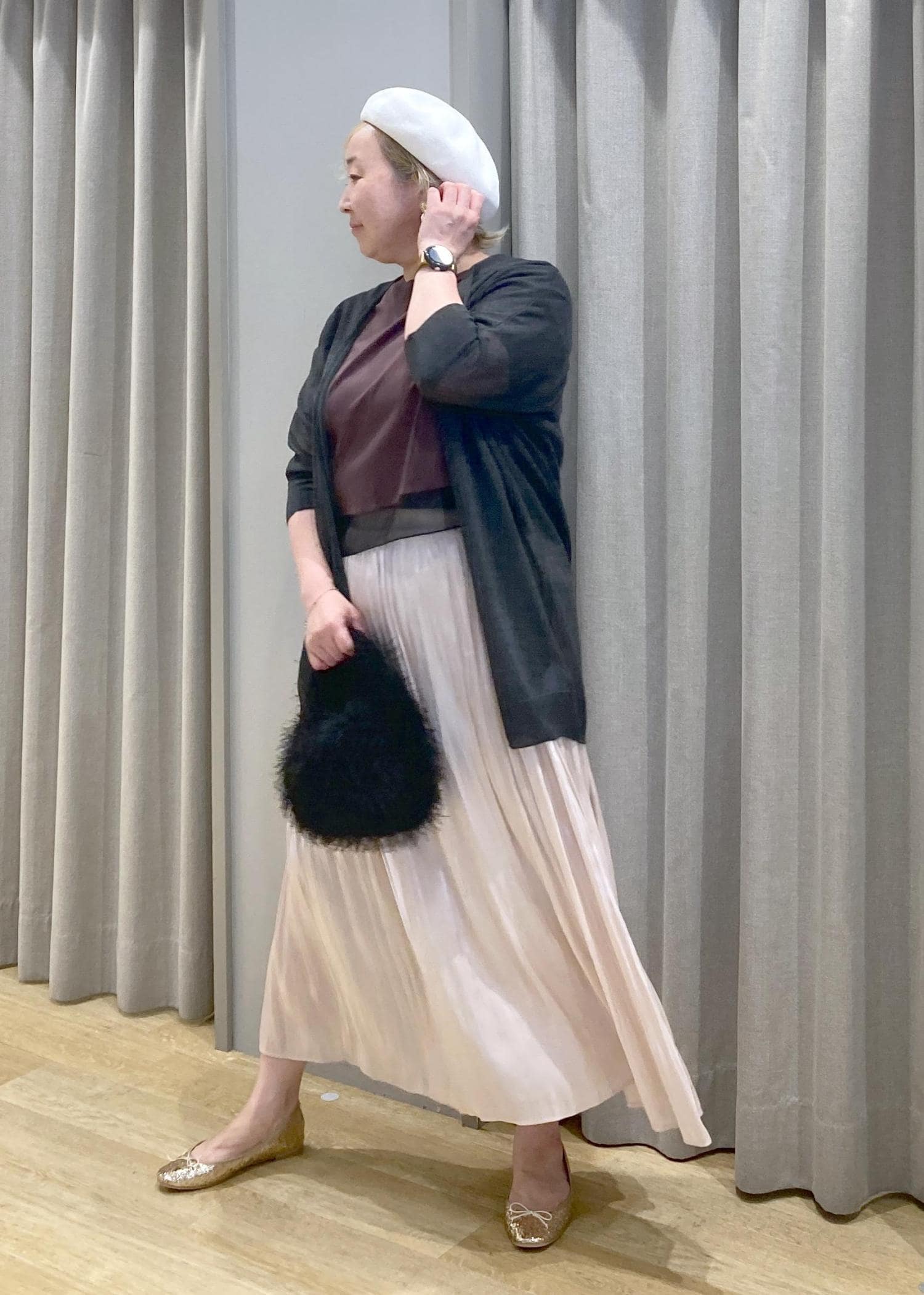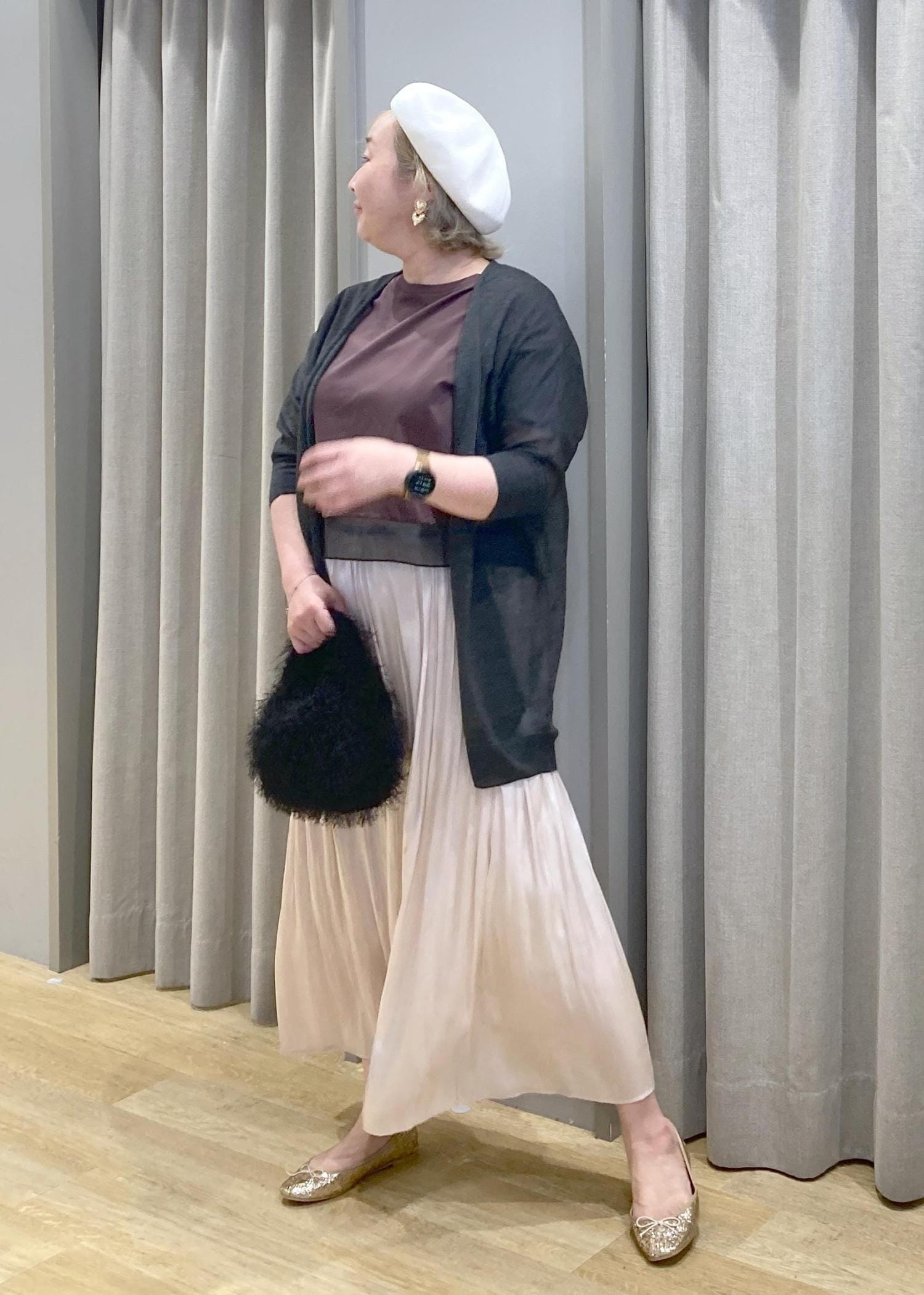 更に、お尻周りをカバー出来るトッパーカーディガンを合わせれば、落ち着いた印象に、ベレー帽と小物で遊び心もプラス。