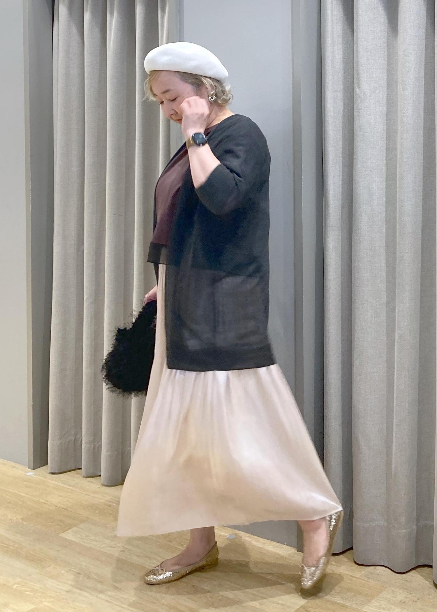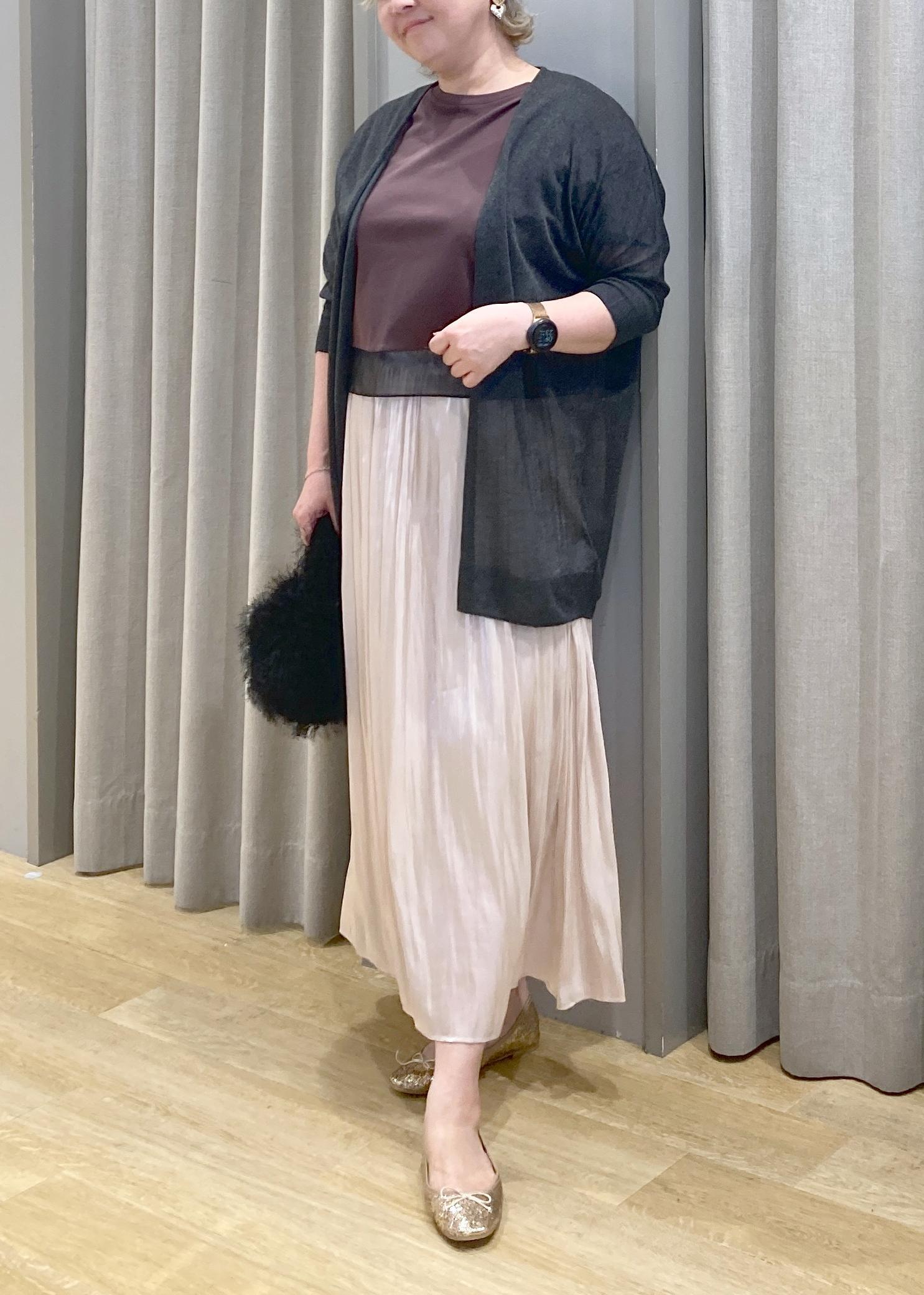 細めのプリーツが、体型カバーもしてくれ、光沢感のあるシャイニー素材が、異素材とのコーデに重宝します!