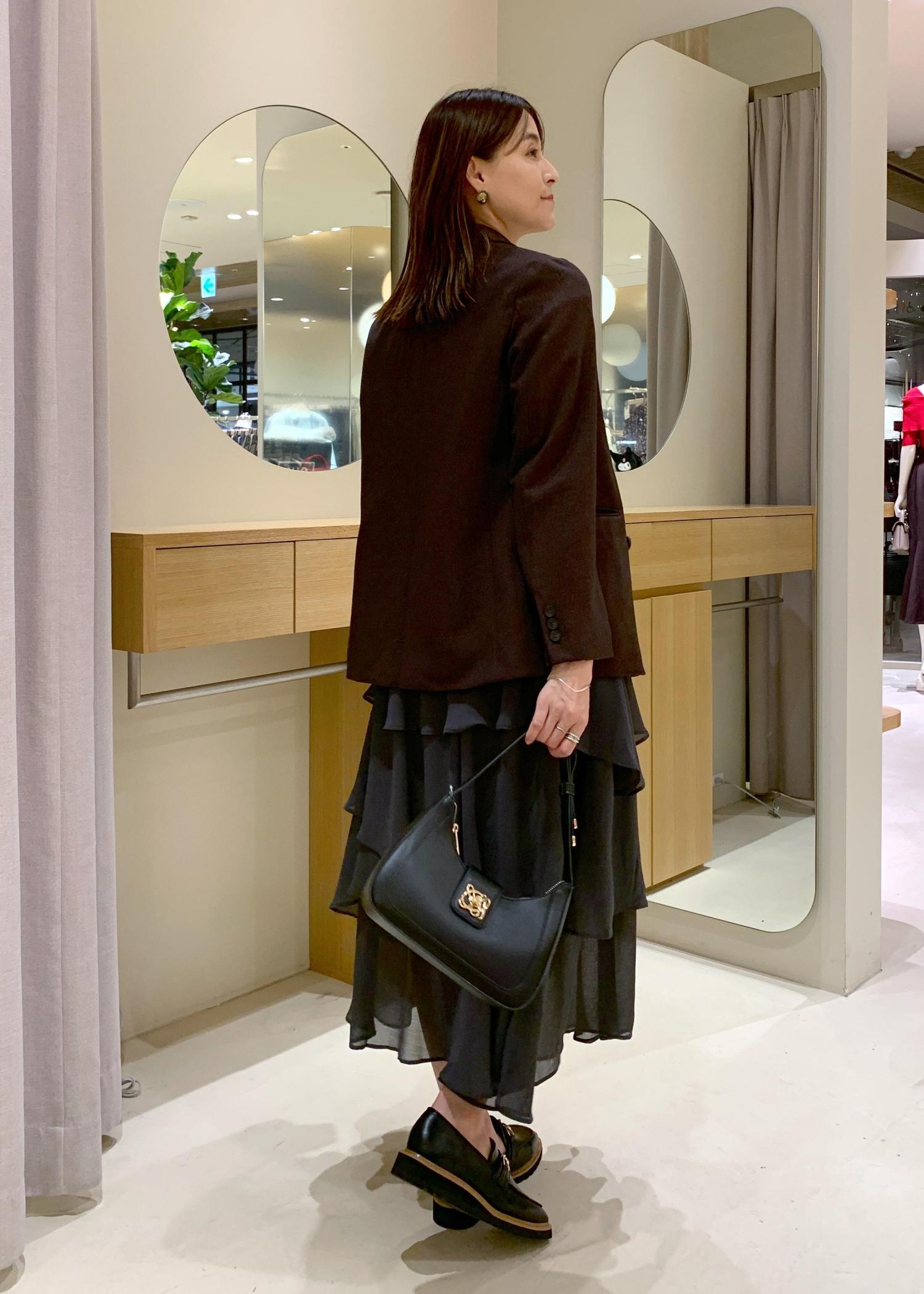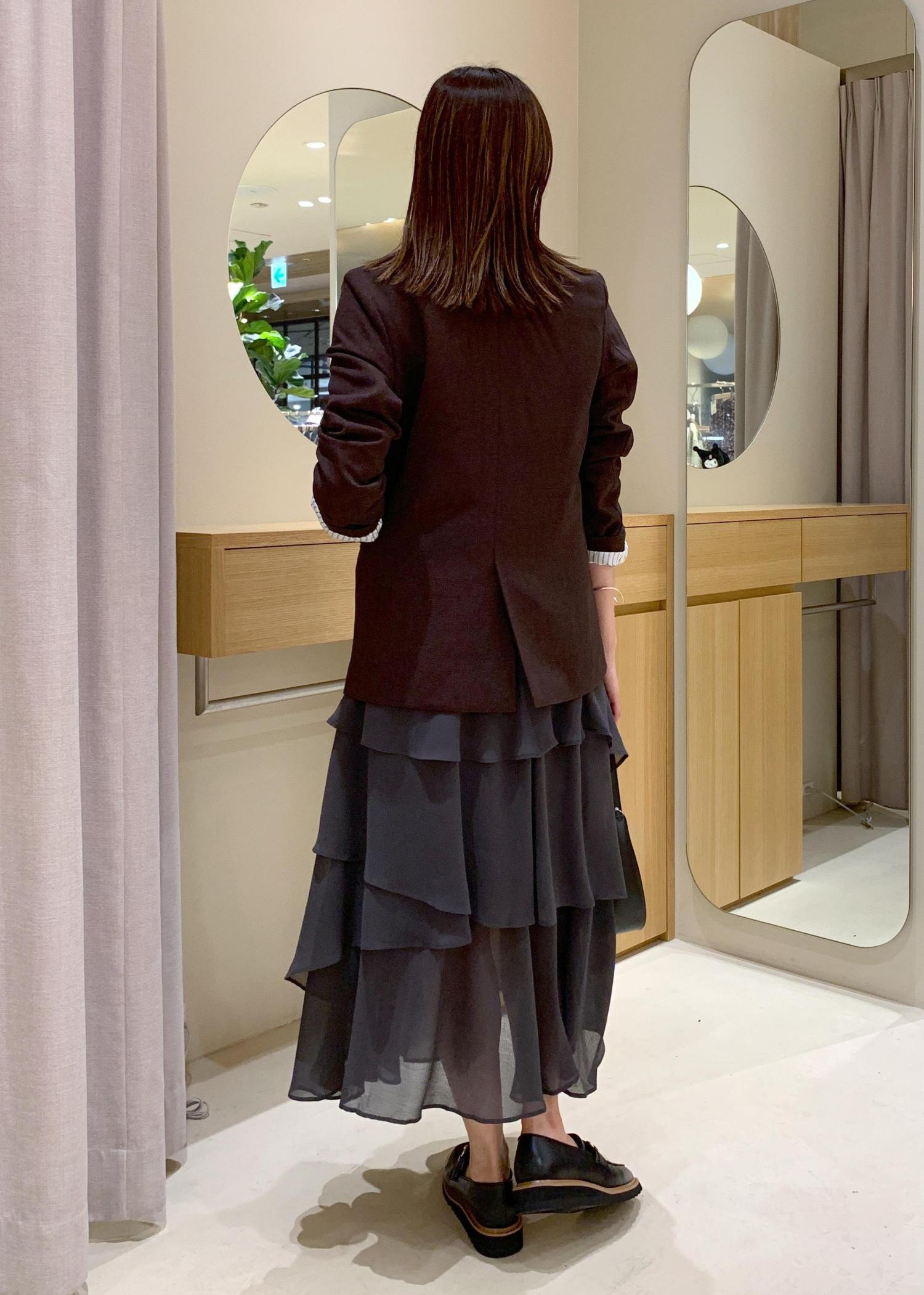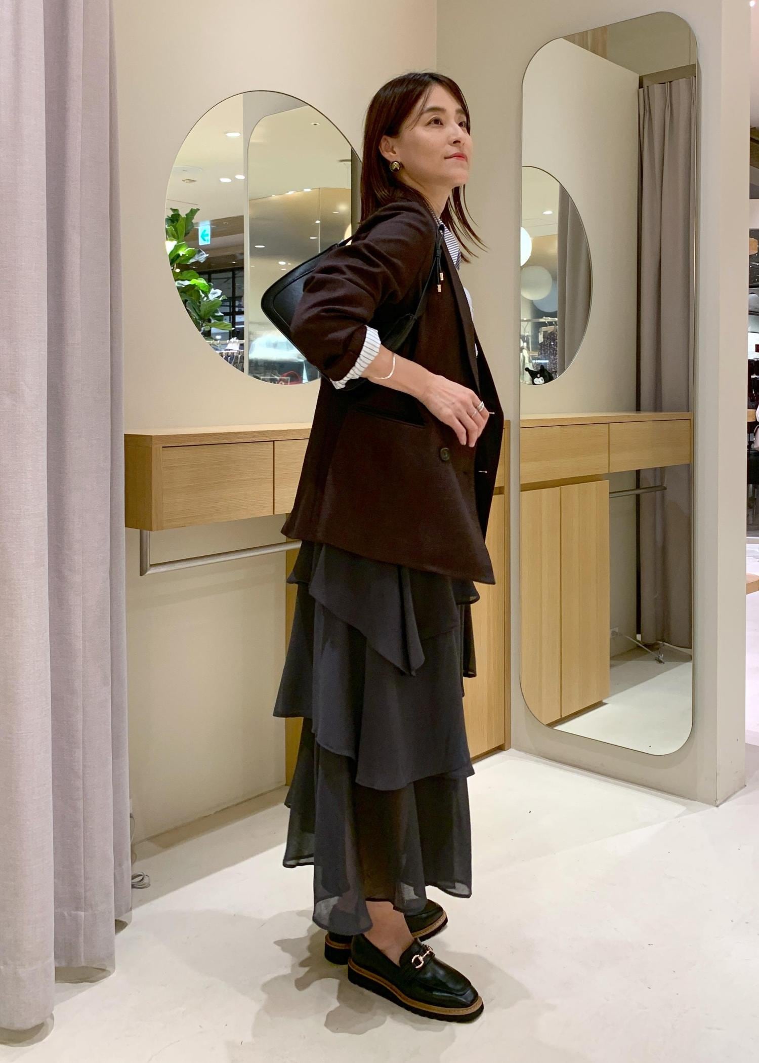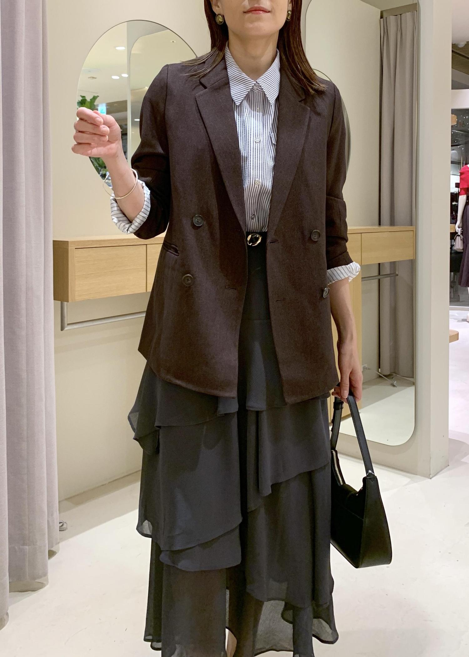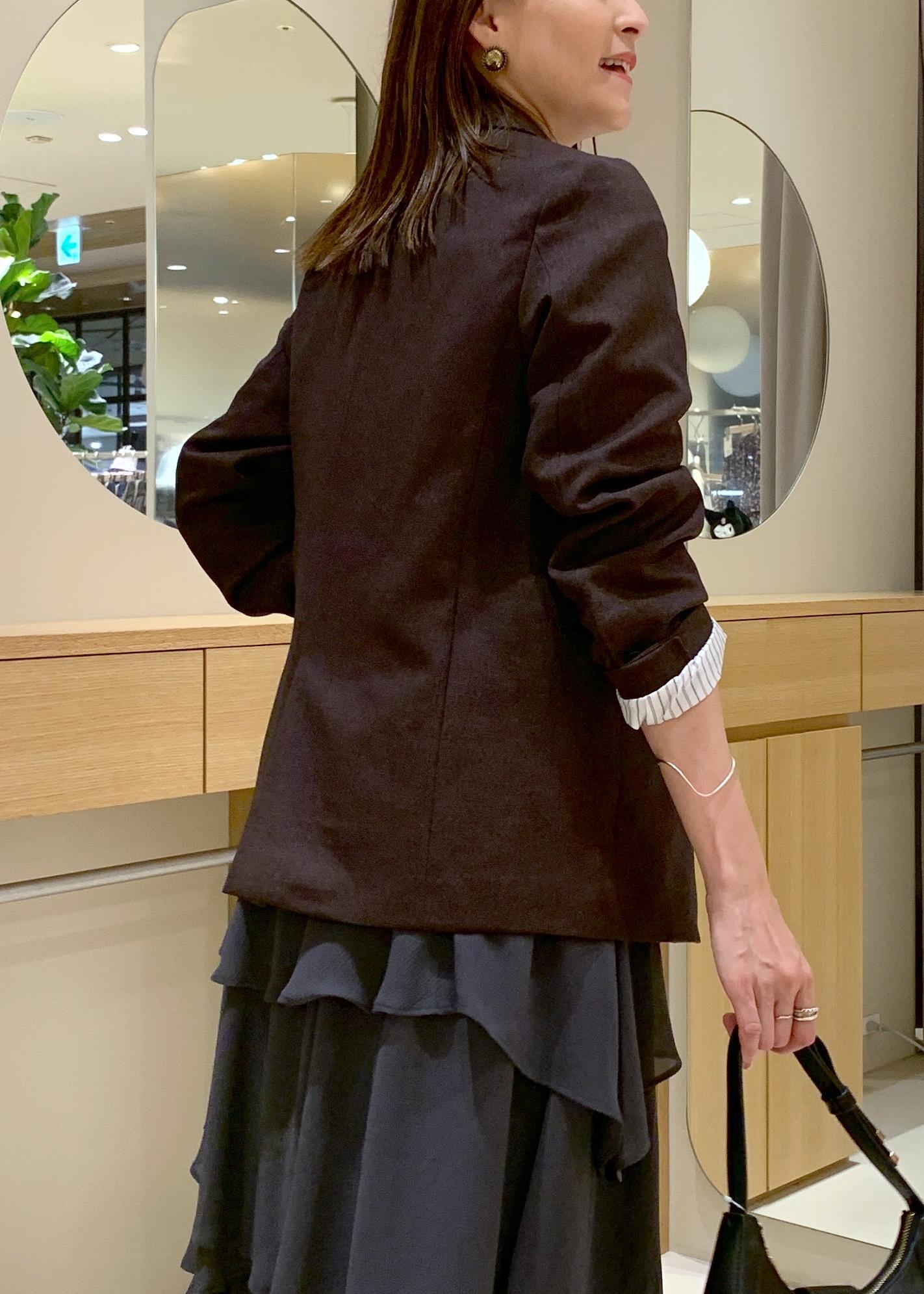 まだ今の時期、重みを感じるようであれば、袖をたくし上げて裏地のストライプを覗かせる着方がオススメです。 -