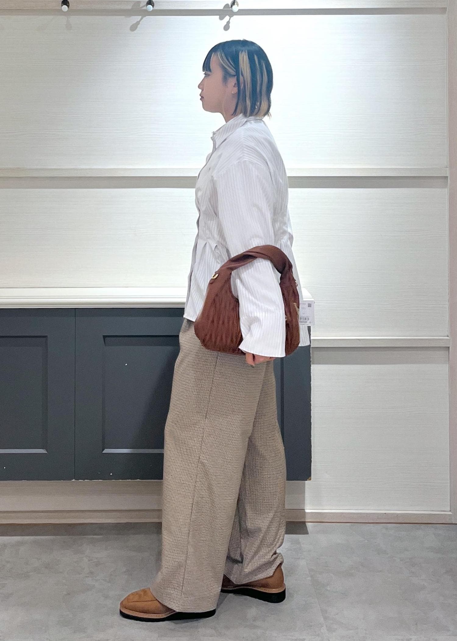 ブラウンのバッグとシューズをポイントに、