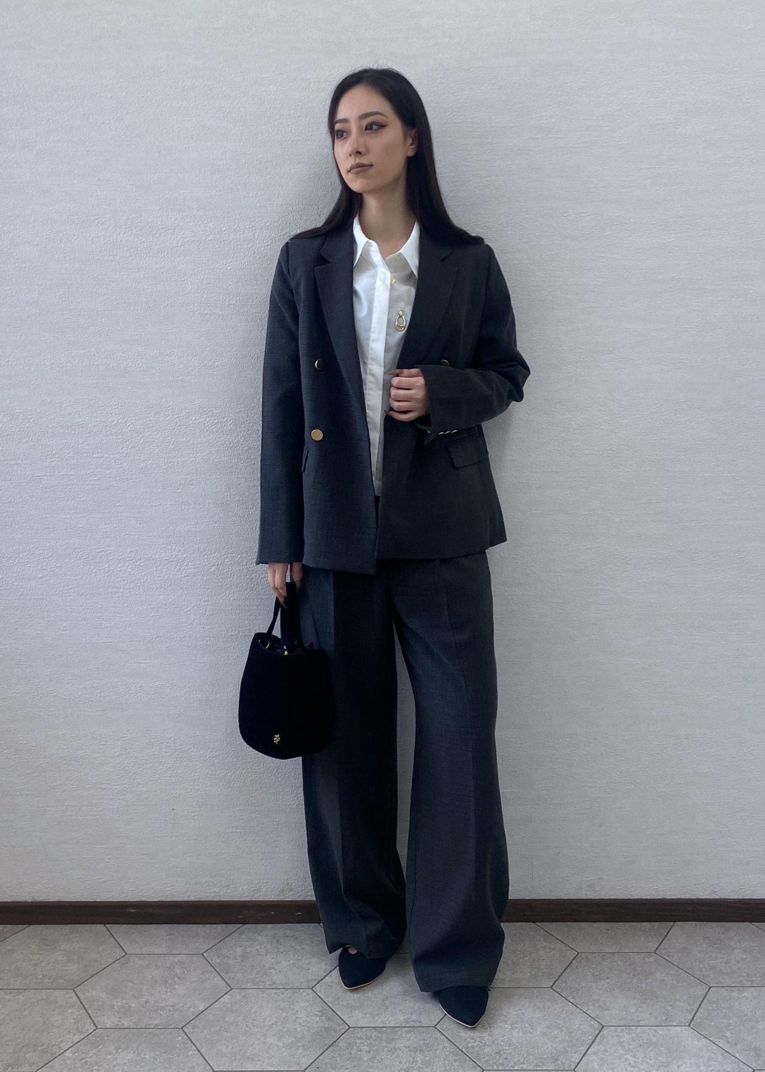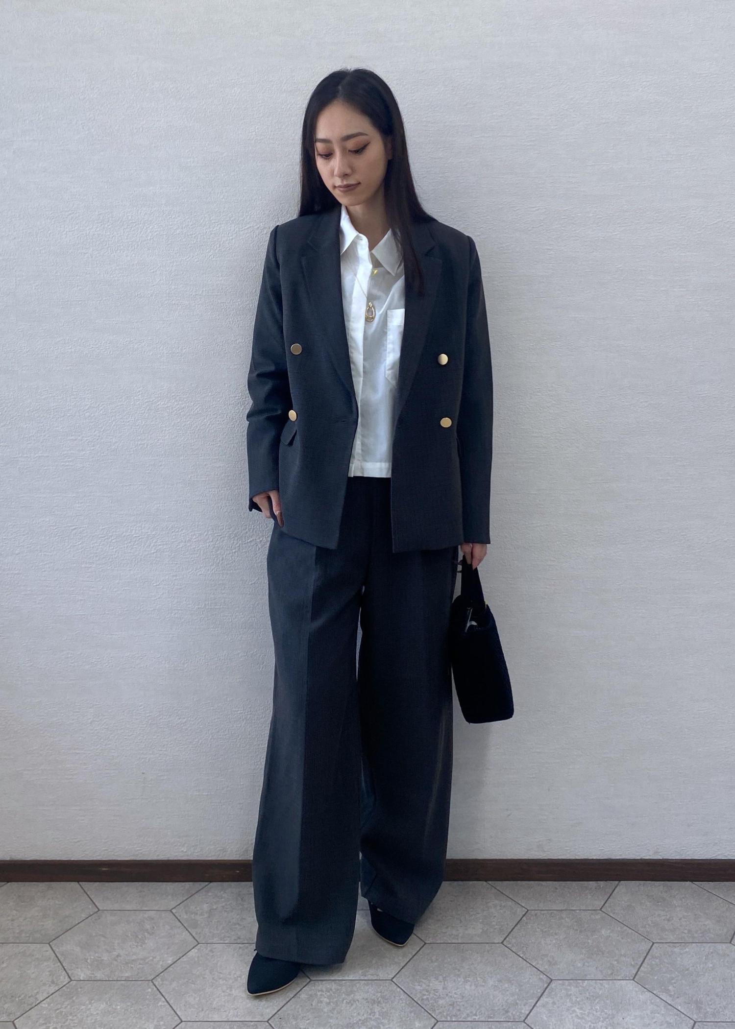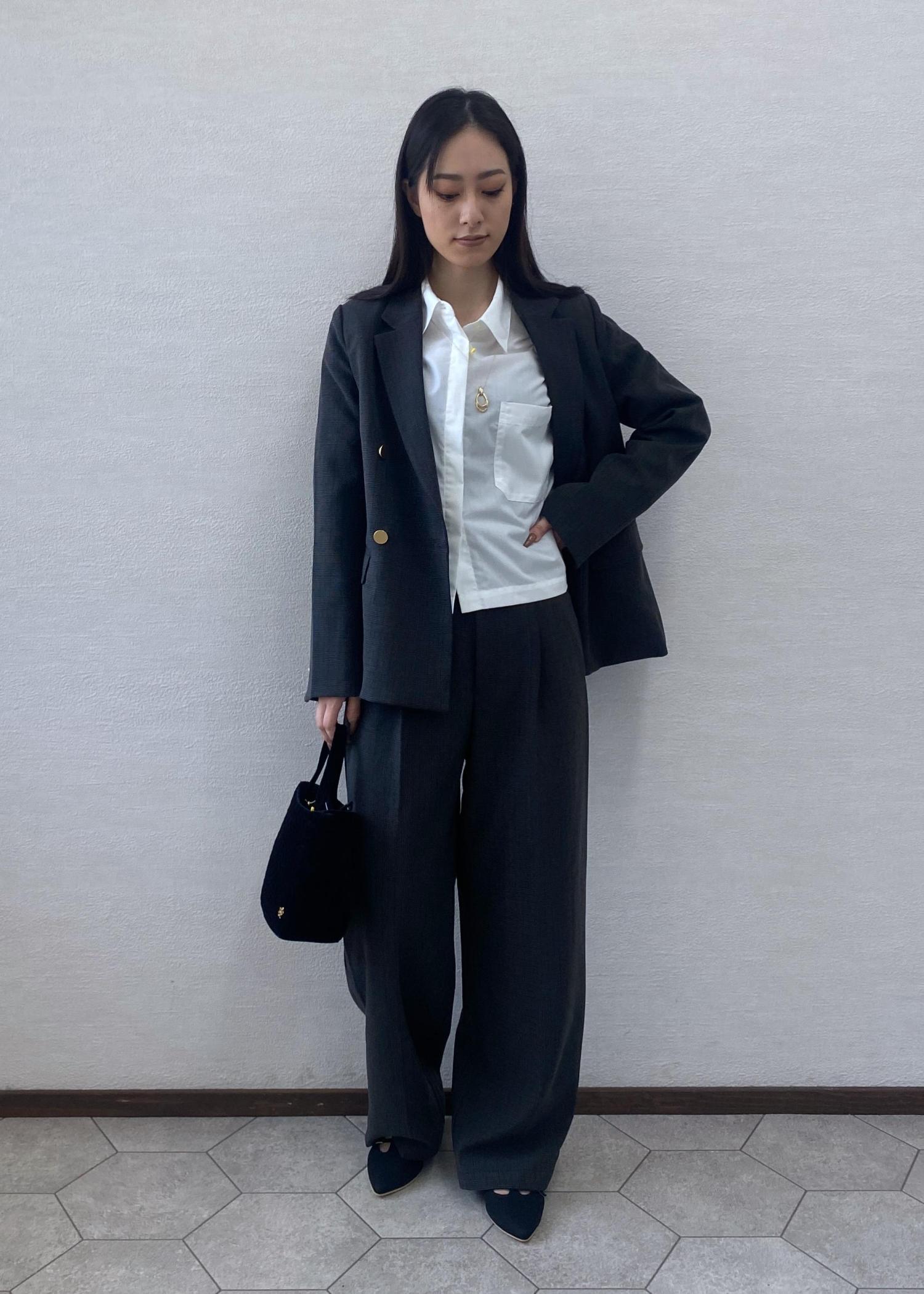 オーバーサイズで普段使いもできるジャケットにきちんと感のあるセットアップのパンツを合わせたキレイめなコーディネートです。