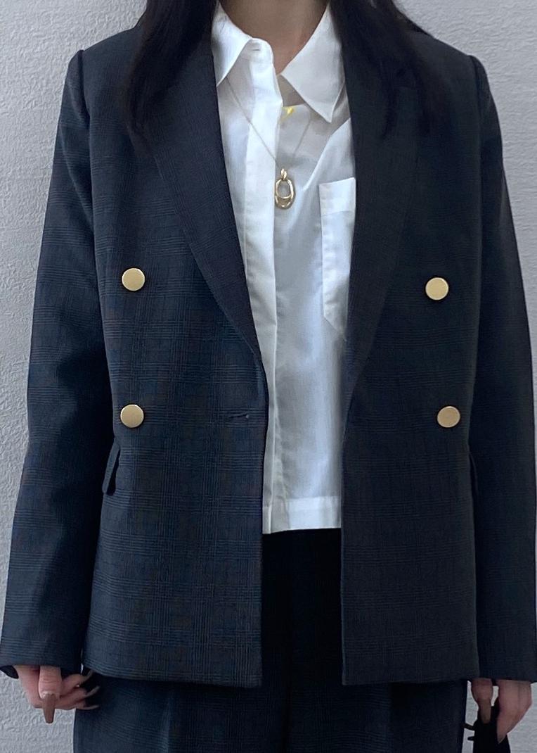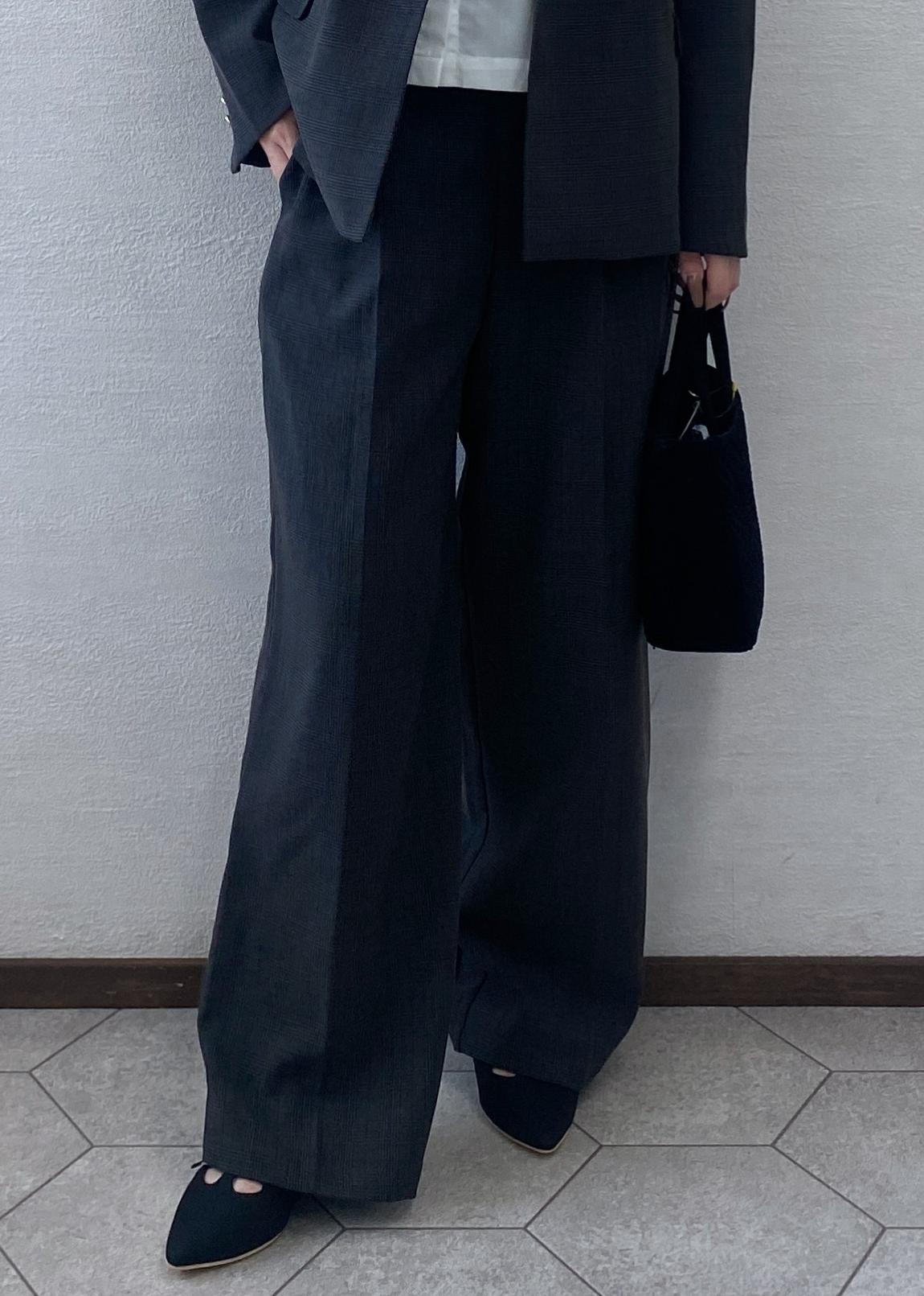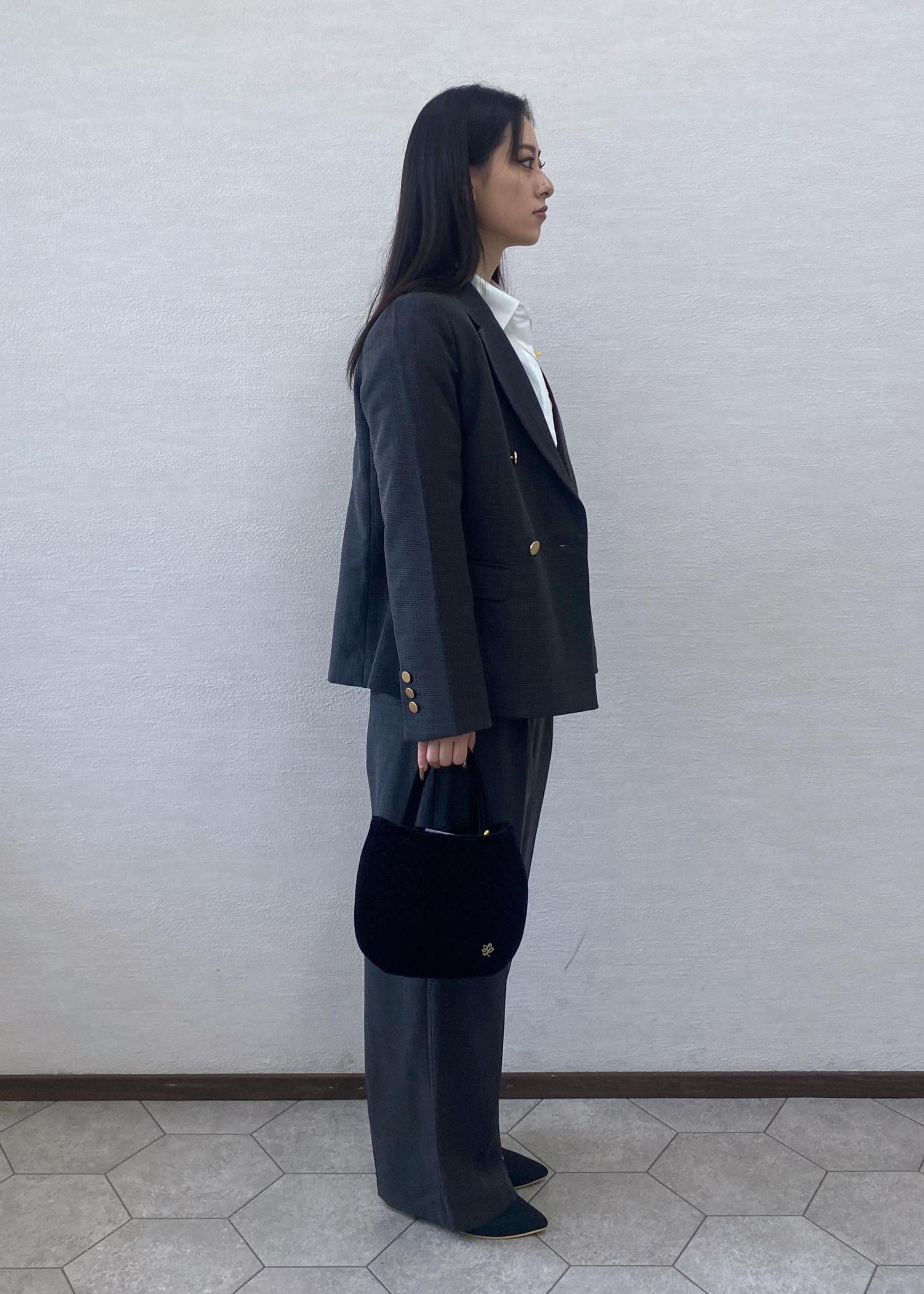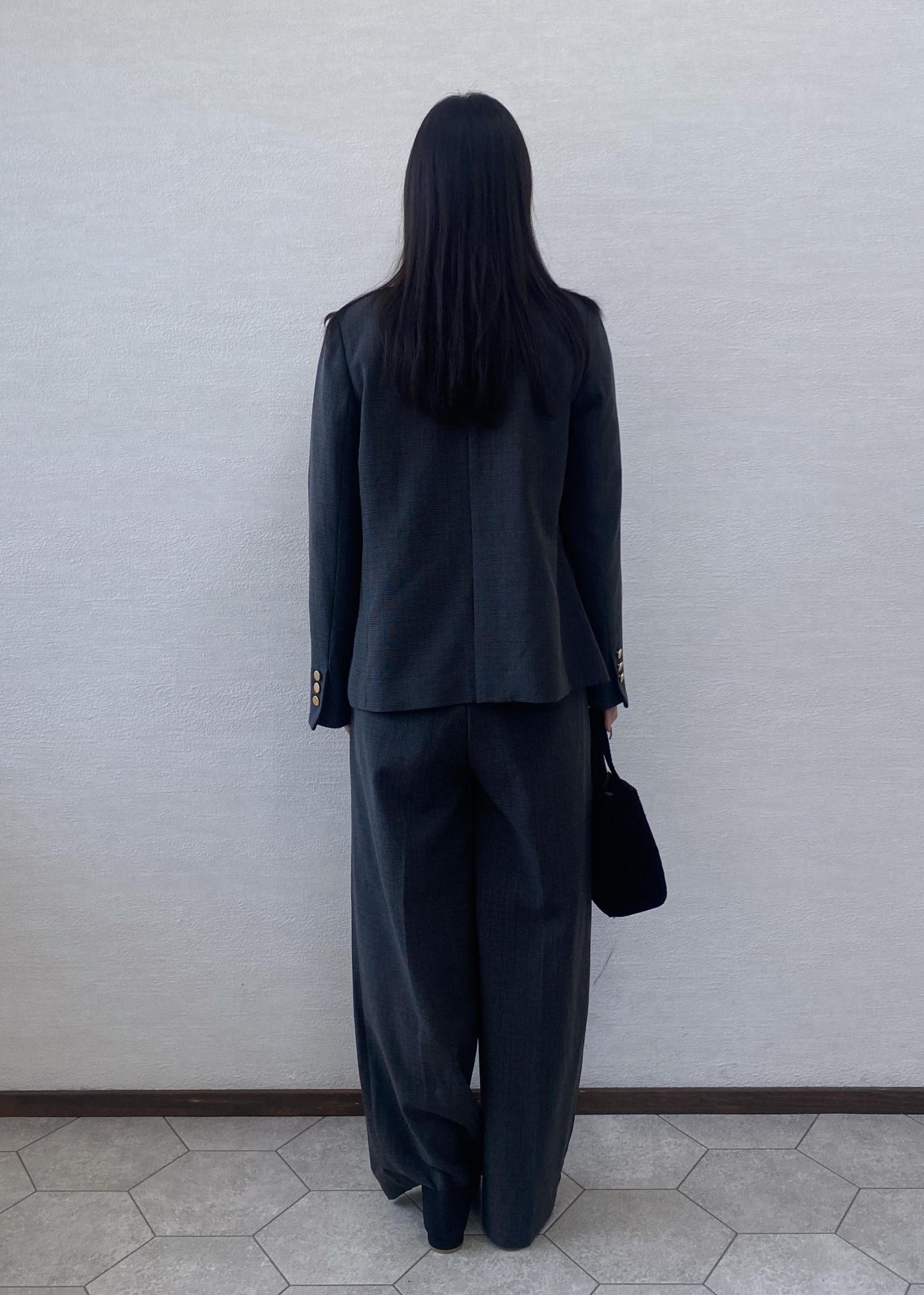 オーバーサイズで普段使いもできるジャケットにきちんと感のあるセットアップのパンツを合わせたキレイめなコーディネートです。