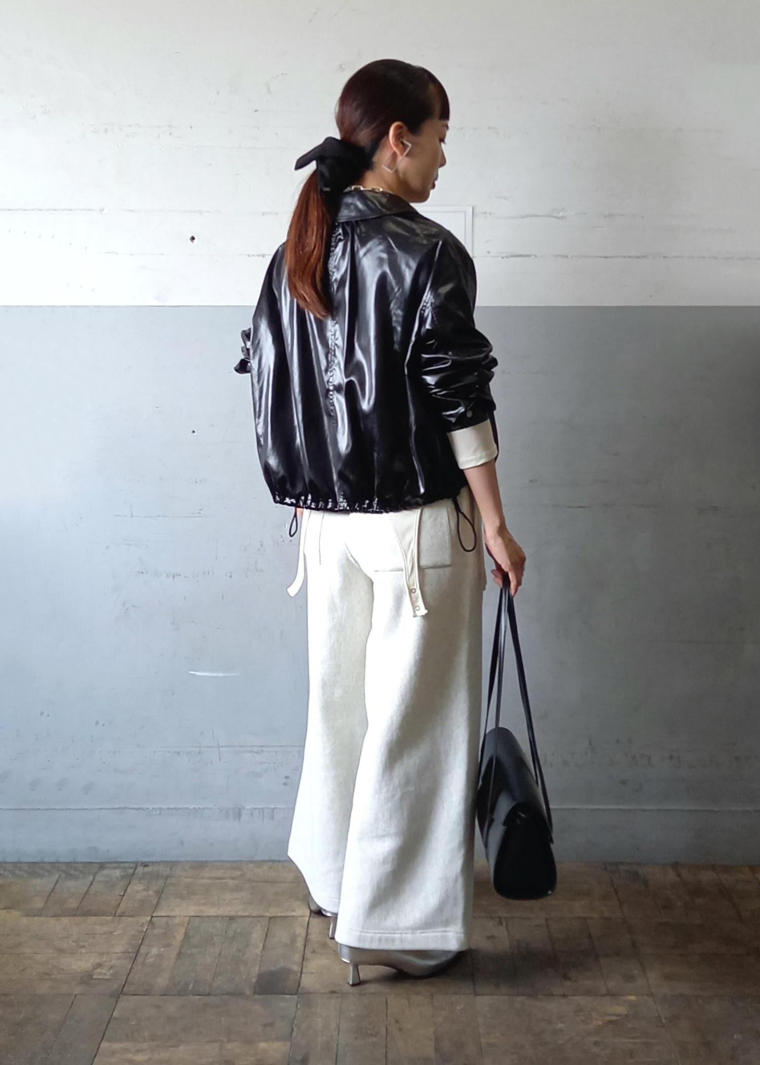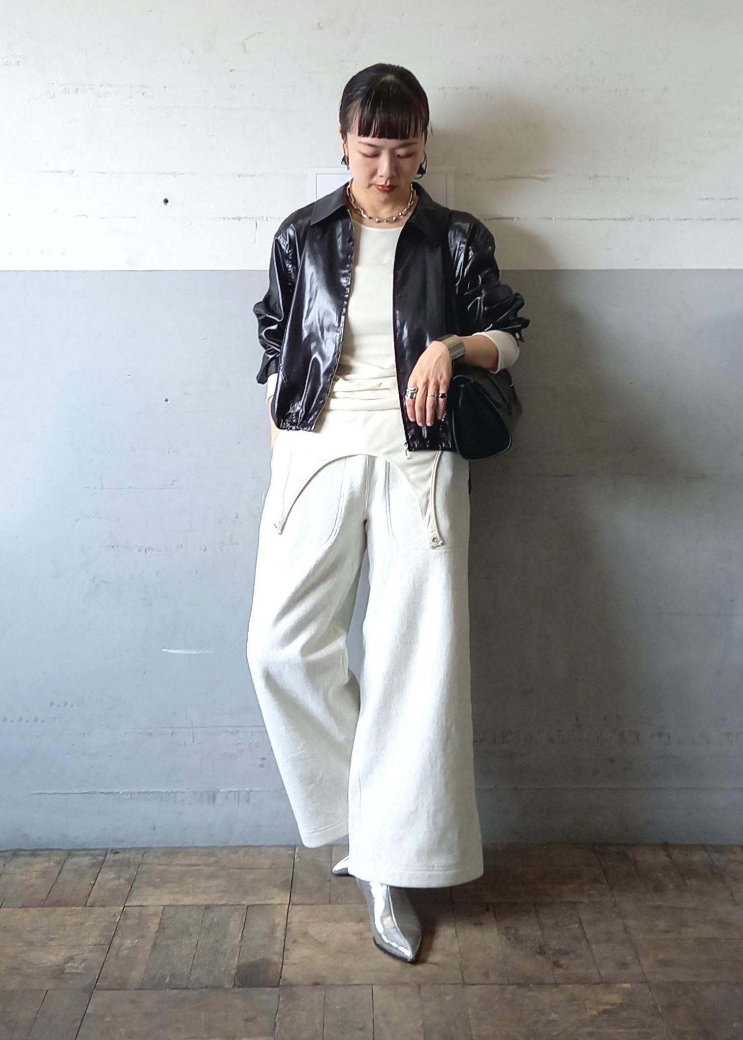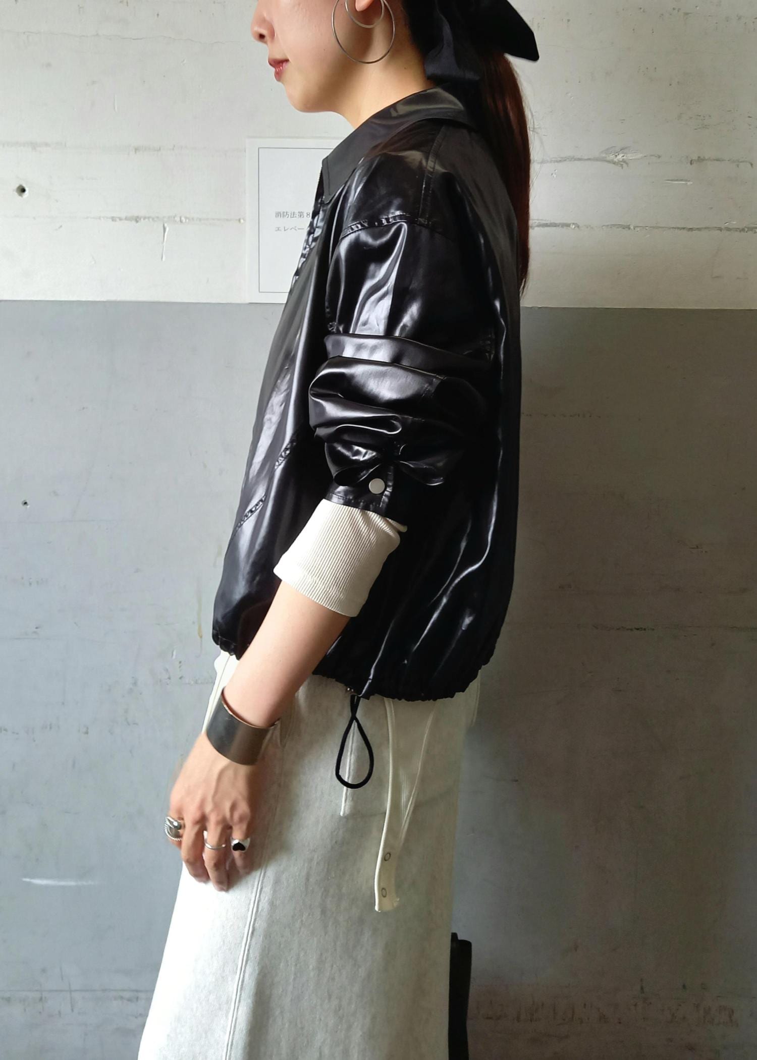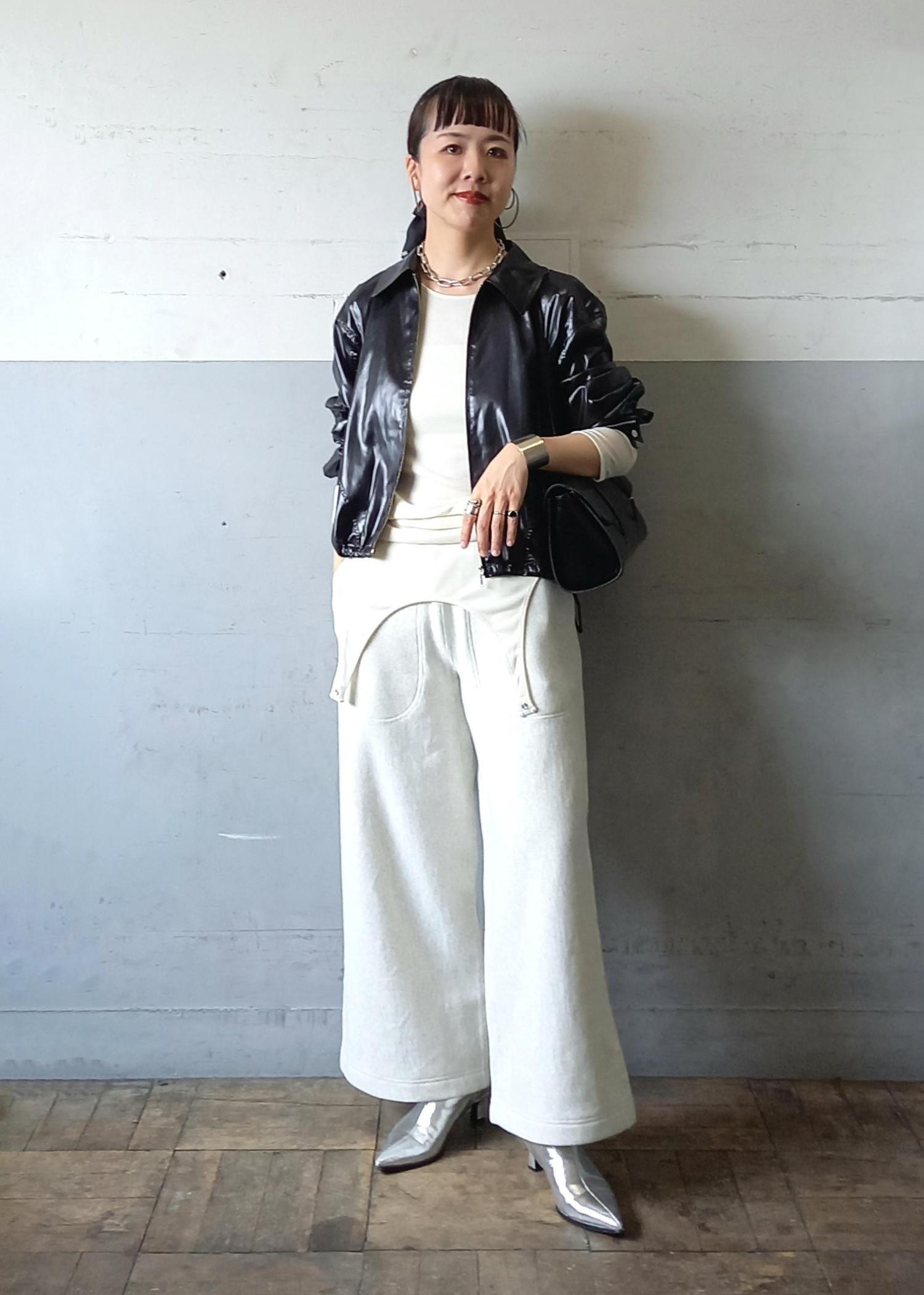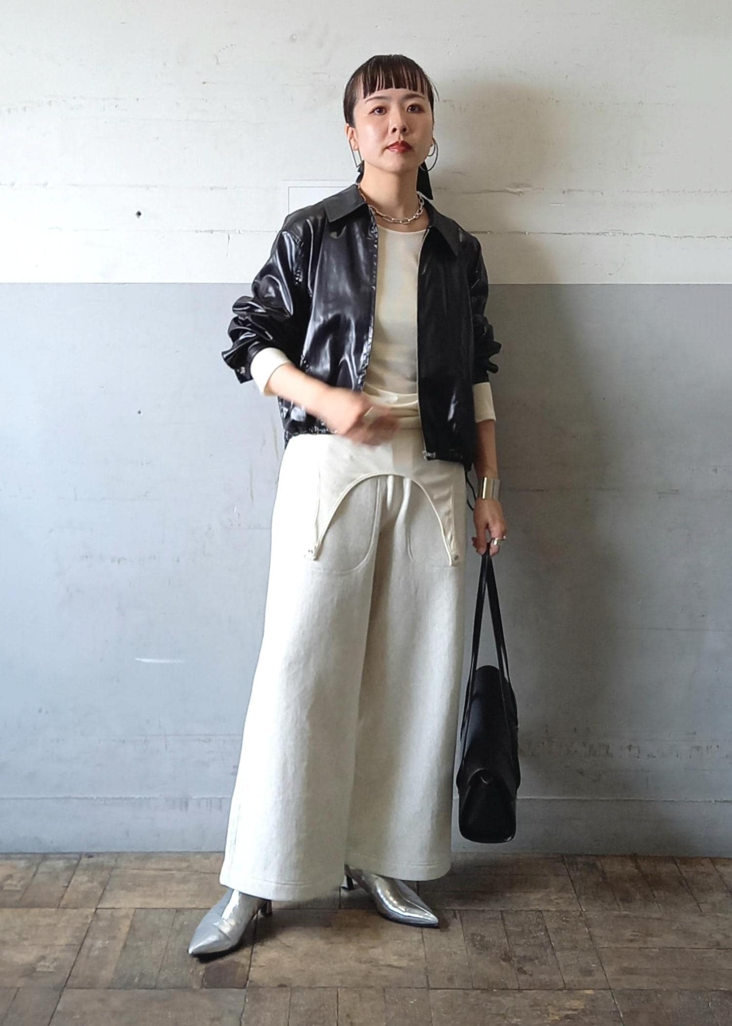 一見レザーに見えるサテンブルゾンと合わせました♡