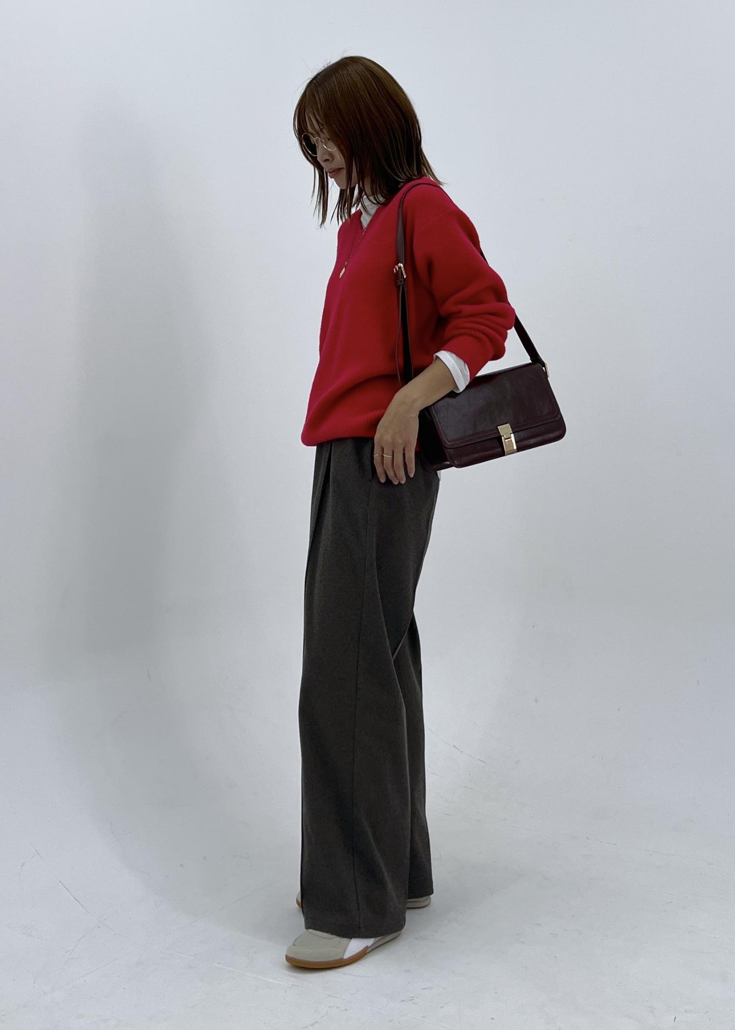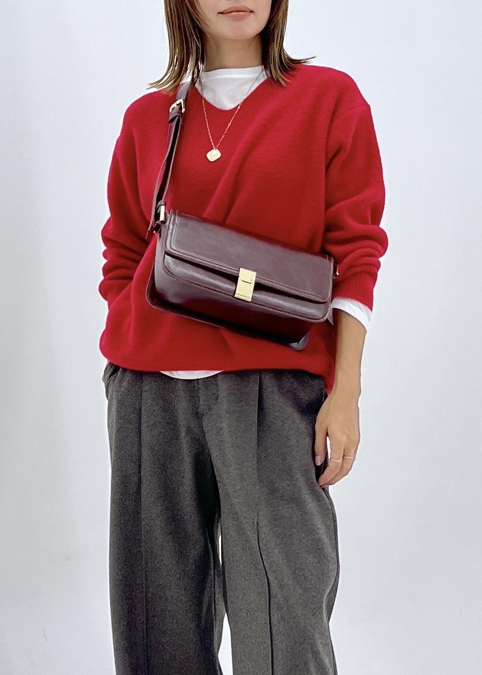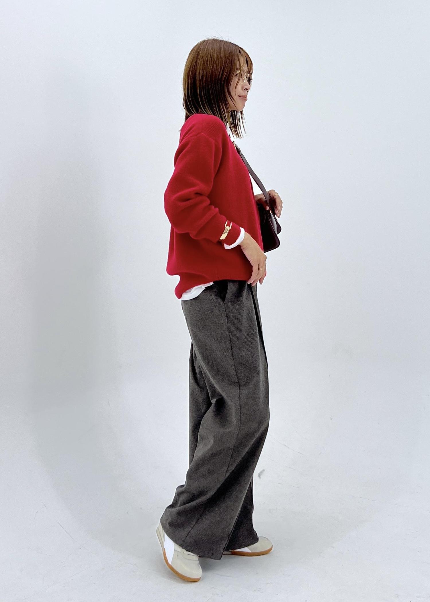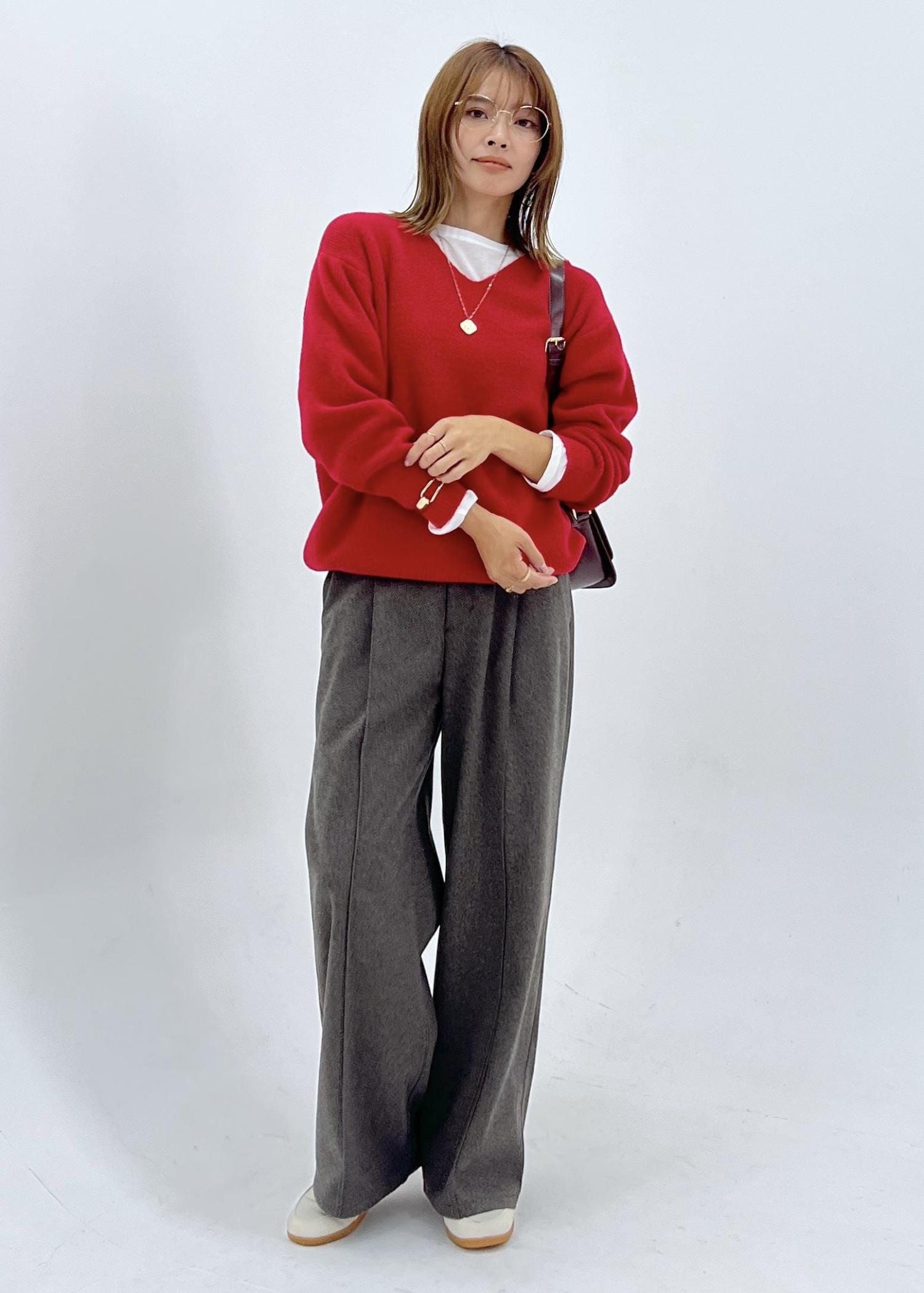 目を引く赤のニットは、シアートップスを重ねて秋冬コーデに。