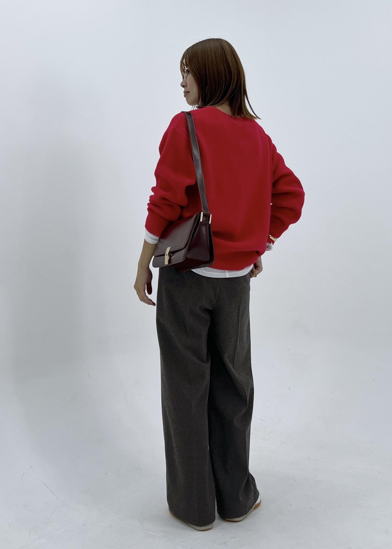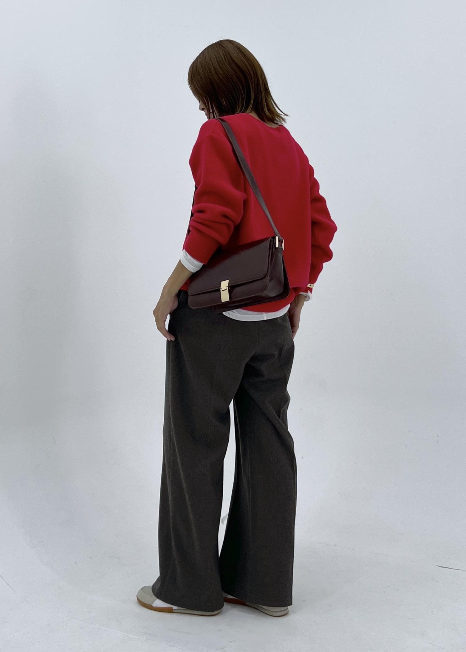 ブラウンのワイドパンツを合わせて大人カジュアルなスタイリングにしました。