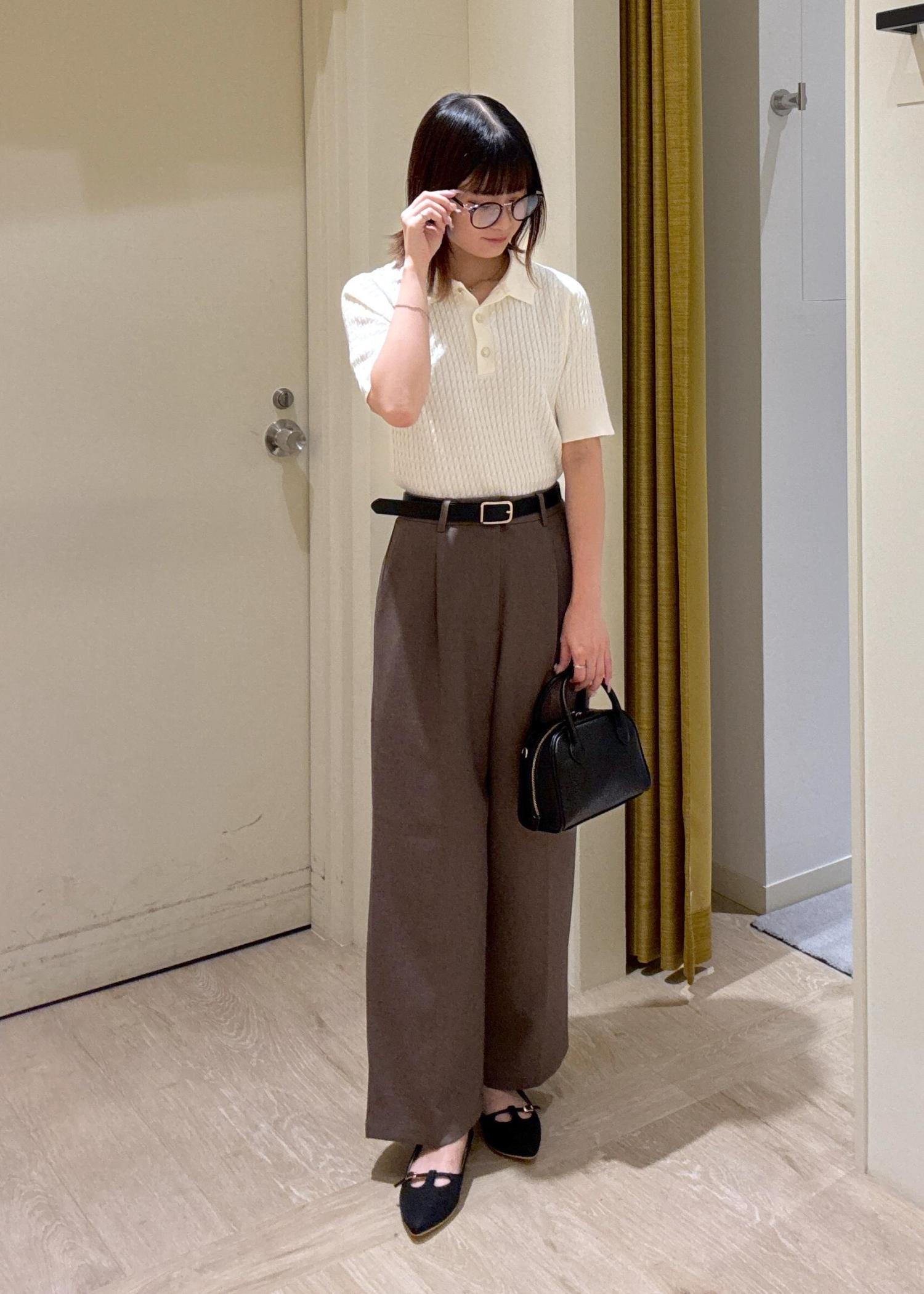 トップスを明るい色で合わせ重たくなりすぎないようにしました。パンツのブラウンで秋っぽさを感じられるシンプルなコーデ◎