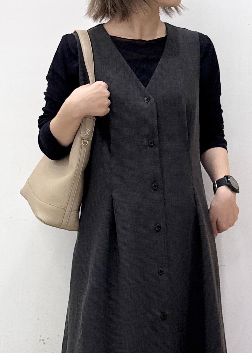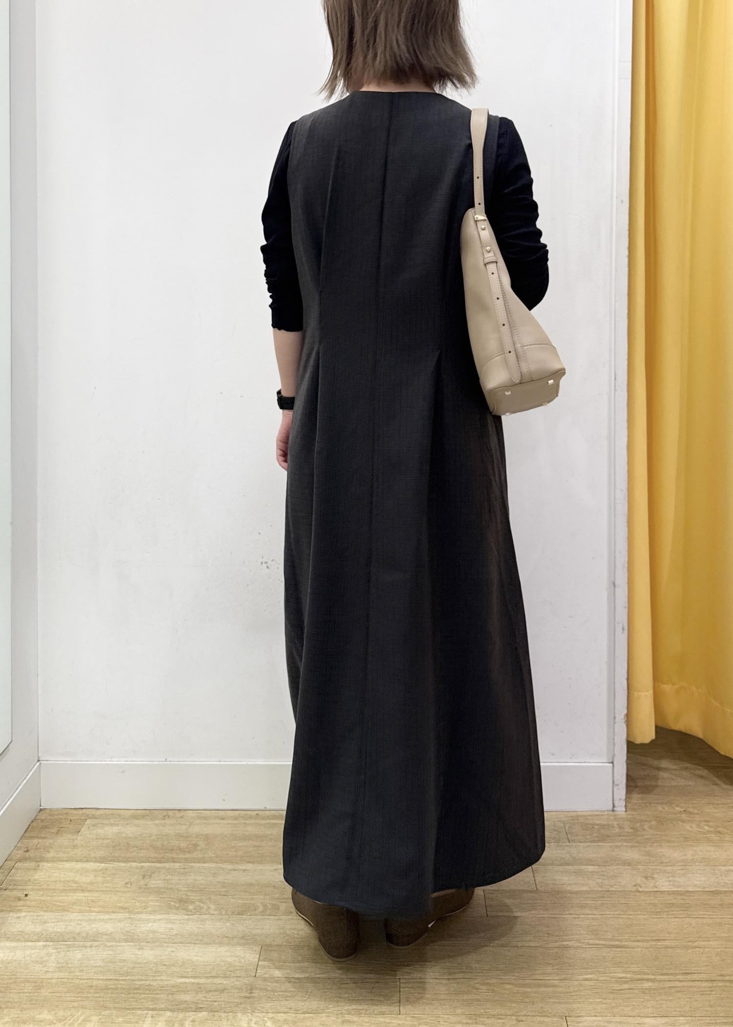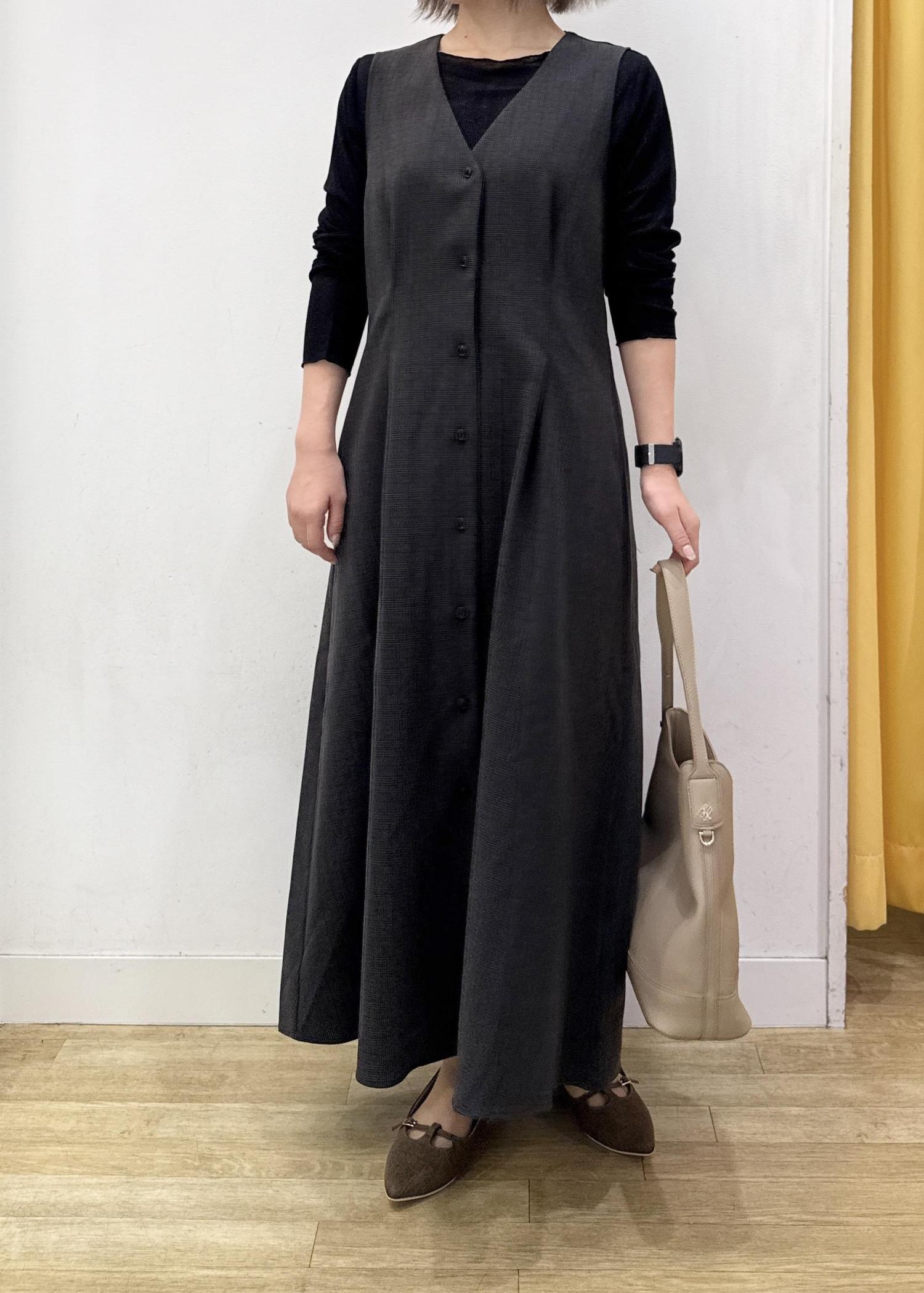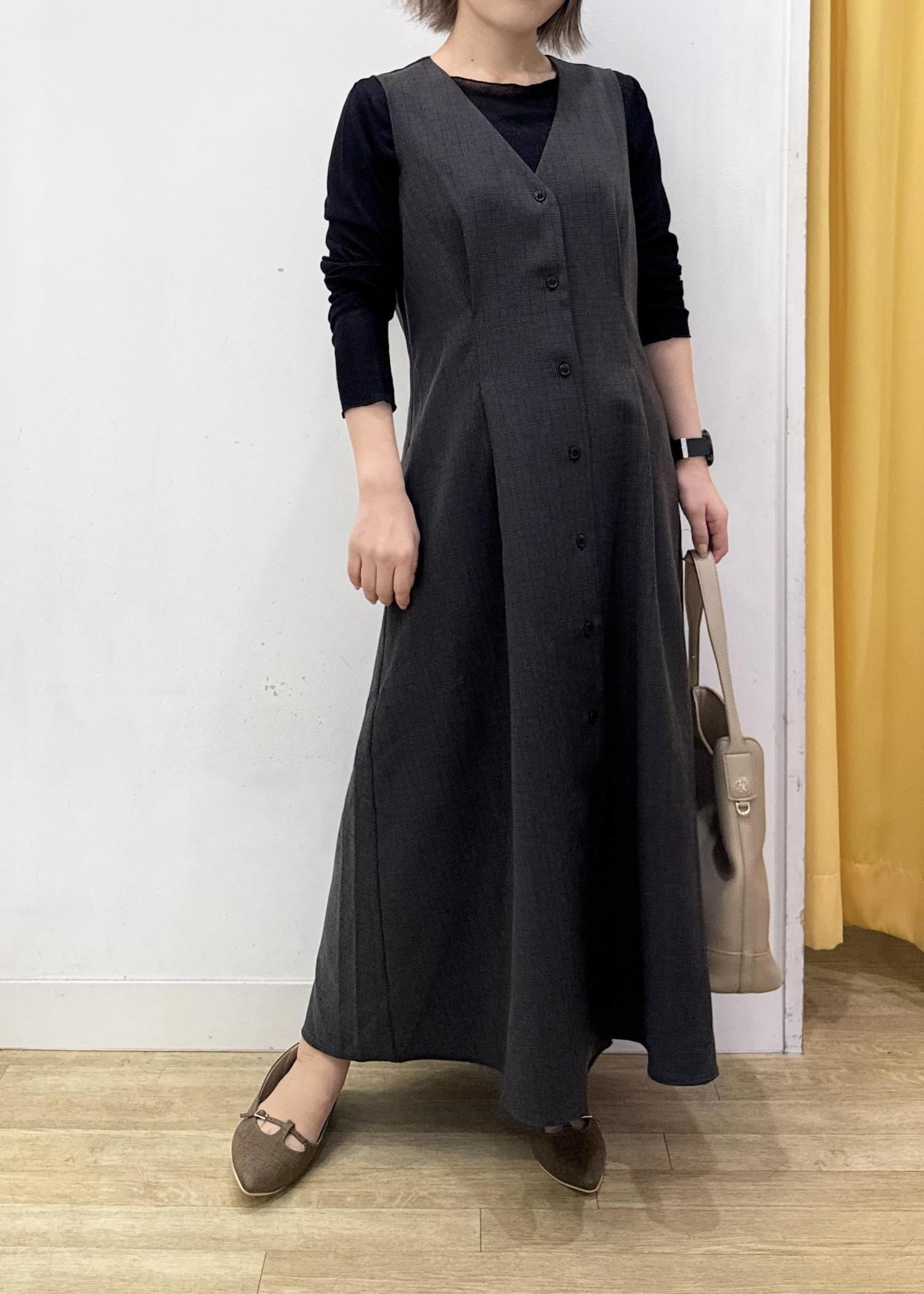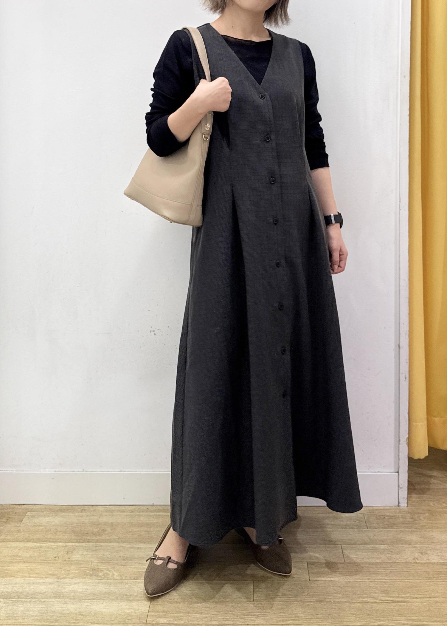 ジャンパースカートはかわいい印象ですが、ブラックカラーでまとめてシックな雰囲気に!