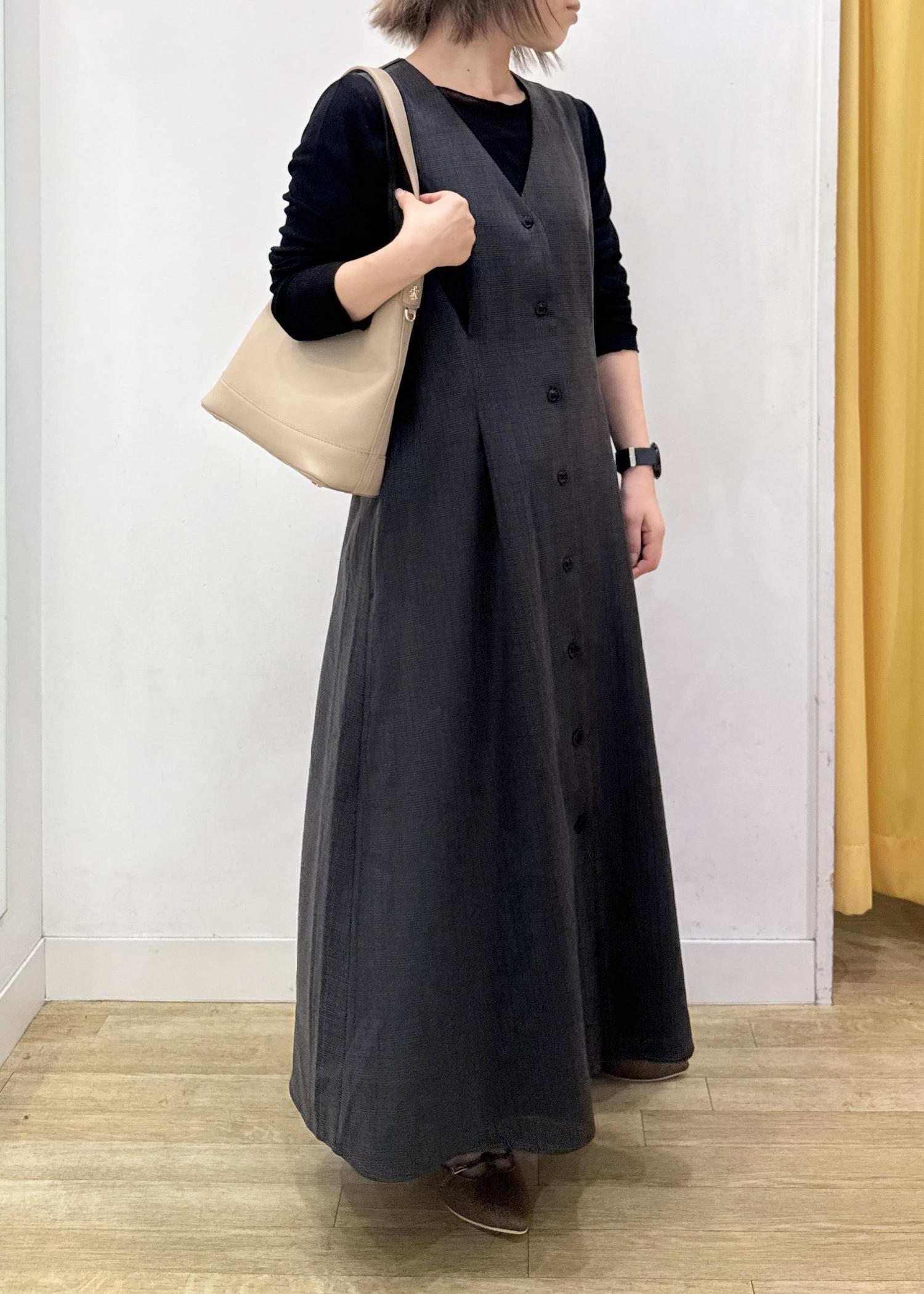 着丈は足首が見えるぐらいのロング丈ですが、Vネックデザインでスッキリとした印象で着られました。 -