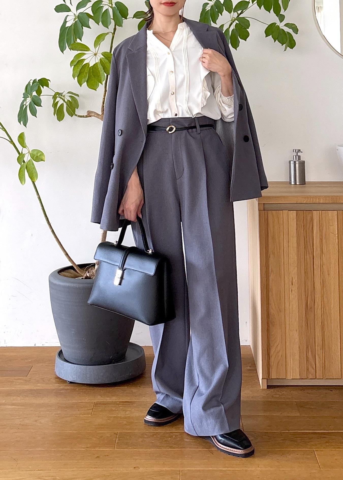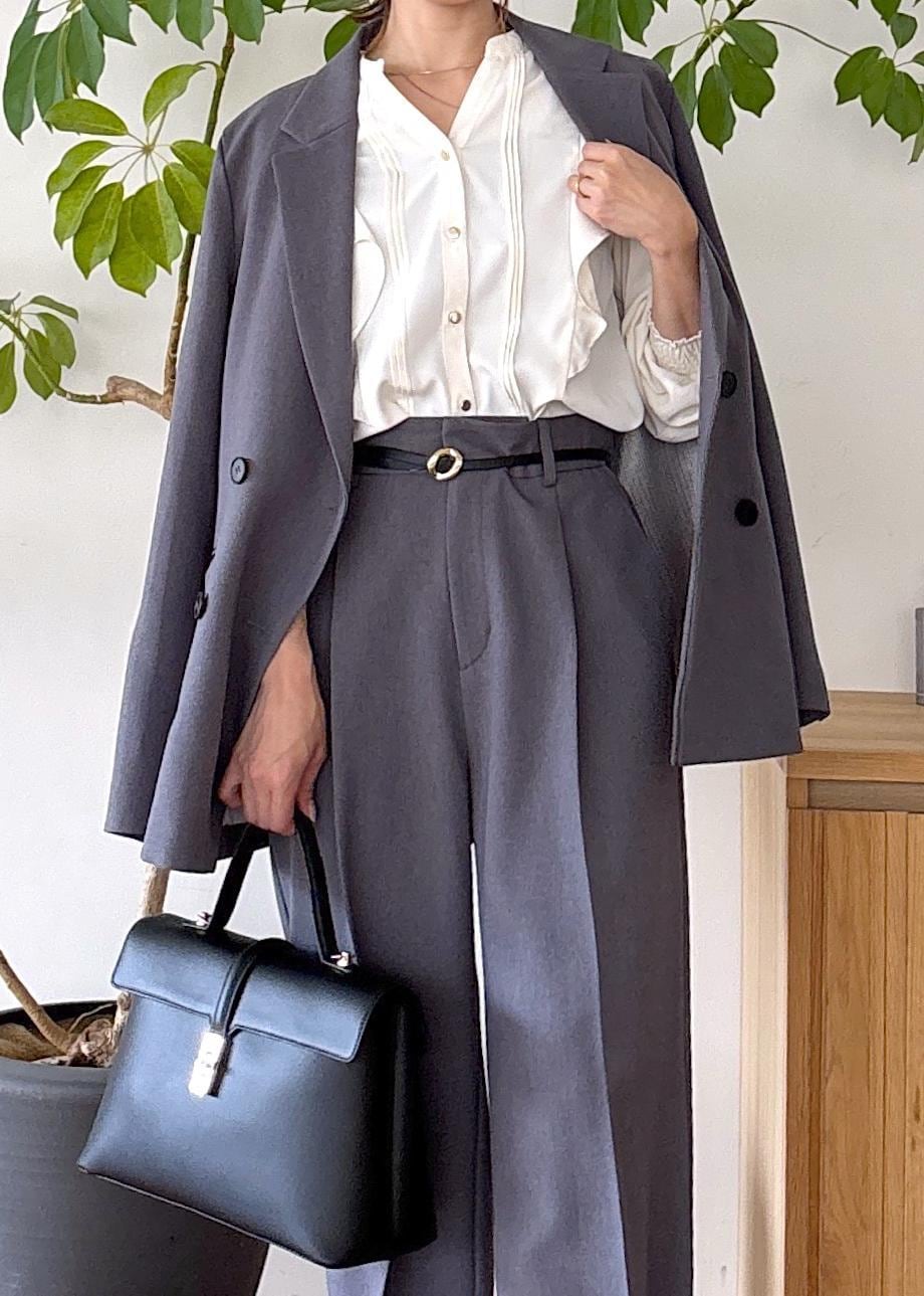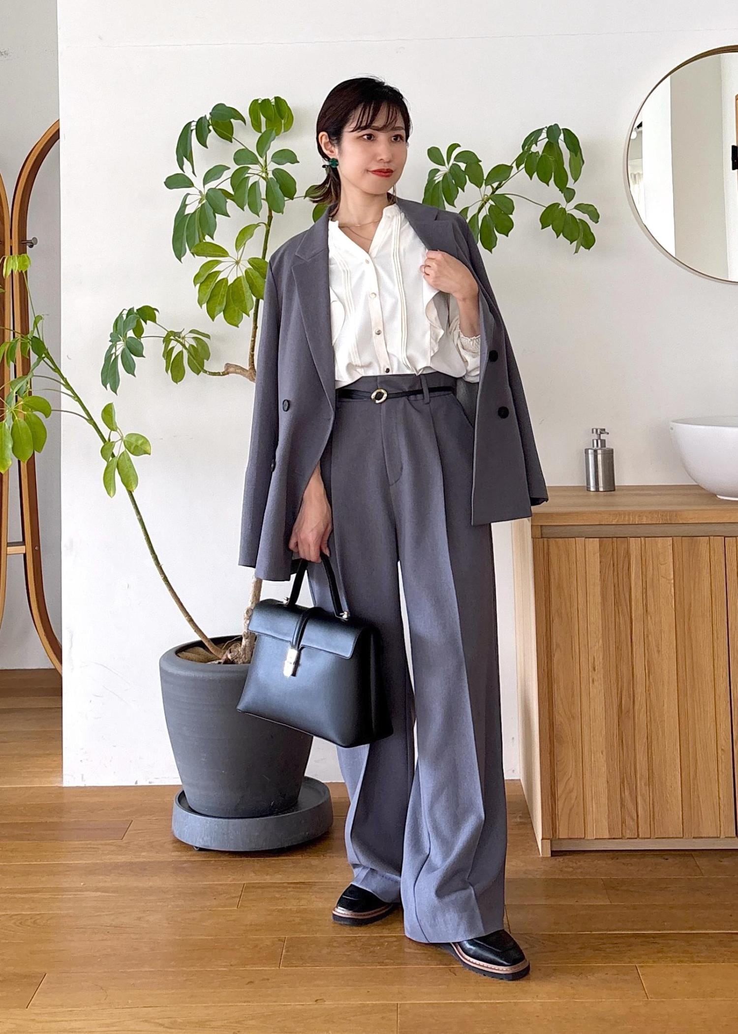 秋服どうしようと悩み出す時期にオススメの、毎シーズン大人気、美easyシリーズ秋冬のセットアップ♪グレーはキチンと感、品のある印象でお仕事スタイルにぴったりです。今回は白のフリルブラウスで女性らしさをプラスしました。グレーのセットアップは買い足しから手持ちまで合わせやすいので、揃えておくととても便利です。秋にオススメのオフィスカジュアルコーデ。