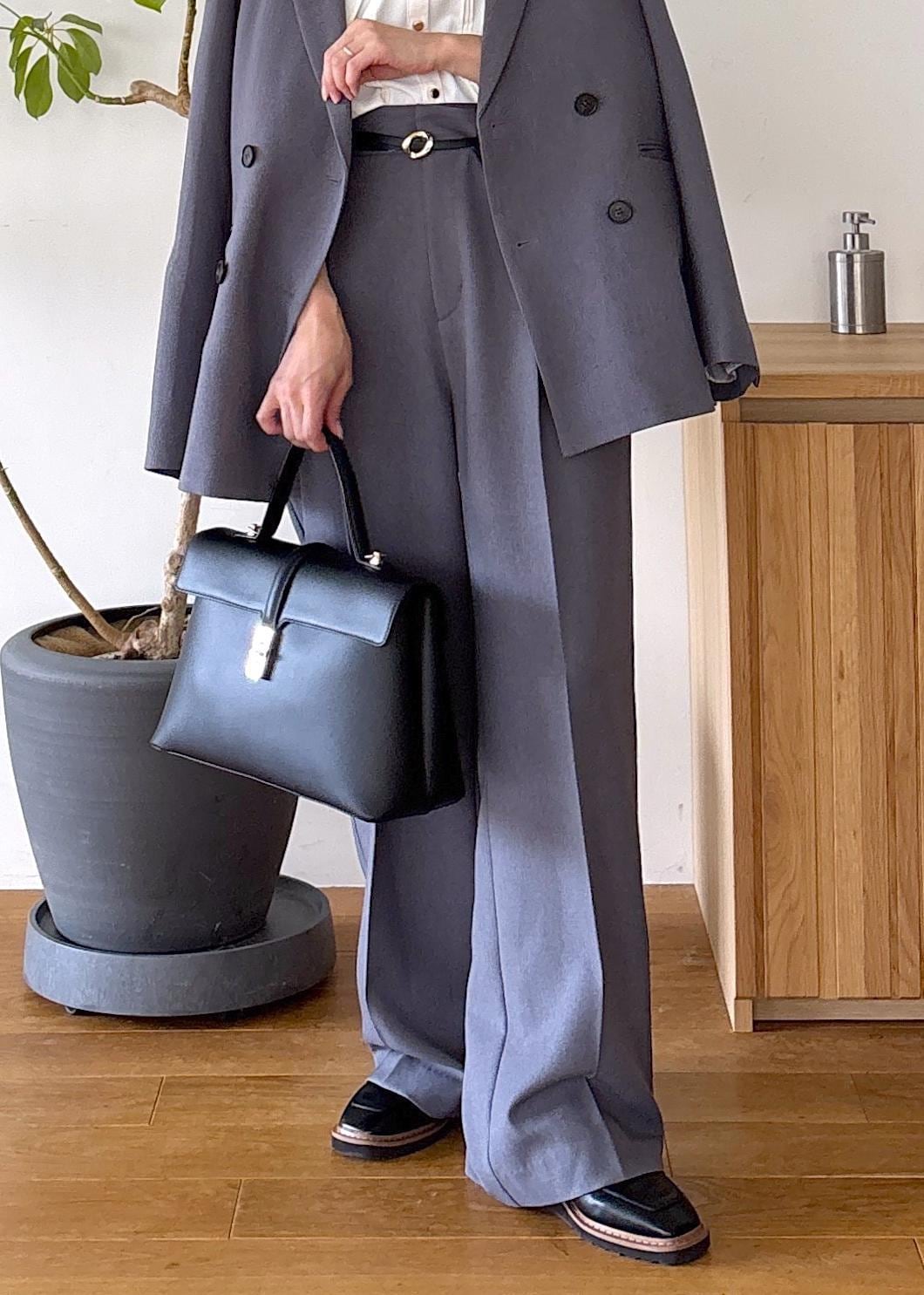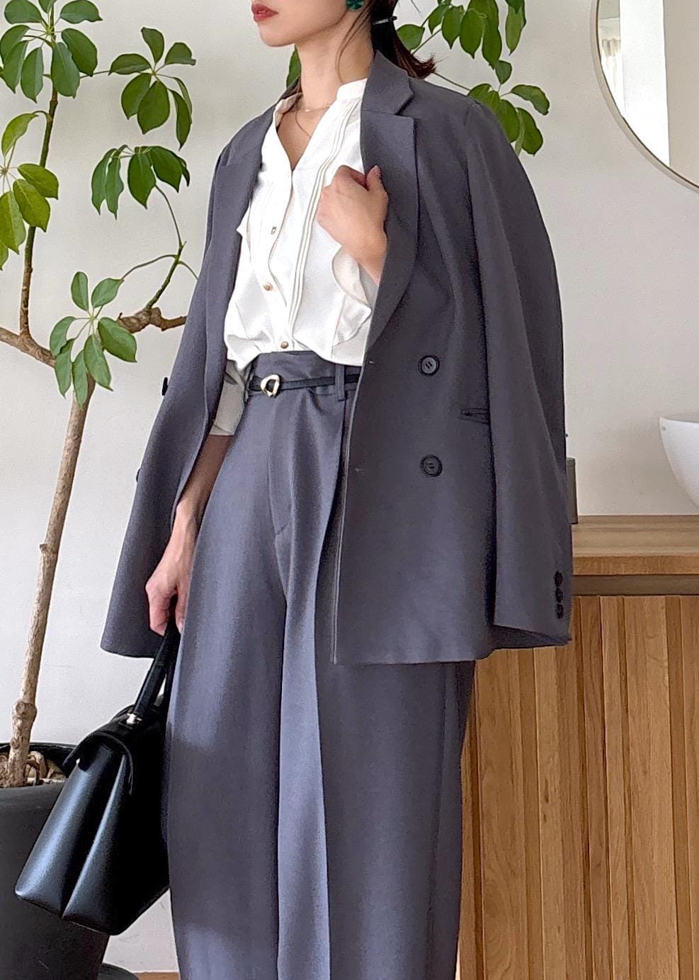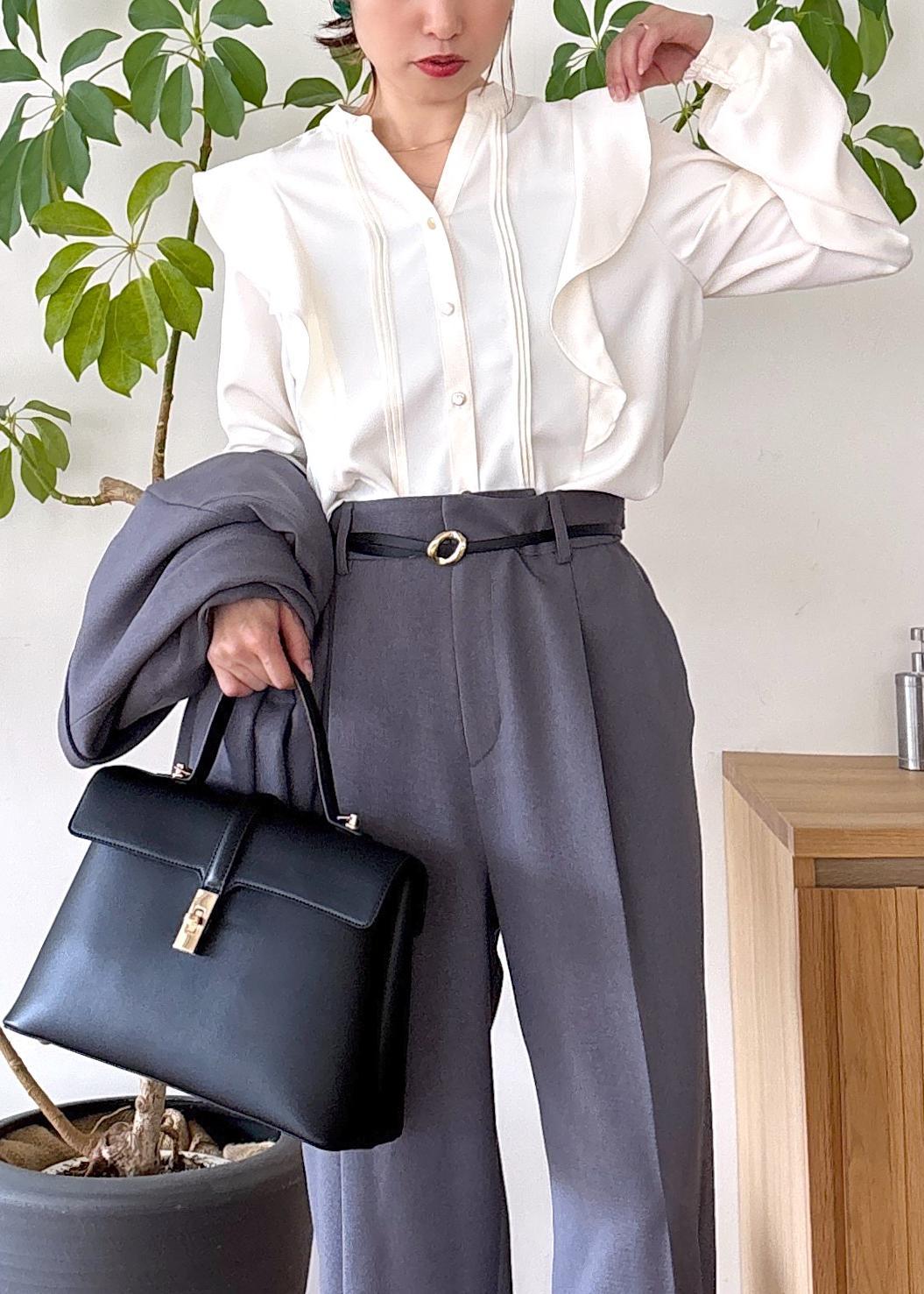 秋服どうしようと悩み出す時期にオススメの、毎シーズン大人気、美easyシリーズ秋冬のセットアップ♪グレーはキチンと感、品のある印象でお仕事スタイルにぴったりです。今回は白のフリルブラウスで女性らしさをプラスしました。グレーのセットアップは買い足しから手持ちまで合わせやすいので、揃えておくととても便利です。秋にオススメのオフィスカジュアルコーデ。