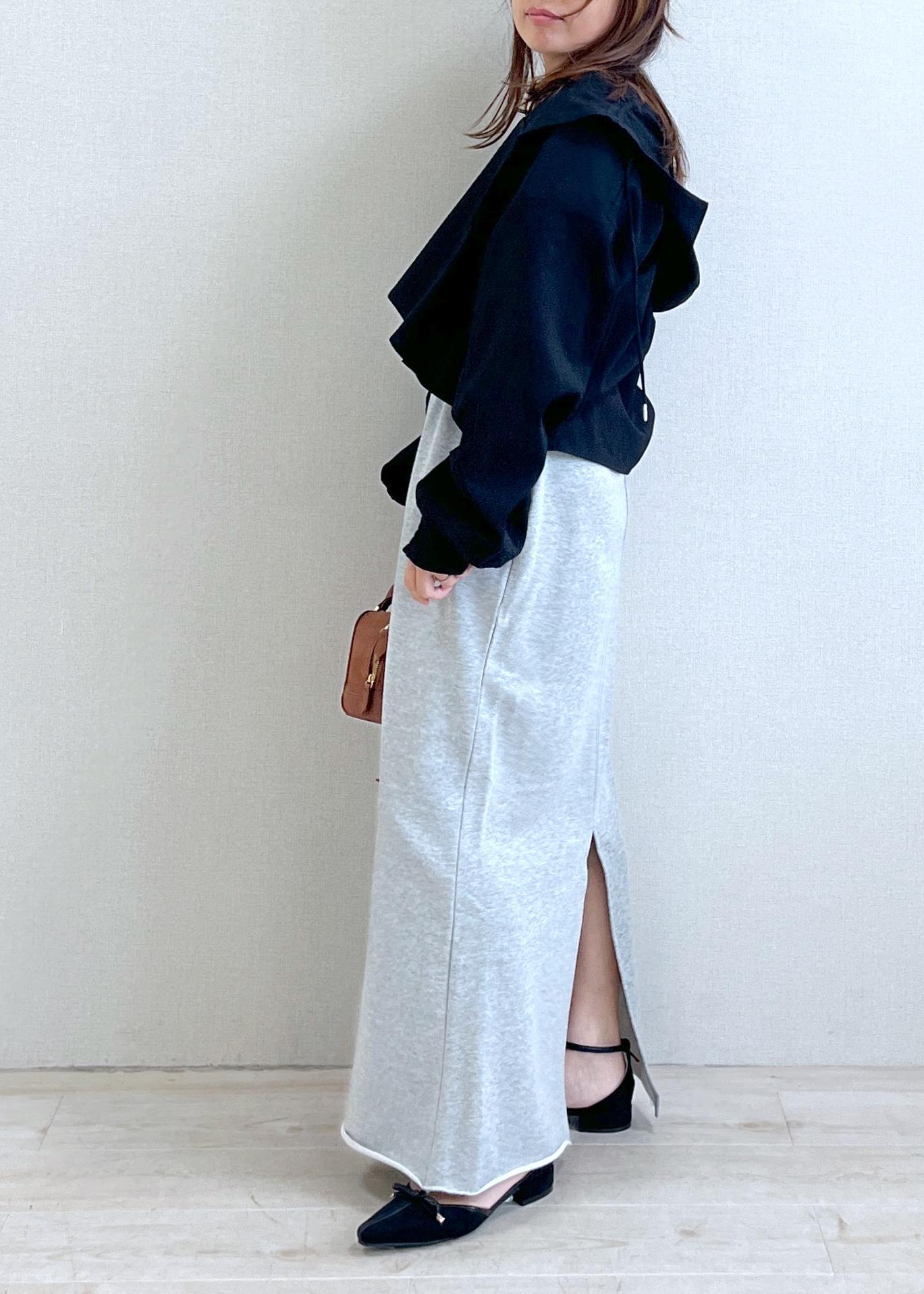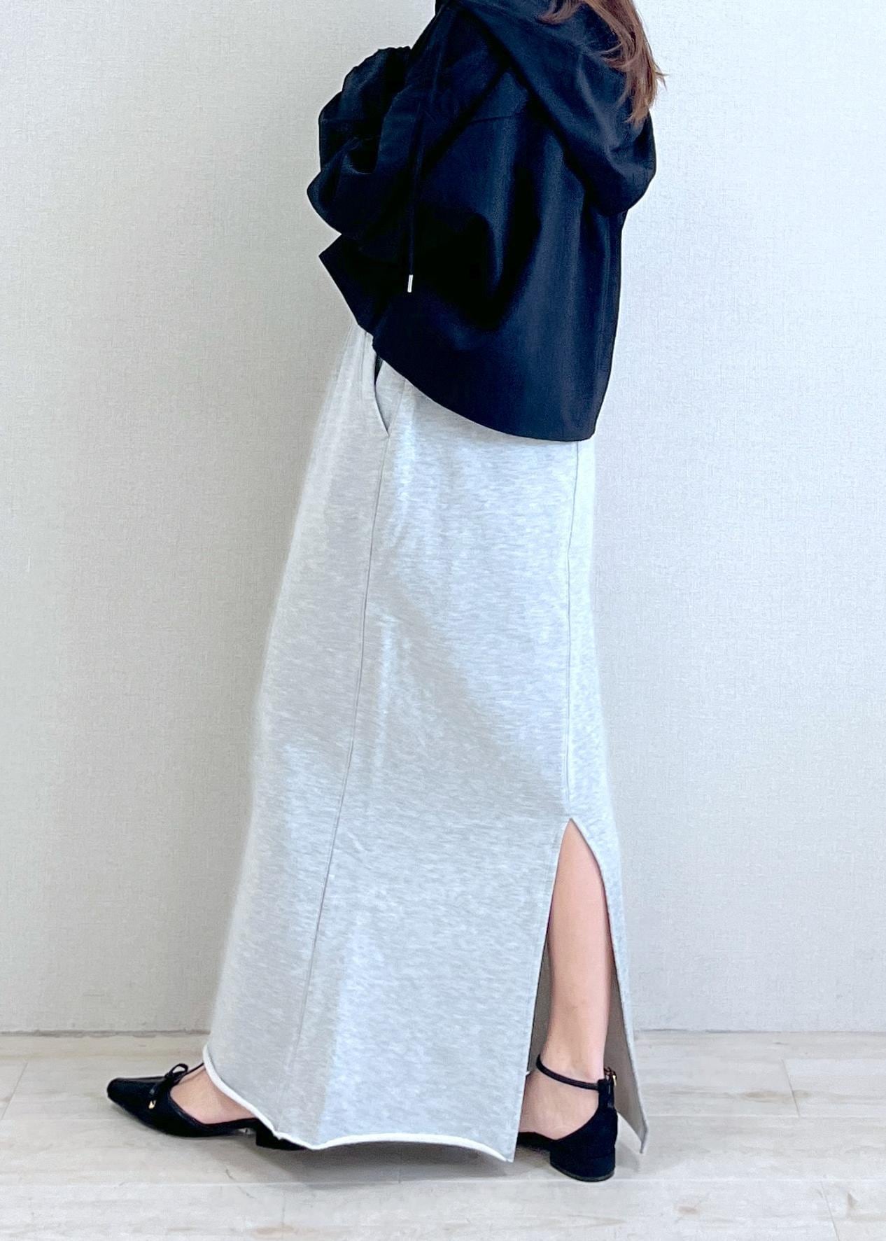 VISミニ裏毛ナロースカートライトグレー / F¥5,489レビュー152cmでくるぶしにかかるくらいのロング丈。ウエストゴムなので、とっても楽ちん!ただ緩めサイズだったので腰で着用するイメージです。ペタンコ靴でも床にはつきませんでした。カジュアルに着るもよし!あえてキレイめアイテムとのMIXコーデもお勧めです。