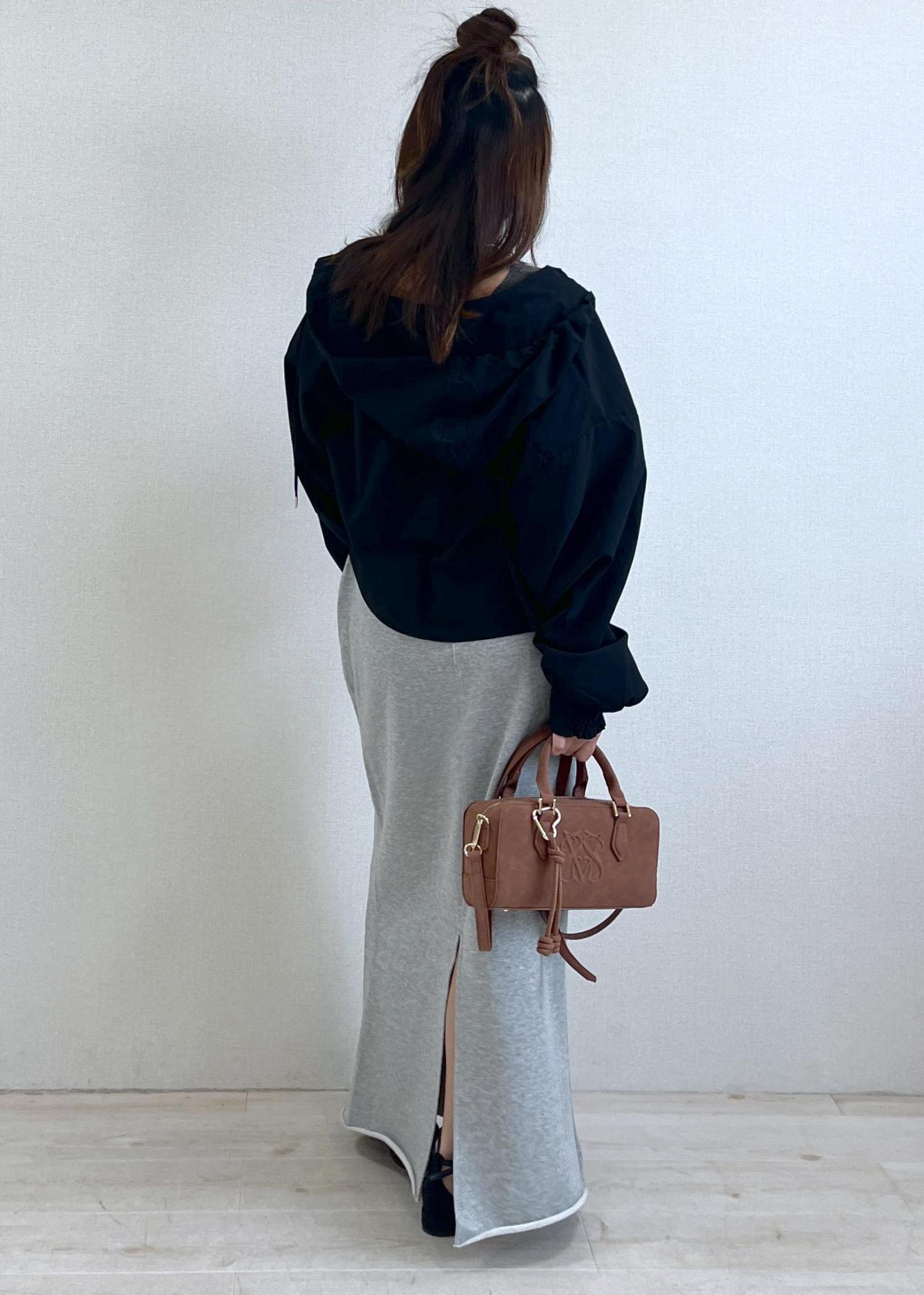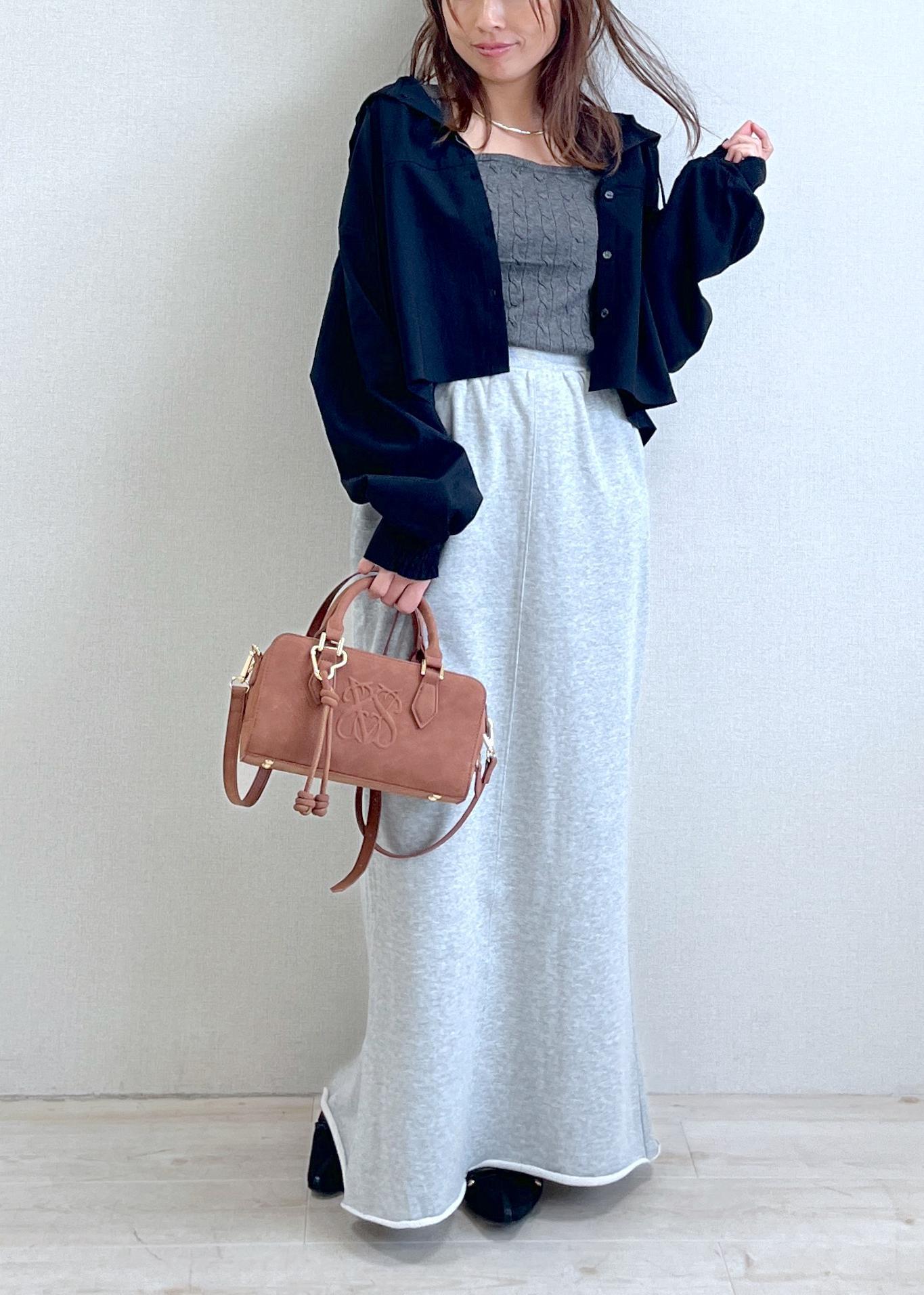 ゆったり羽織れるクロップドシャツに、グレーのロングスカートを合わせたリラックスカジュアルコーデ。