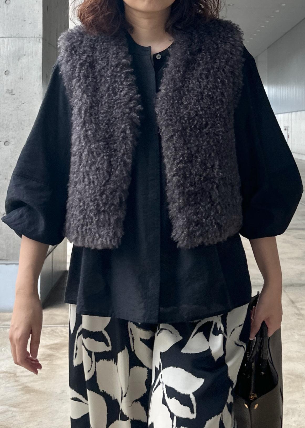 今年トレンドのフェイクファージレです。ショート丈のVネックで袖に分量のあるブラウスでももたつきにくい様にアームが広めに設定されています。