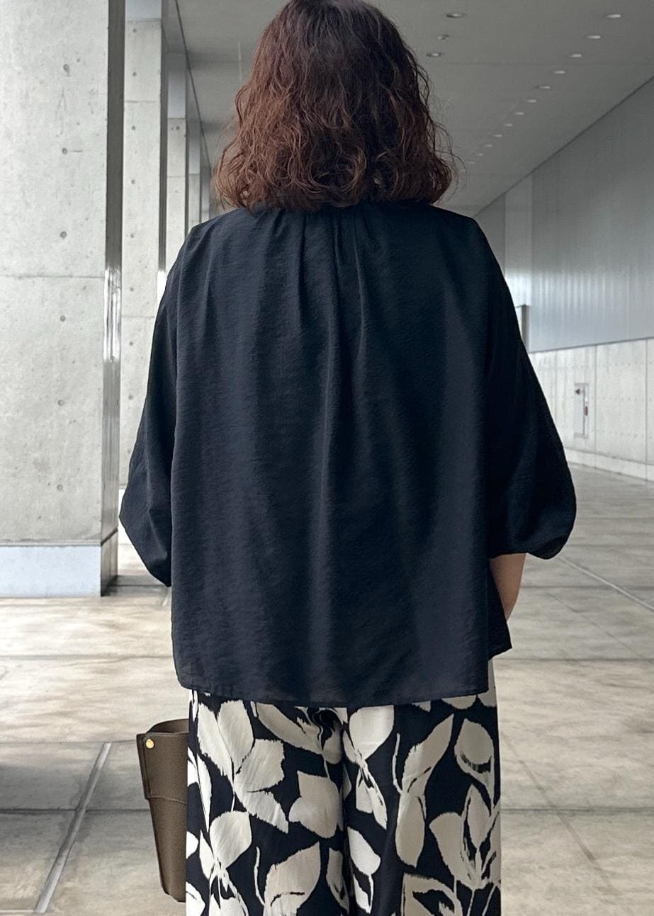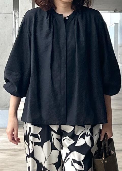 スタンドカラーで袖にボリュームがあり、インでもアウトでも決まるデザインなので、ボリュームがありながらもボトムを選ばない1枚あると便利なブラウスです。 -