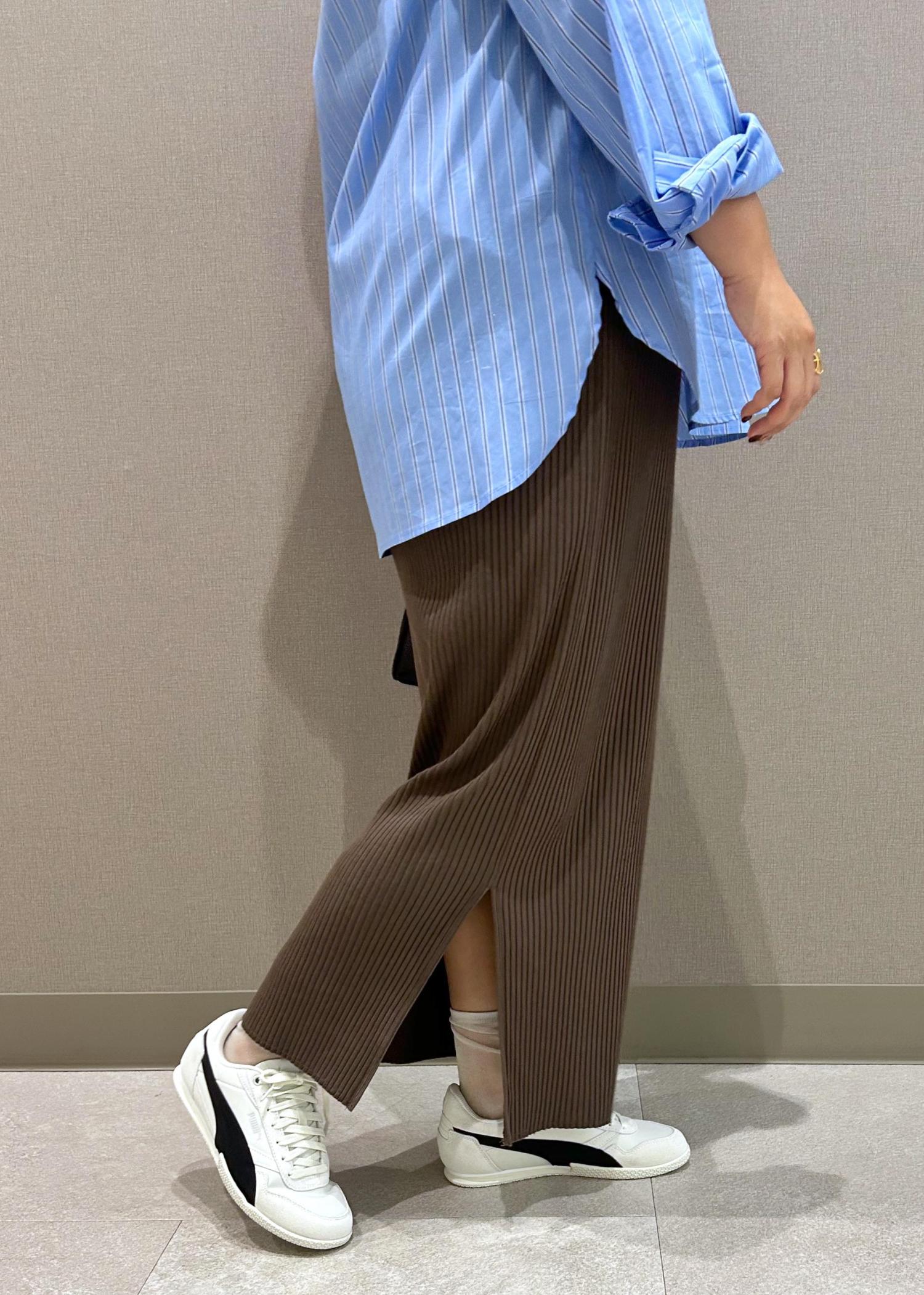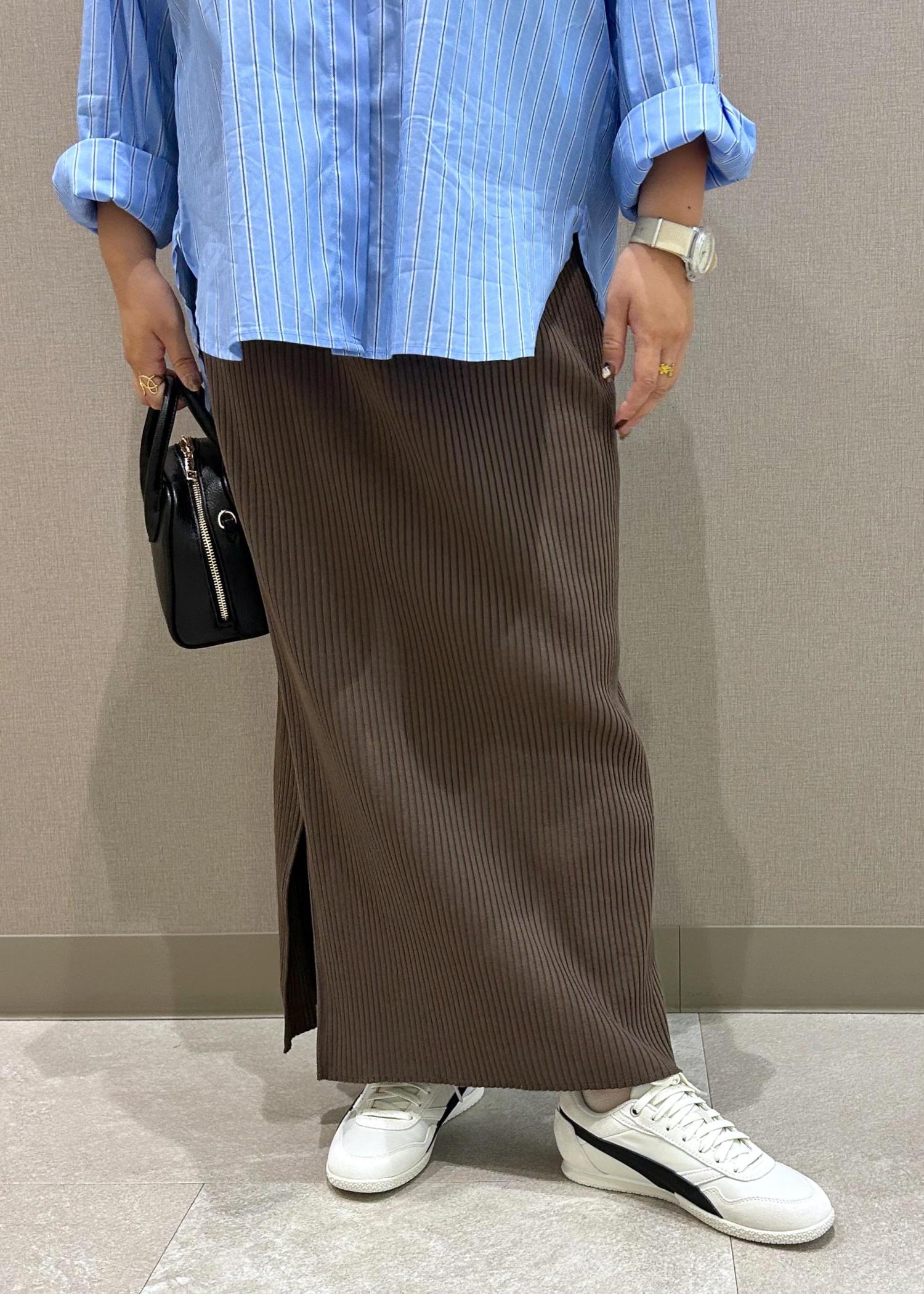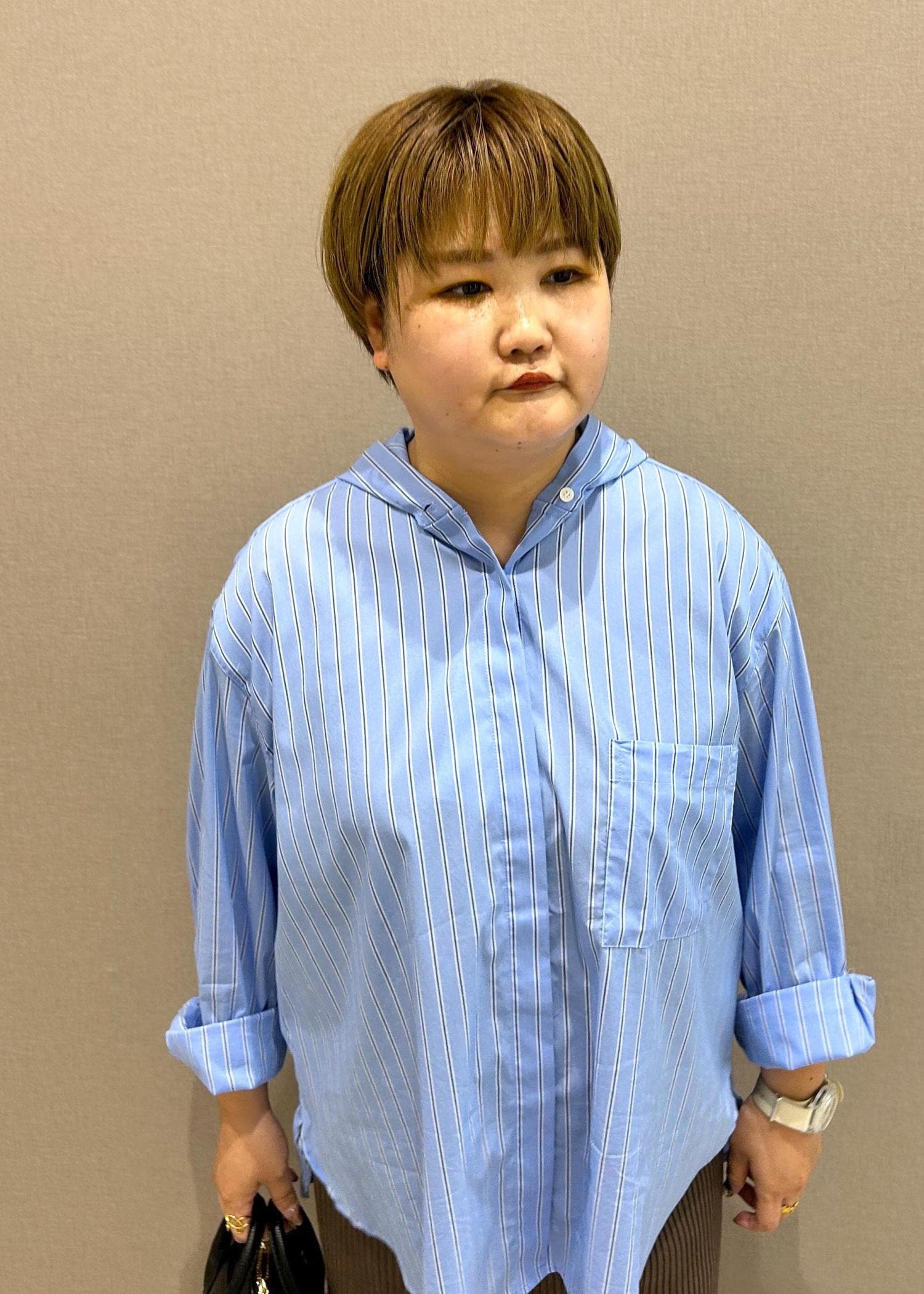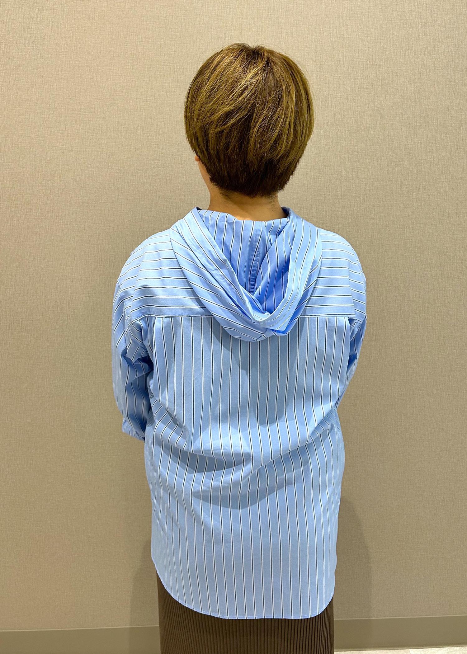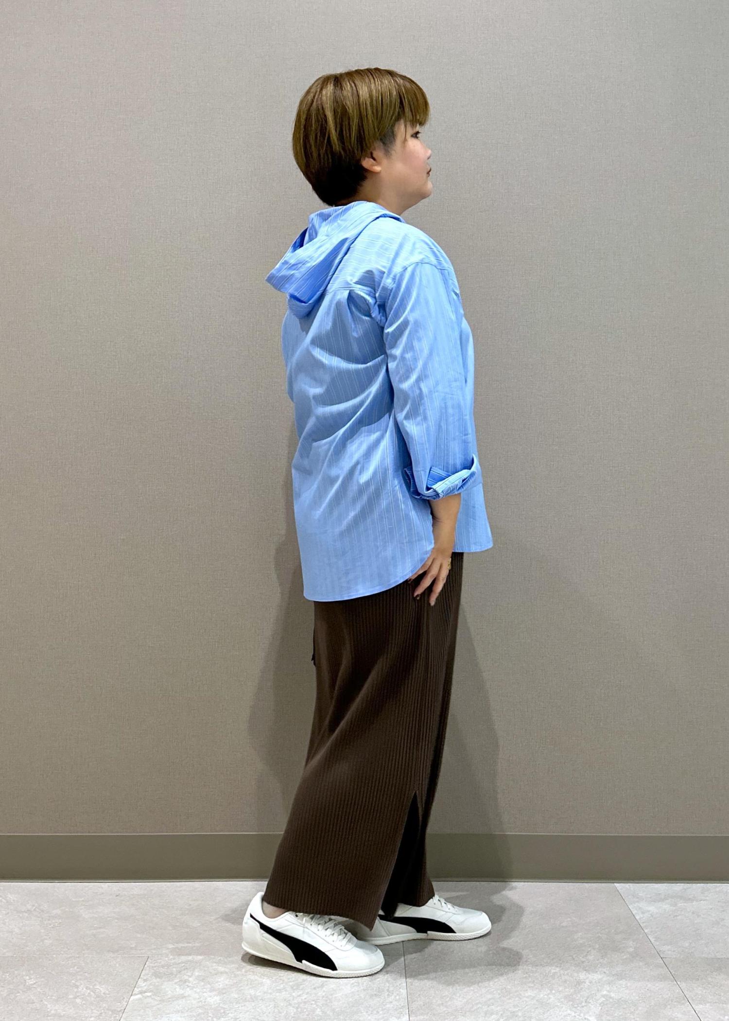 シャツフーディーにIラインスカートを合わせた初秋の大人カジュアルコーデです。
