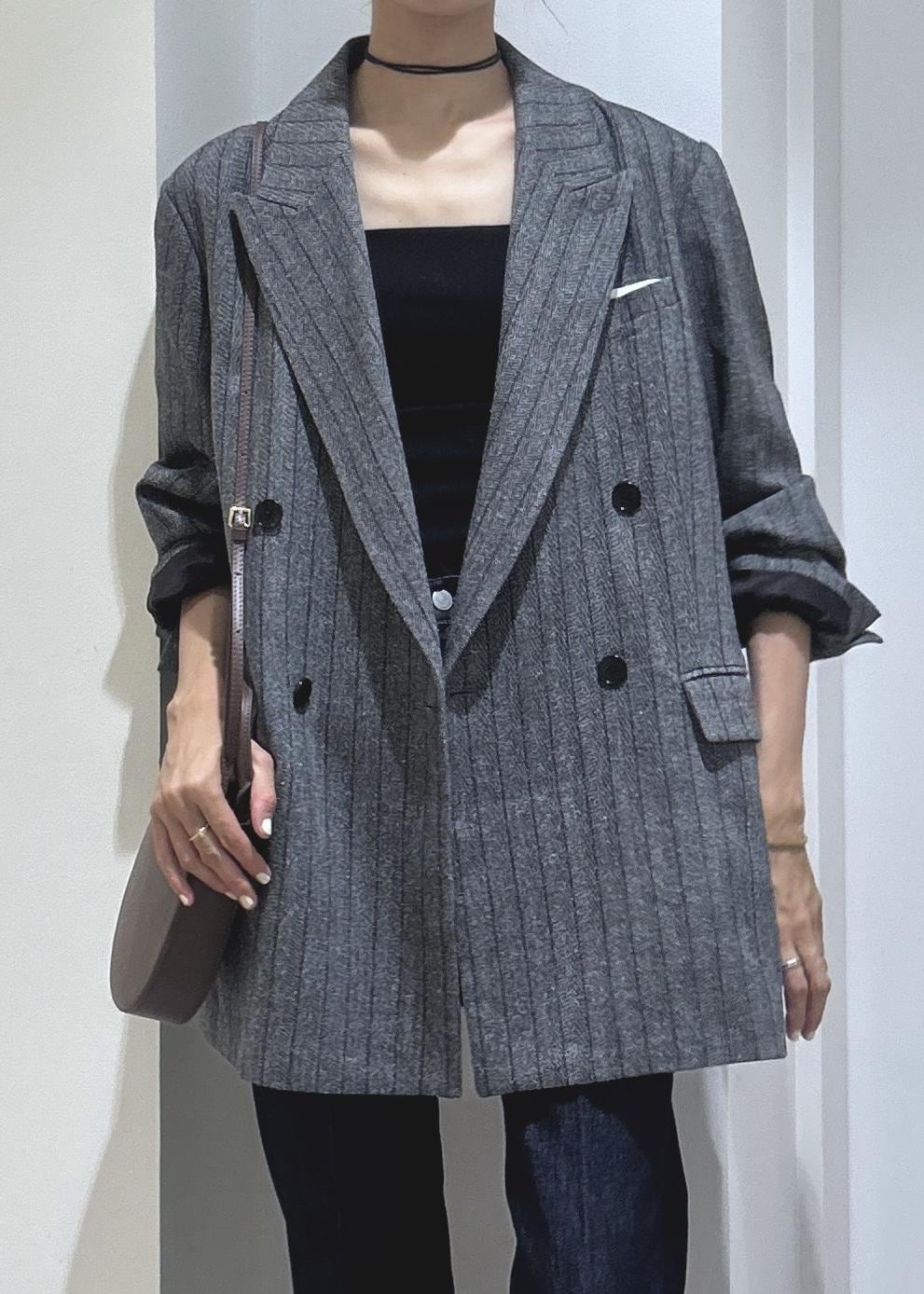 ADAM ET ROPÉ FEMMEダブルブレストツイード&チェックジャケットグレー / 38¥40,700レビュー170cmでヒップがちょうど隠れる丈感。