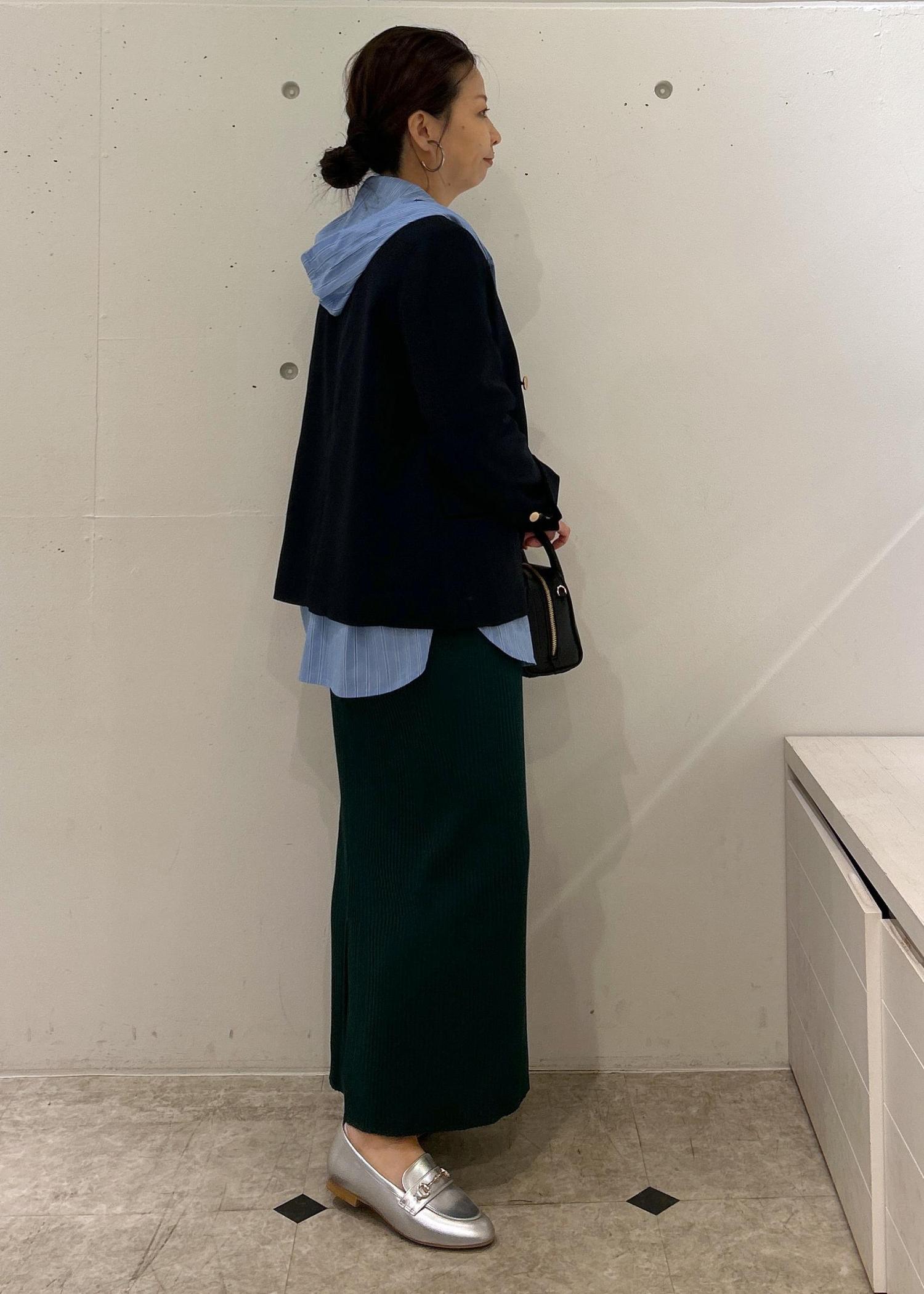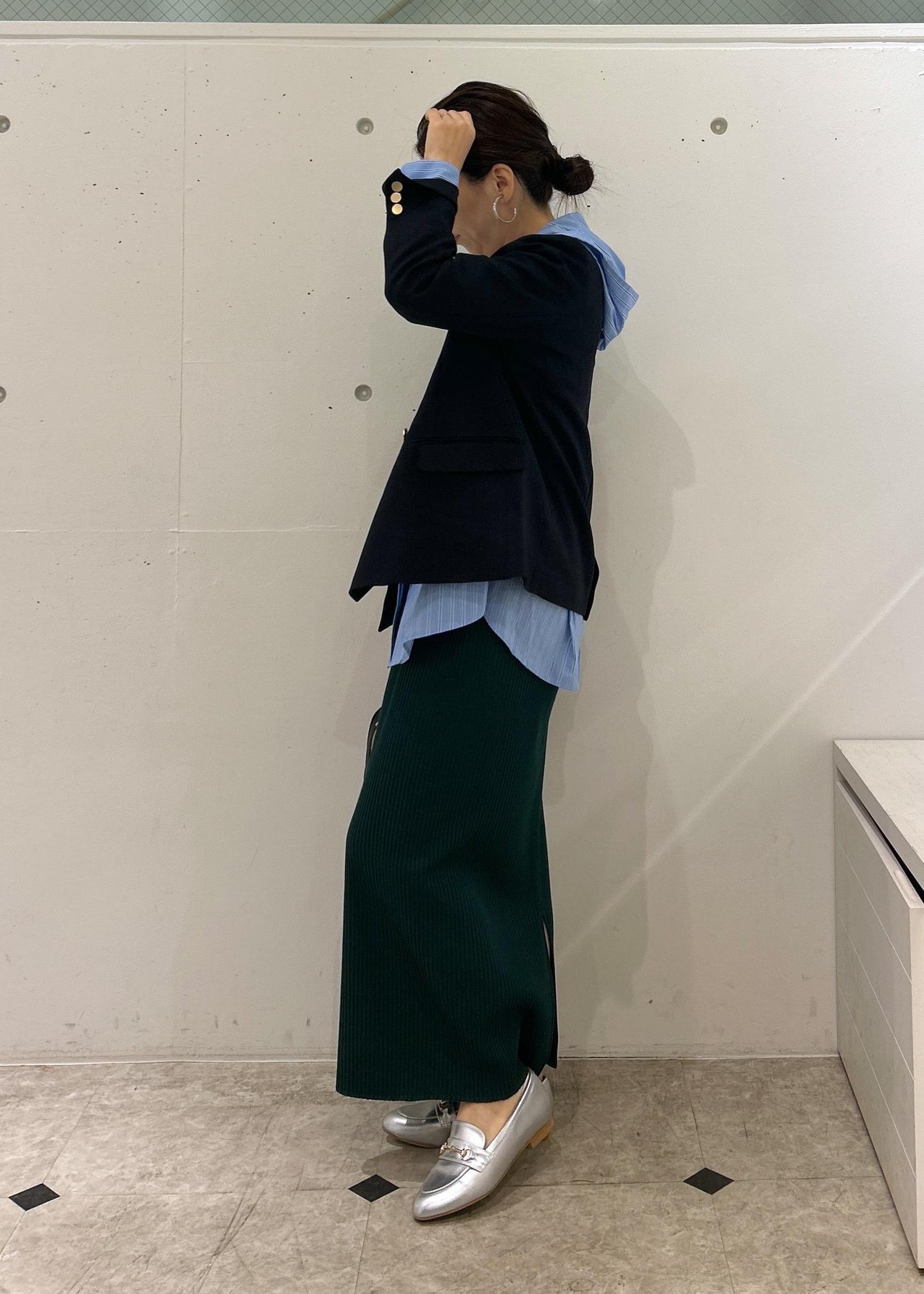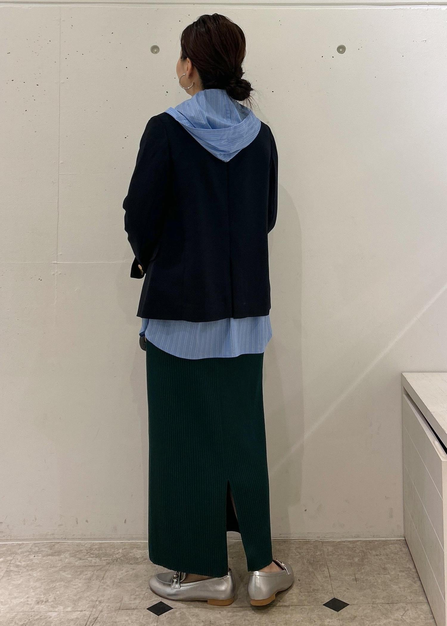 オフィスカジュアルでも着られるくらいのスタイリングで合わせてみました。ジャケットとフードシャツを合わせることで抜け感が出るので、かっちりしすぎないお仕事スタイルがお好みの方におすすめです。