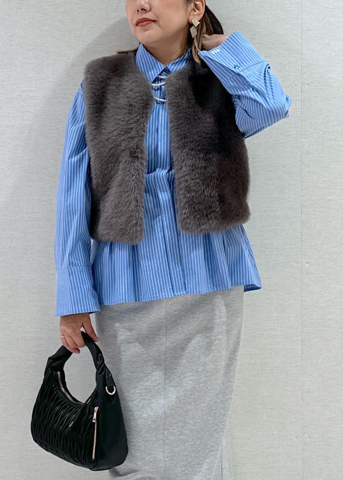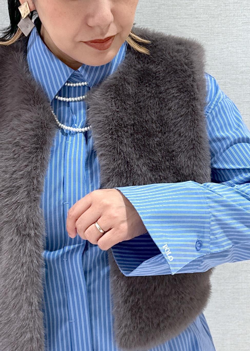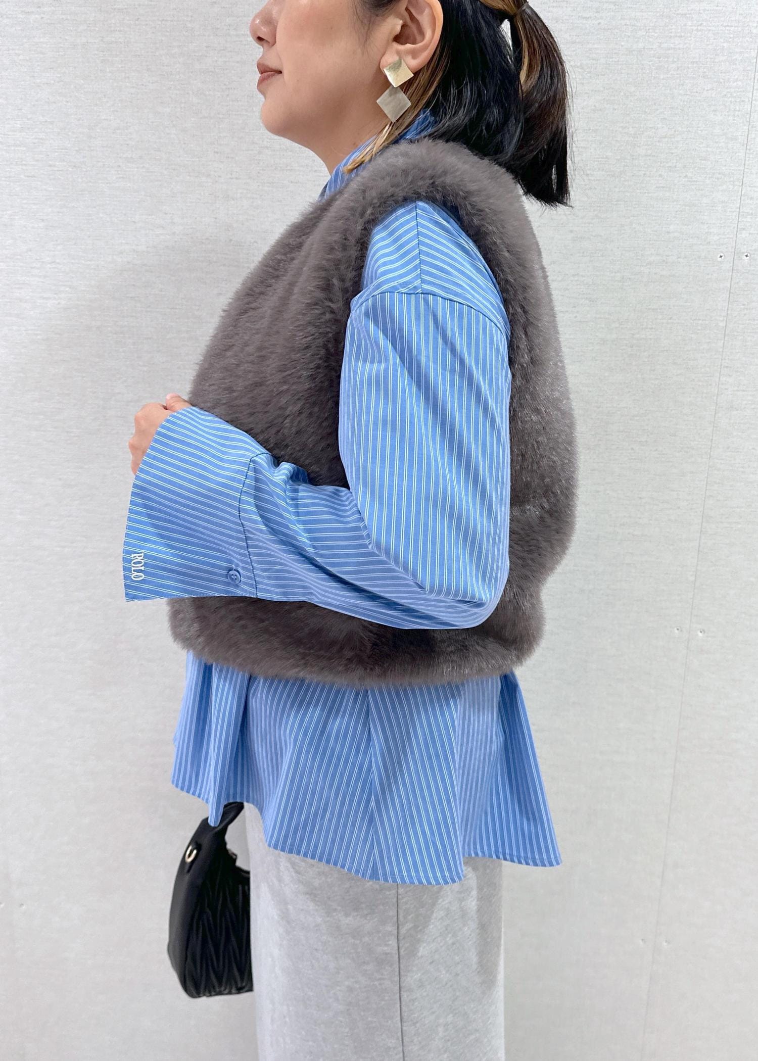 VISアソートファーショートベストグレー系 / F¥8,899レビュー着丈は短めでシャツ、ワンピース、ハイウエストのボトムに合わせやすい。