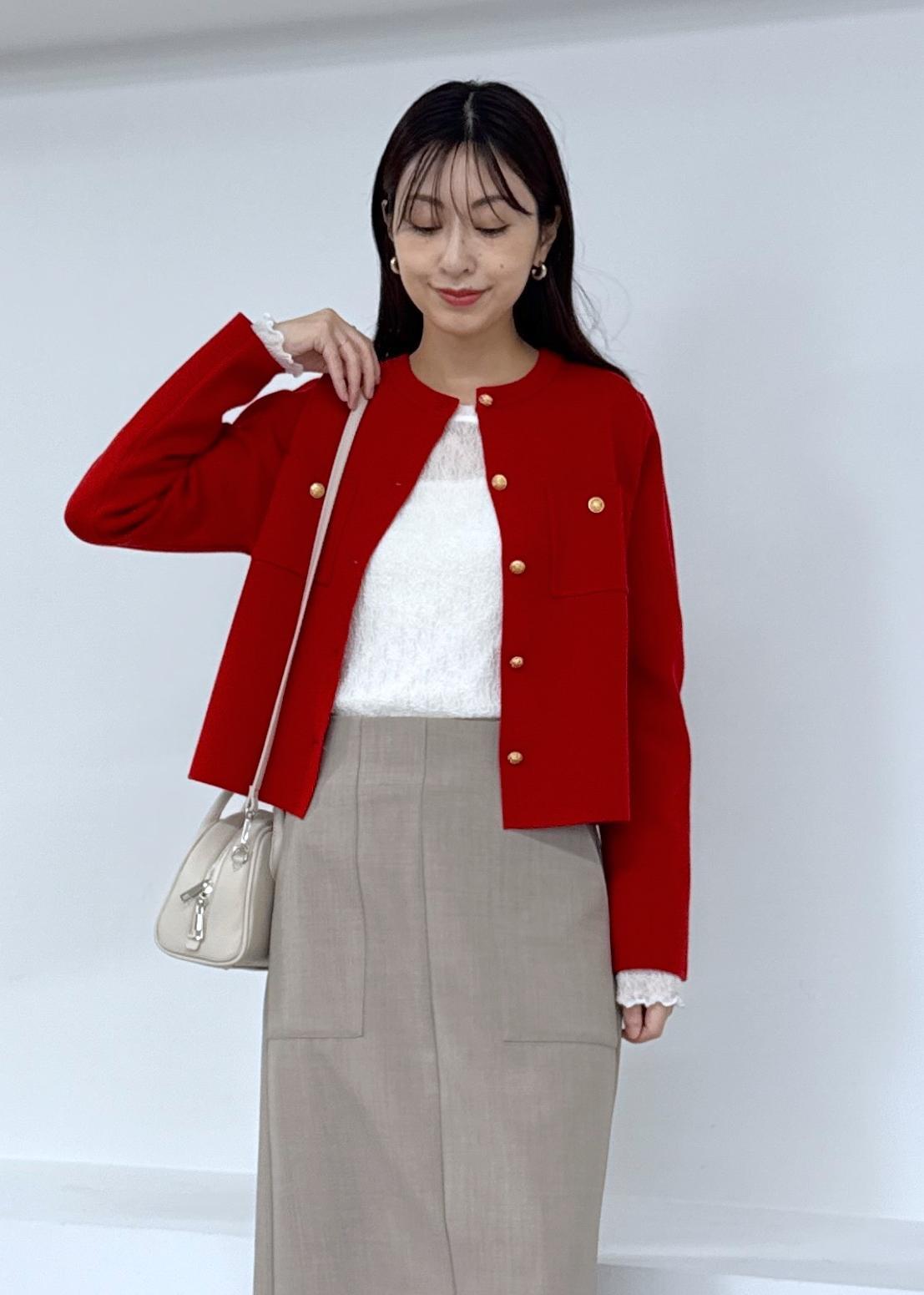 程よい厚みがあるのでインナーやボディラインが響きづらいです。デザイン性があるのでジャケットのような上品な雰囲気に仕上げてくれます。今回はLサイズ着用。腰がしっかりと隠れる着丈。袖は手の甲に掛かる長さです。ちなみにMサイズはボタン1個分短くなります。ウエストに掛かる比較的スッキリとした長さ。デニムパンツやバレエシューズでフレンチシックに合わせるのもお勧めです。