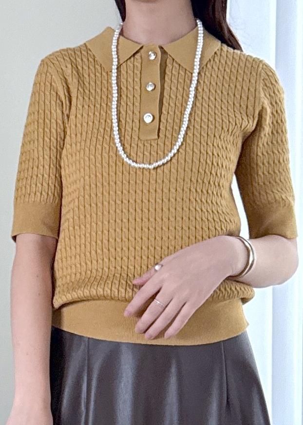 ROPÉ PICNICミニケーブルハーフスリーブニットポロシャツカラシ / 38¥4,994レビュー柔らかなニットでストレッチ性もよく、動きやすいです。ボタンを全て閉じても苦しくない首周り。5分袖なので二の腕カバーにも嬉しい長さ◎アウトで着る場合、腰周りはしっかり隠れる着丈です。