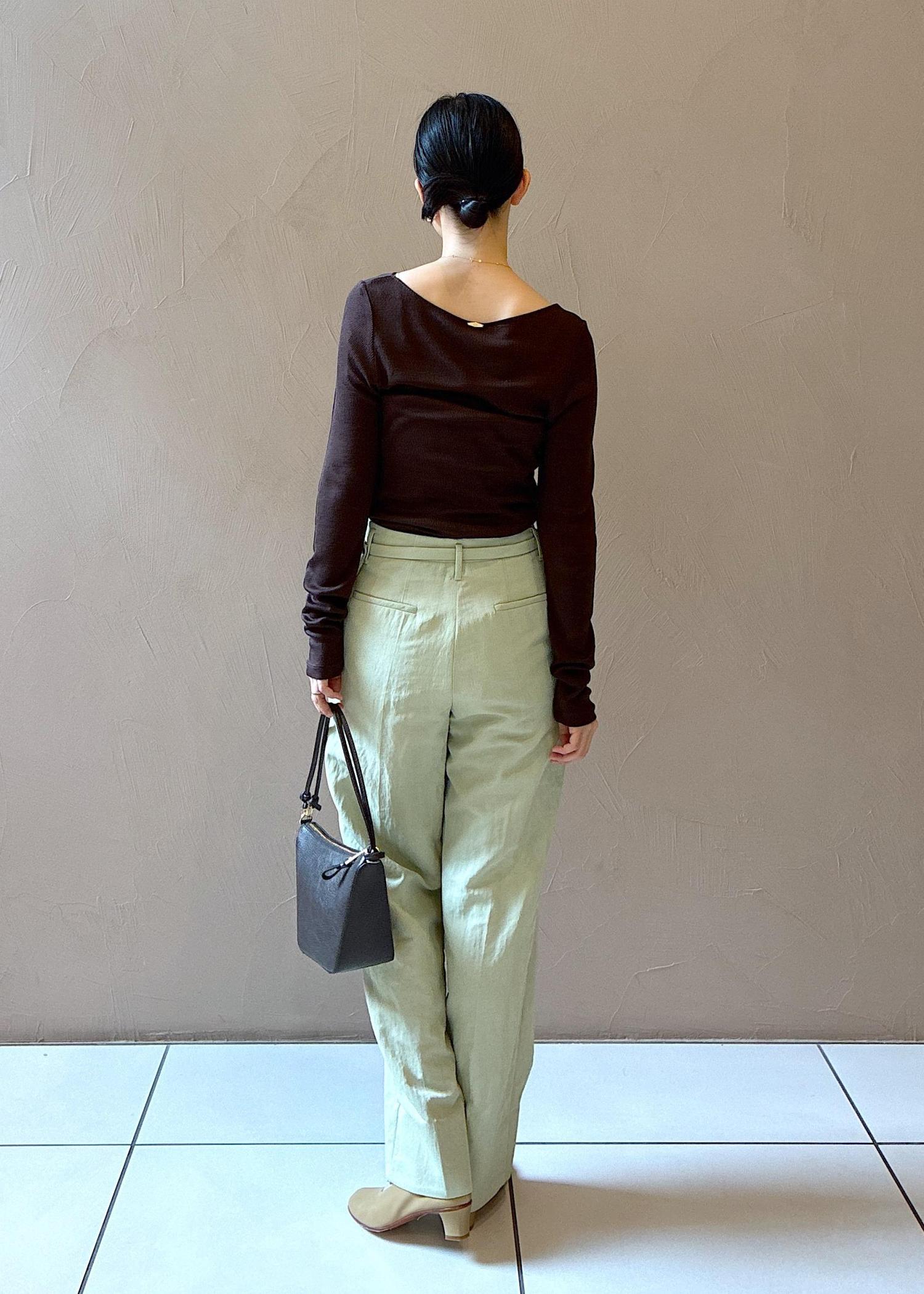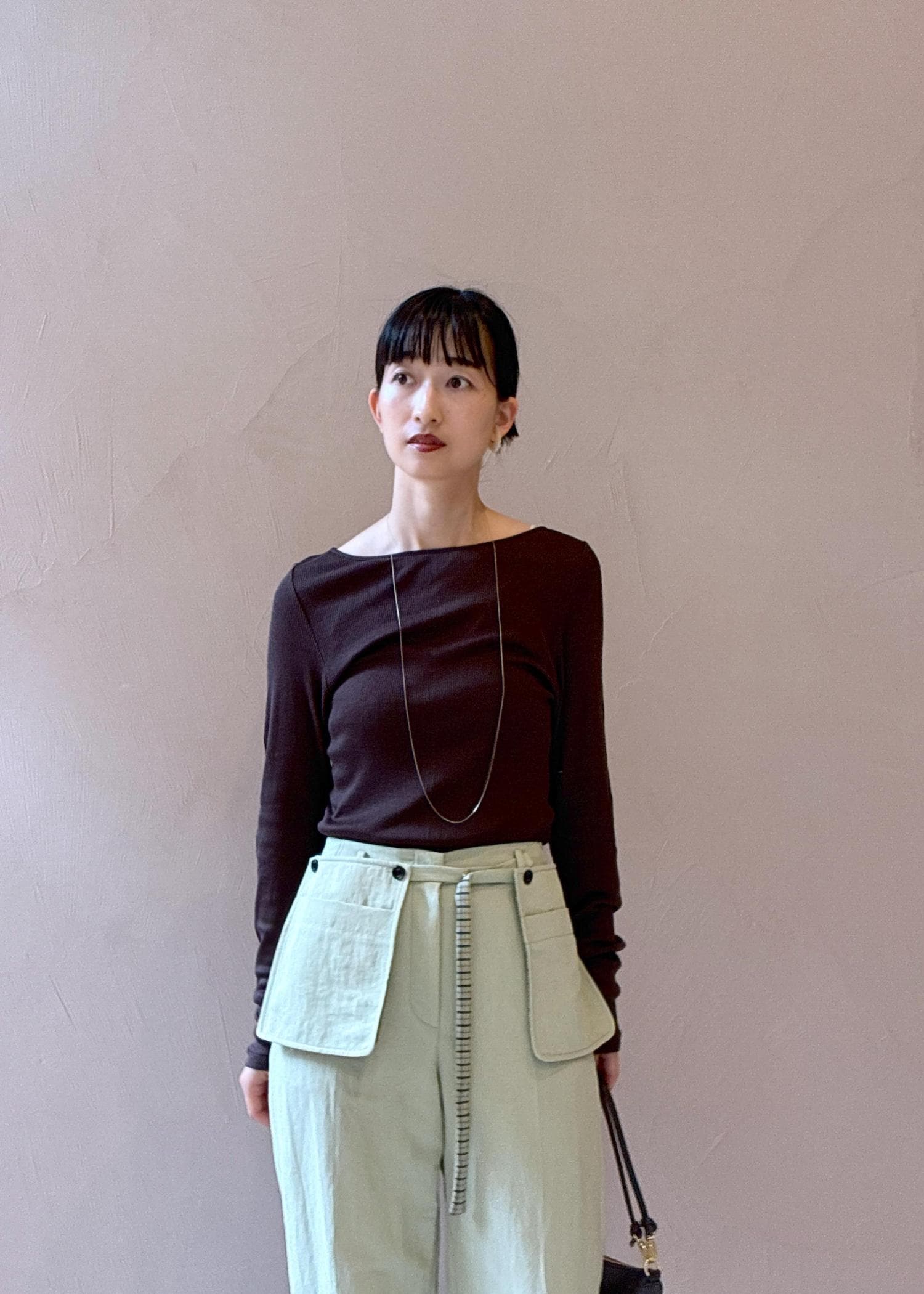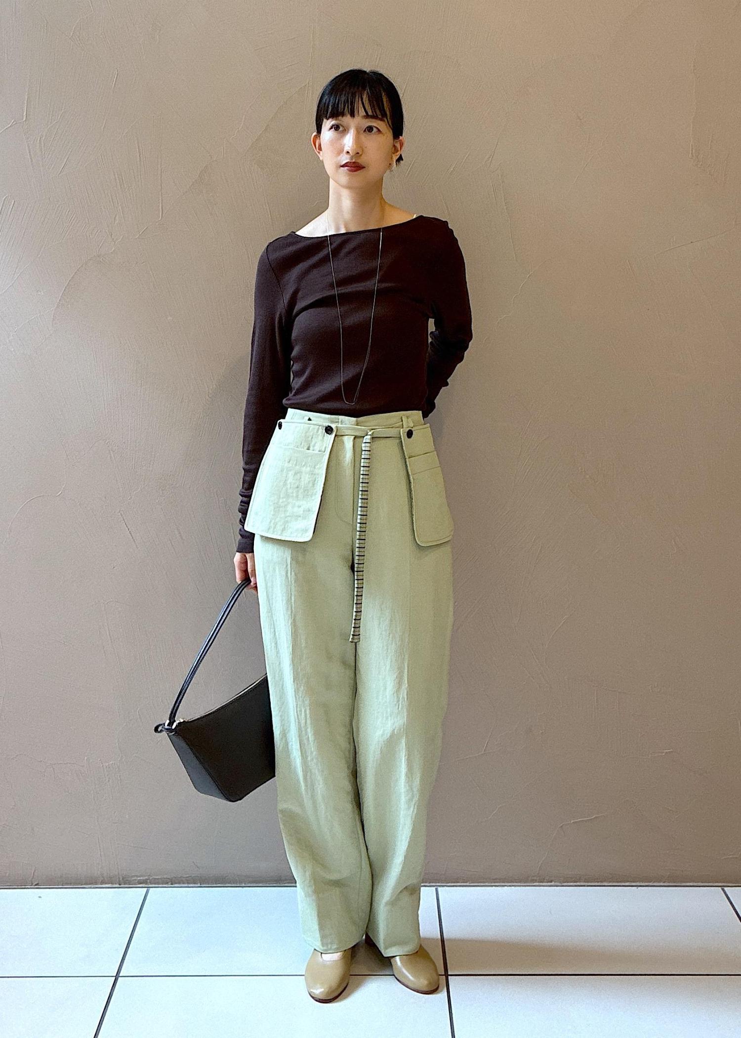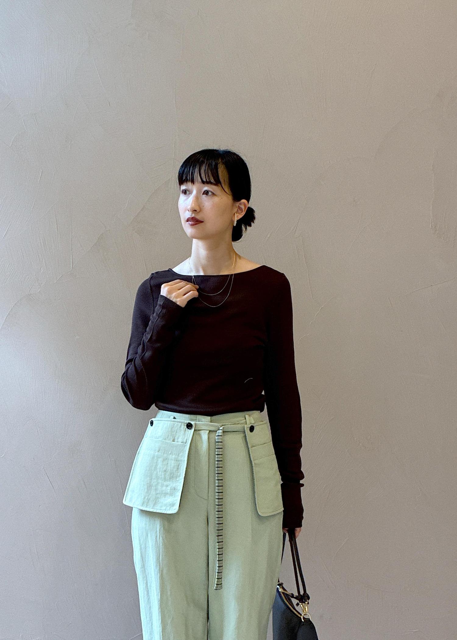 EENKのデザインパンツにHag silkのブラウンを合わせました。足元はmartiniano、ジュエリーはGIGI。