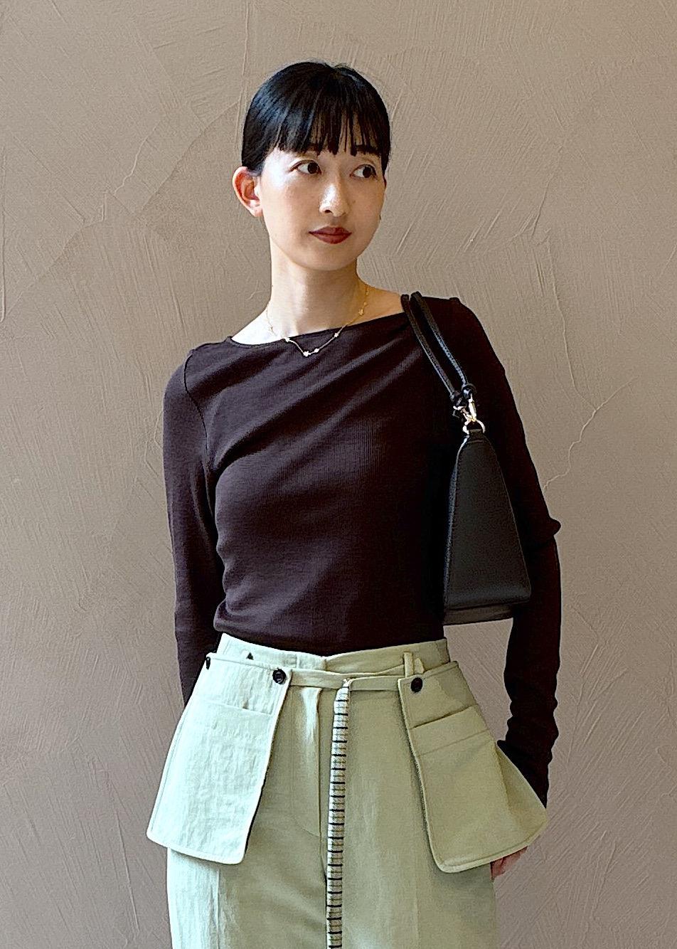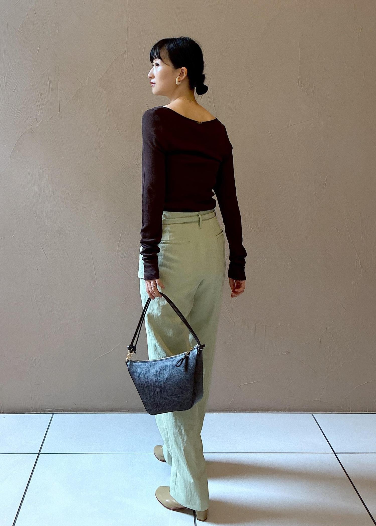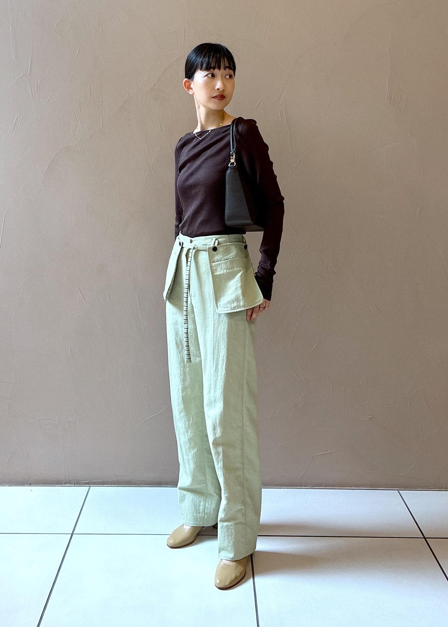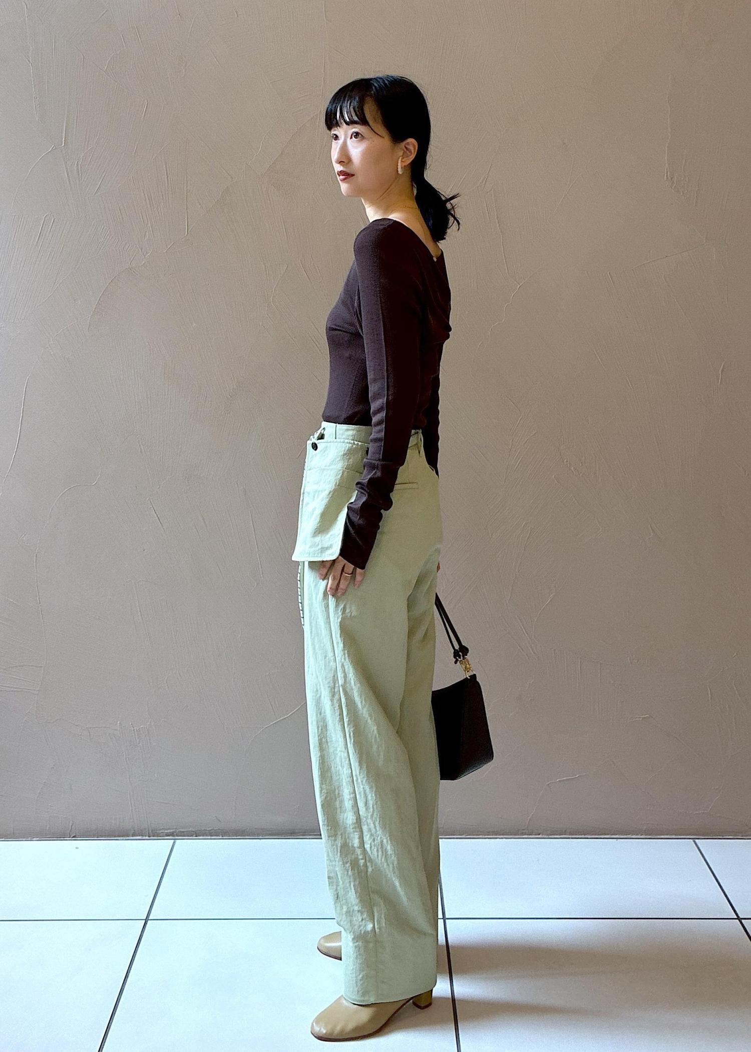 EENKのデザインパンツにHag silkのブラウンを合わせました。足元はmartiniano、ジュエリーはGIGI。