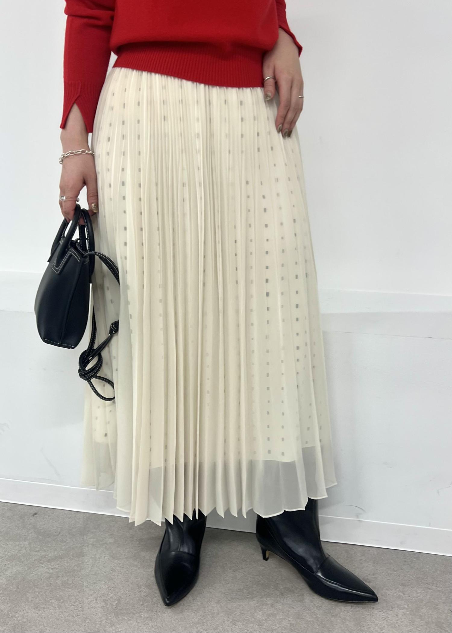 ROPÉスクエアドットプリントププリーツスカートキナリ / 38¥25,410レビュー着丈は足首にかからないくらいの丈感。内側のインナーの方が短く、プリーツの方は透け感があるので重たく見えず軽やかな印象。