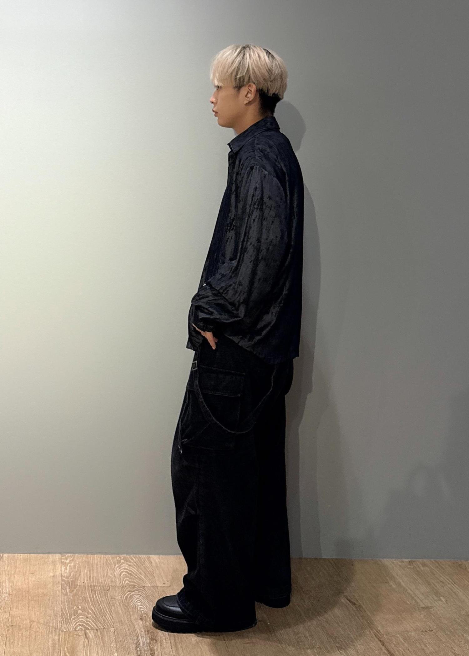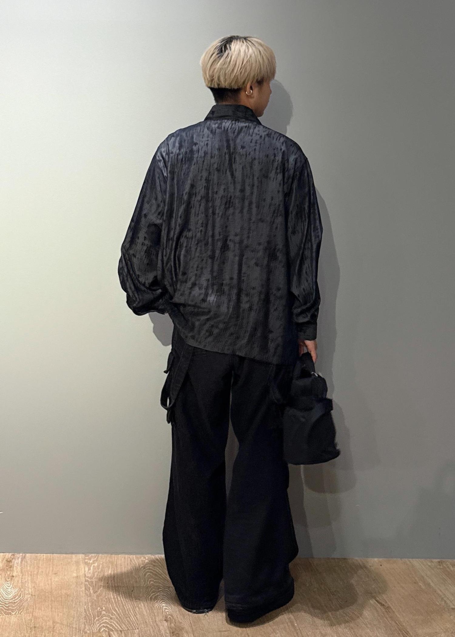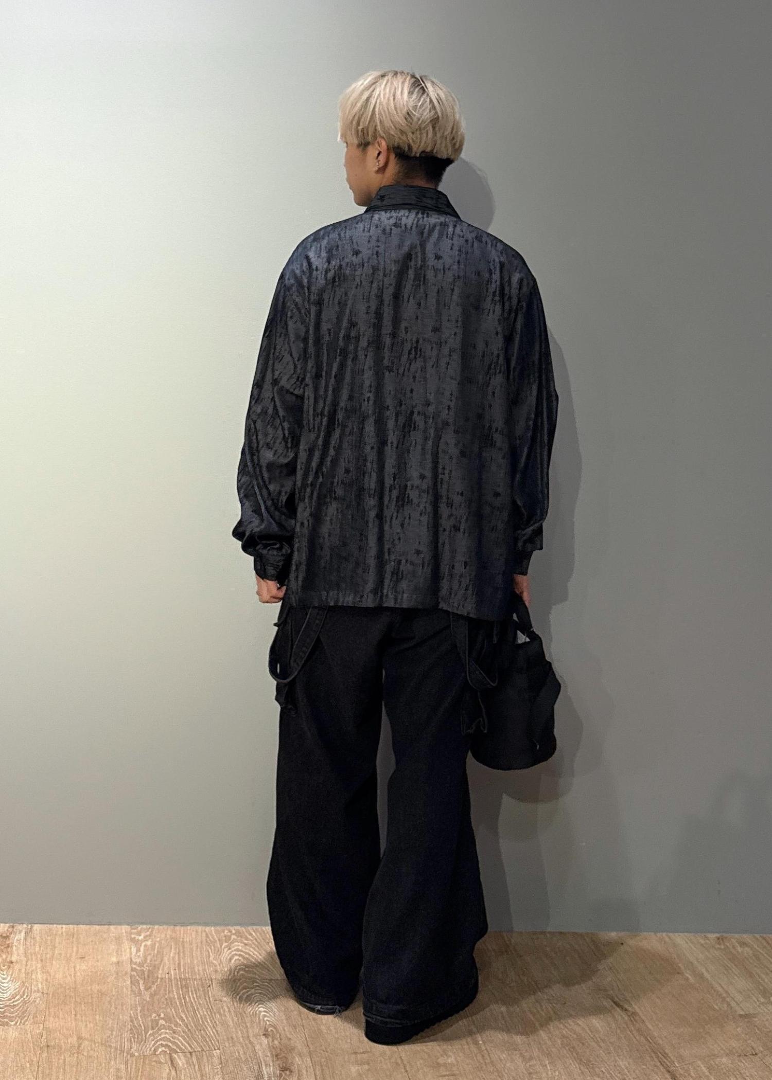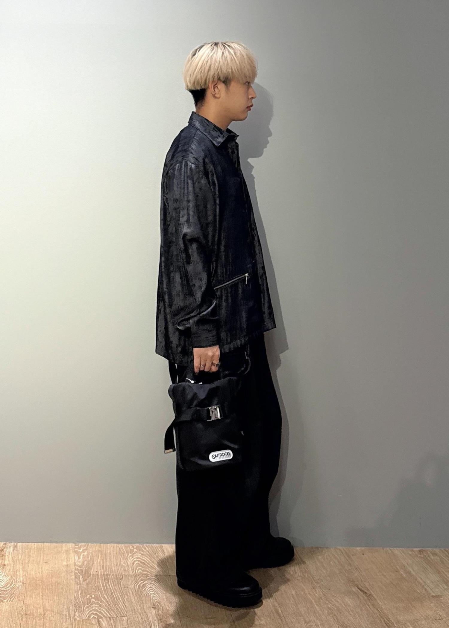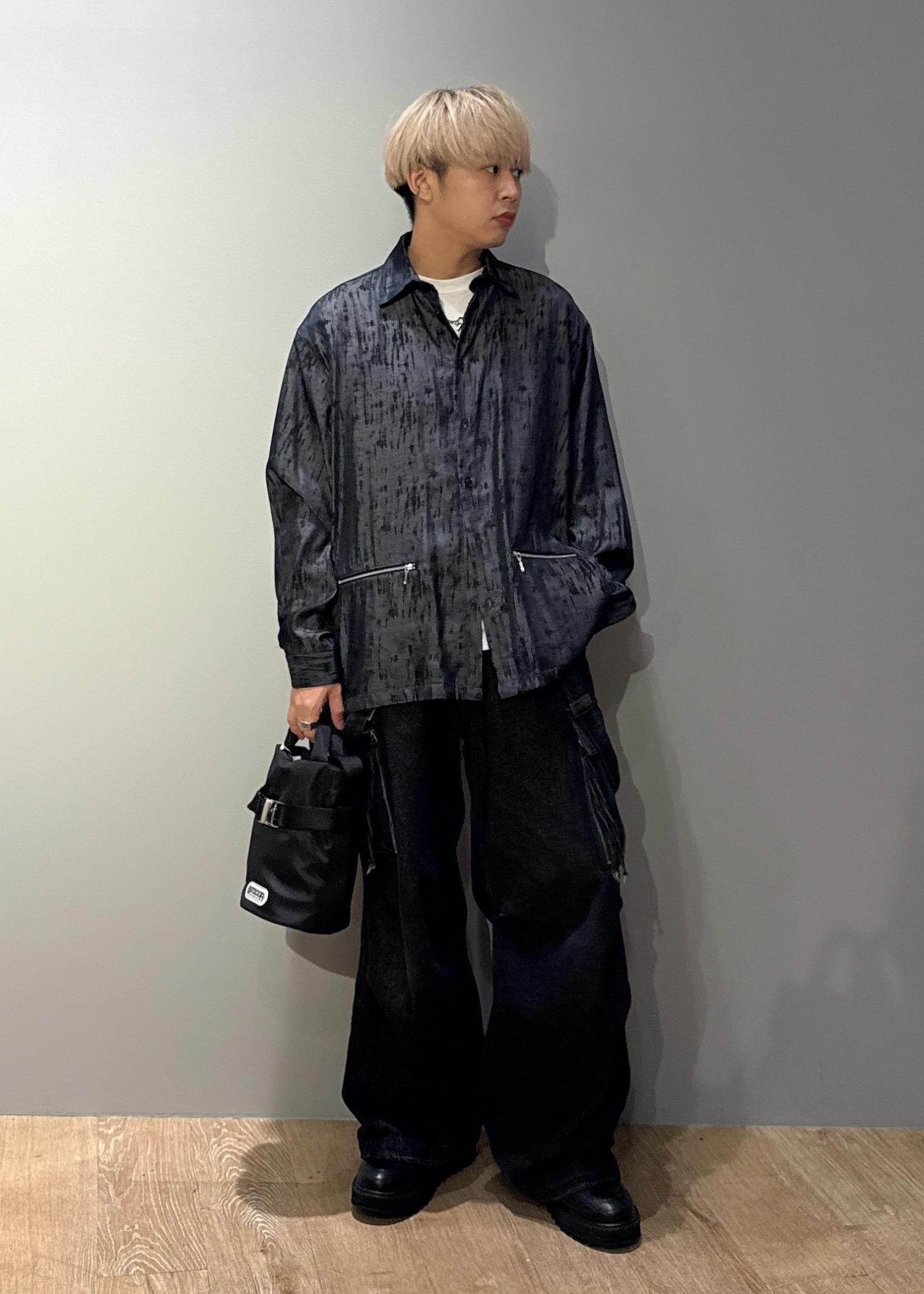 今回はスプレーアートジップポケットシャツを使ったコーデです。ドレープ感のある涼しい生地感です。今の時期Tシャツの上からサラッと羽織れるので晩夏、初秋におすすめです!