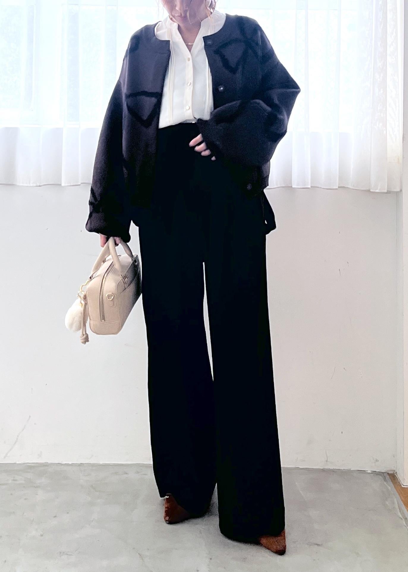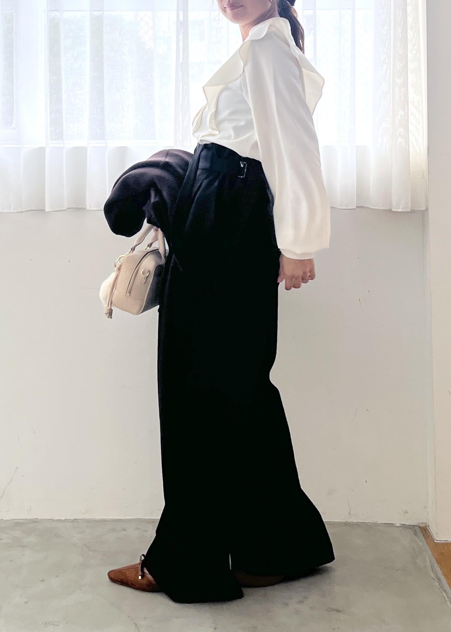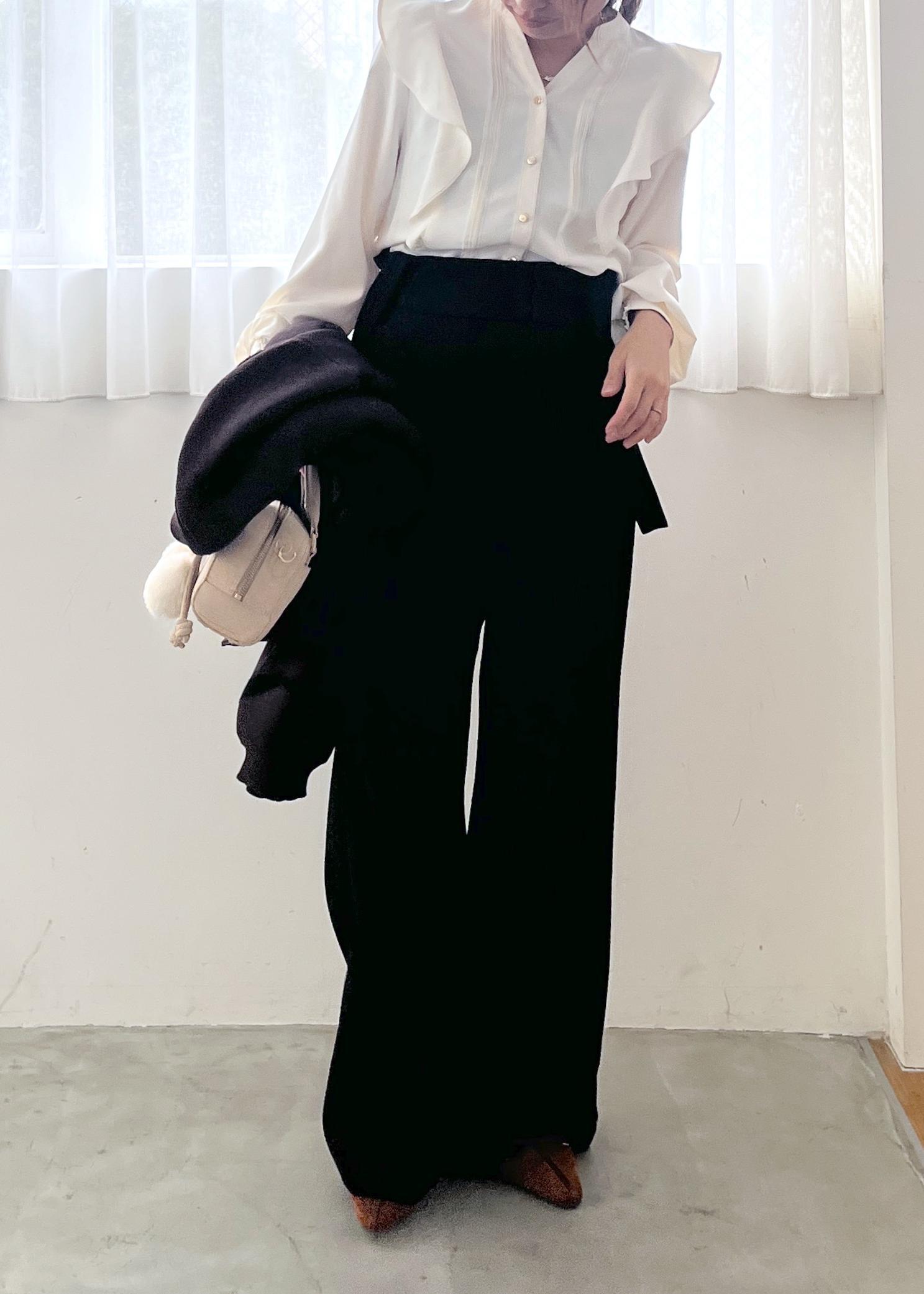 きちんと感のあるホワイトブラウスに、落ち感のきれいなワイドパンツを合わせた大人のモノトーンコーデ。