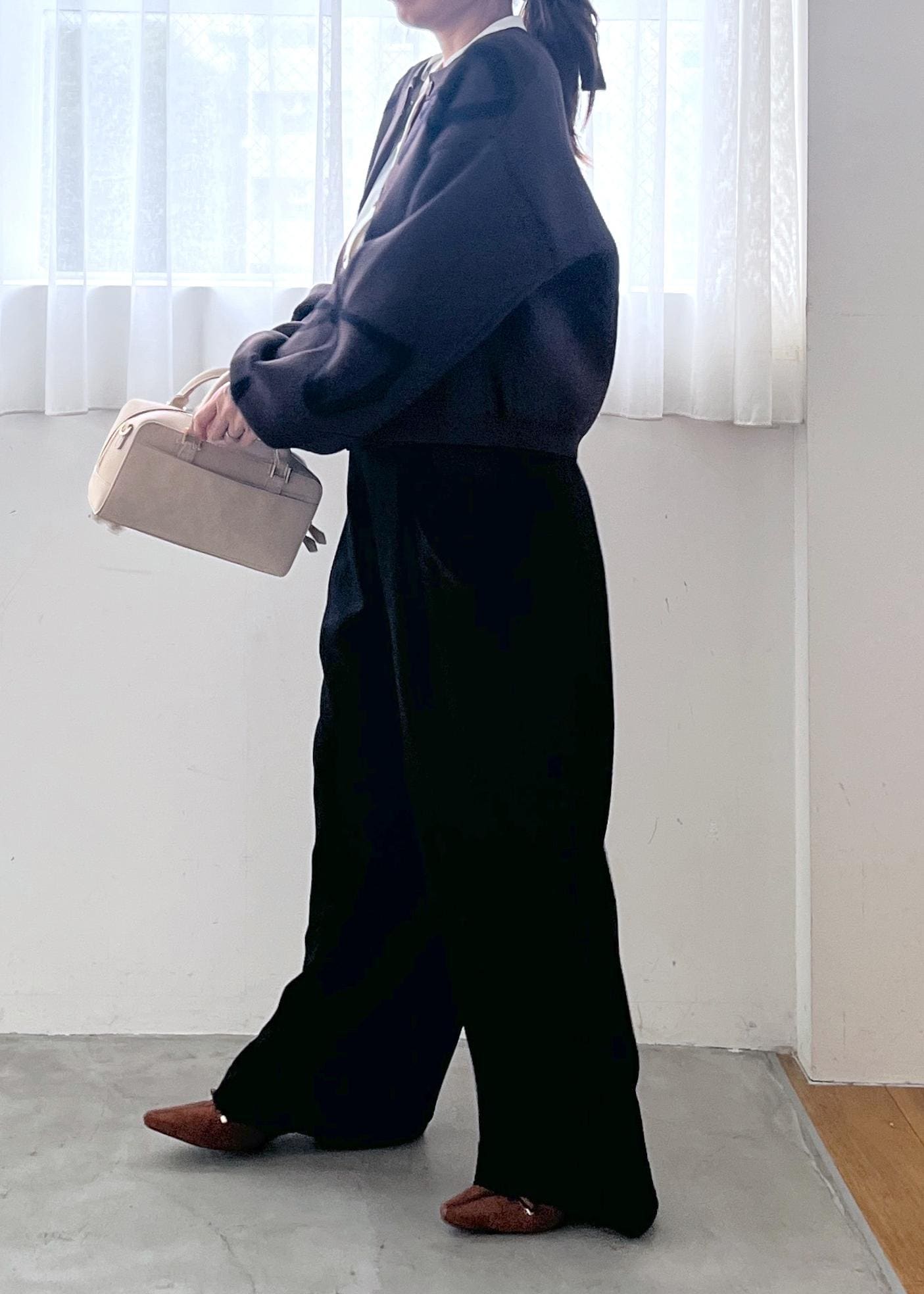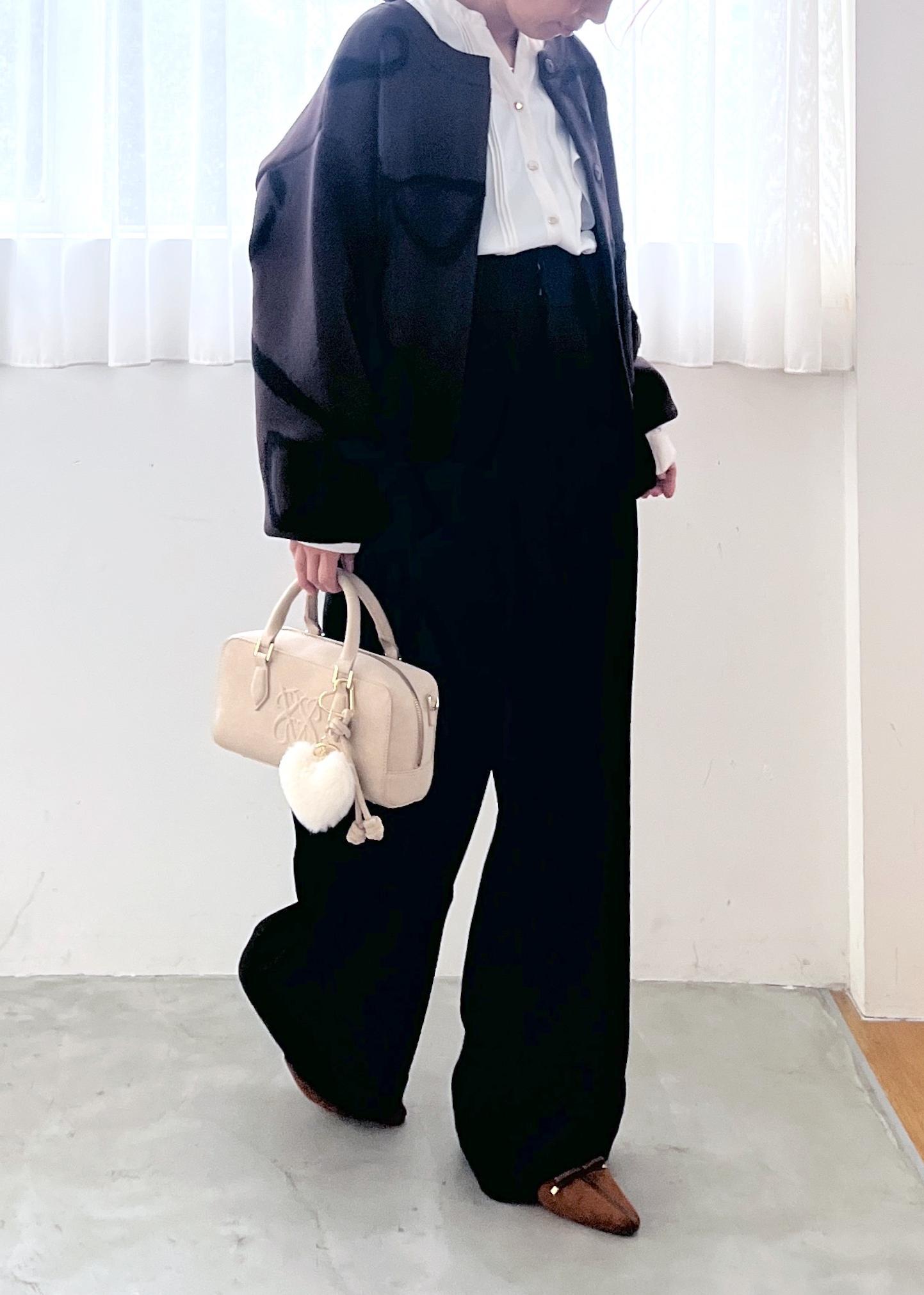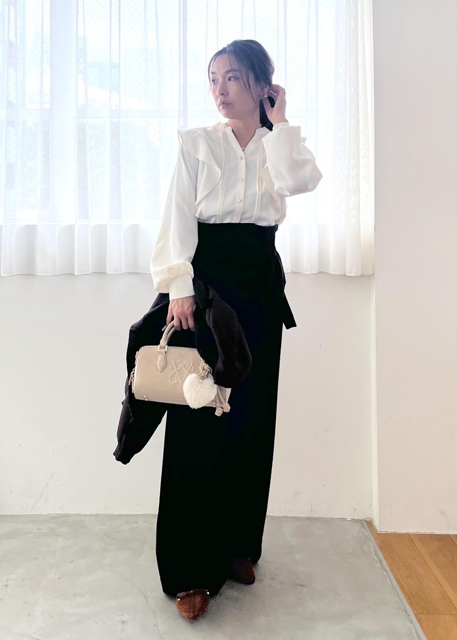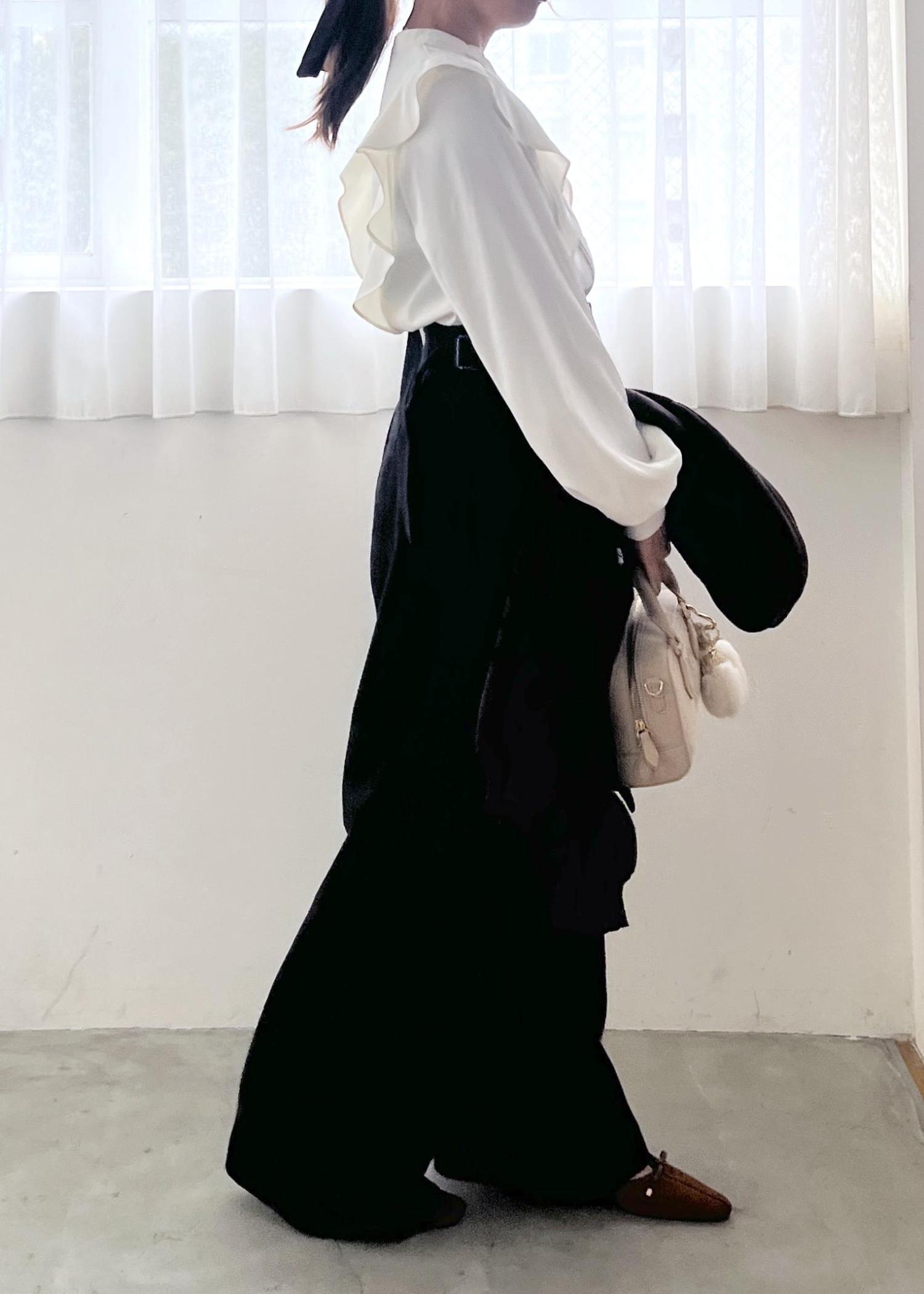 きちんと感のあるホワイトブラウスに、落ち感のきれいなワイドパンツを合わせた大人のモノトーンコーデ。