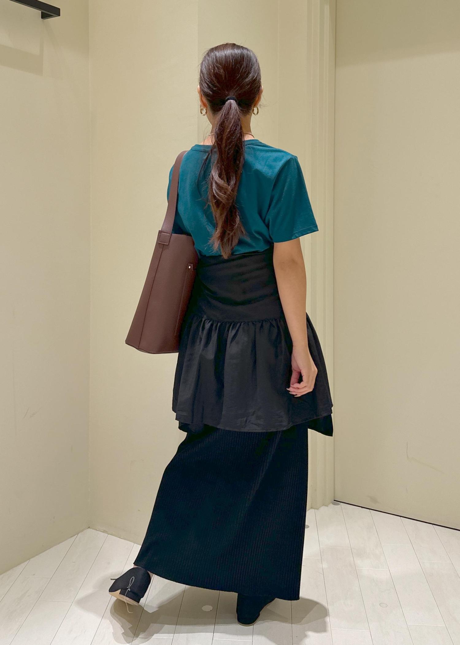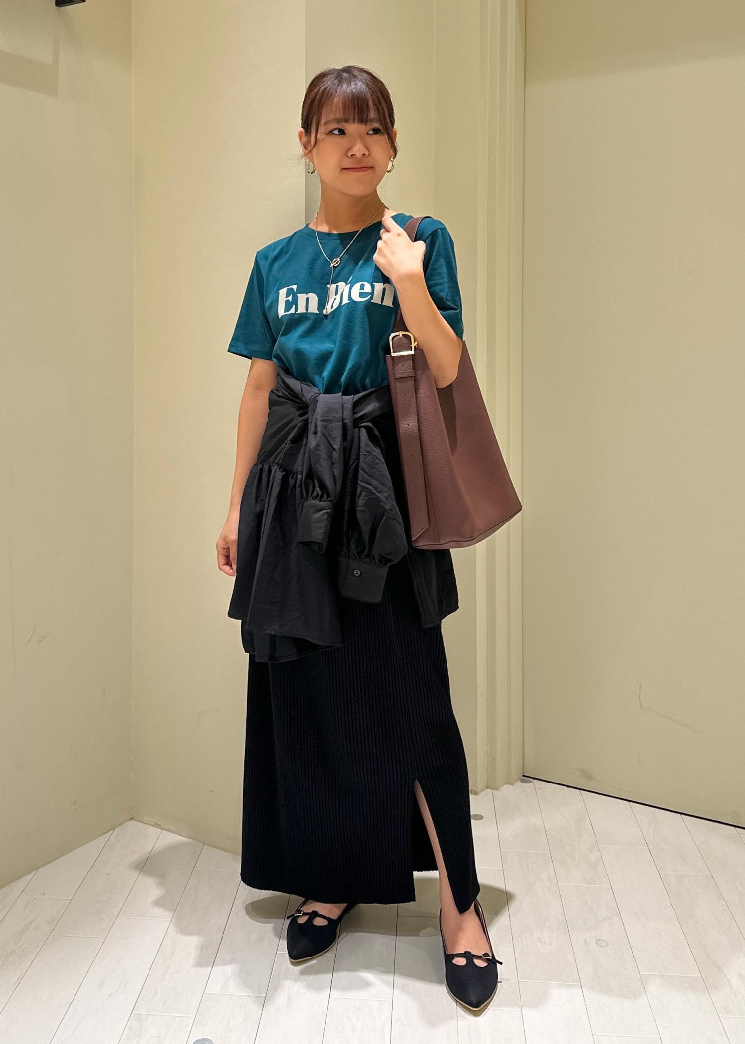モスグリーンのTシャツが秋感をプラスしてくれています。