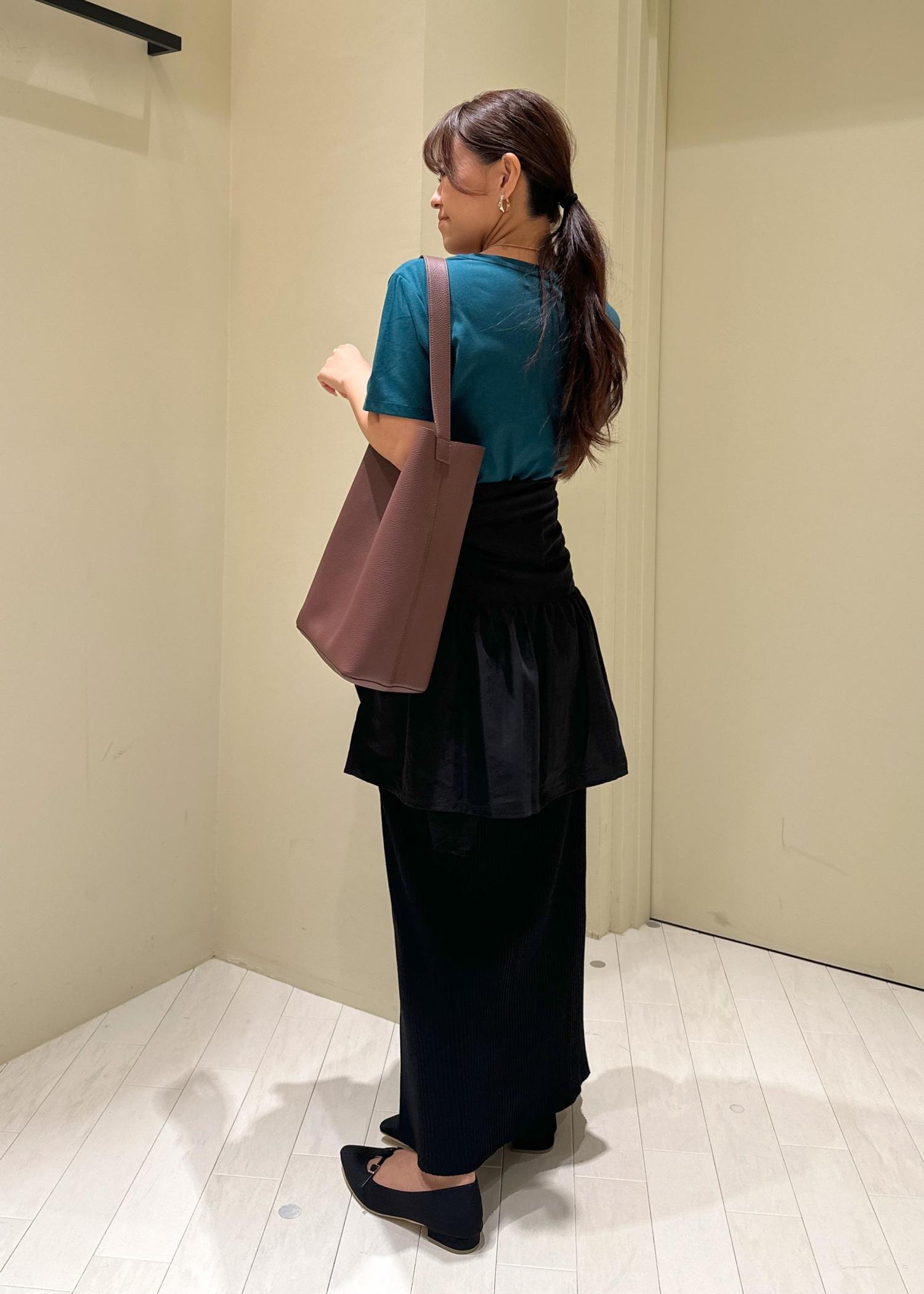 ペプラムシャツを腰巻きし、こなれ感とスタイルアップをプラスしたコーデ!