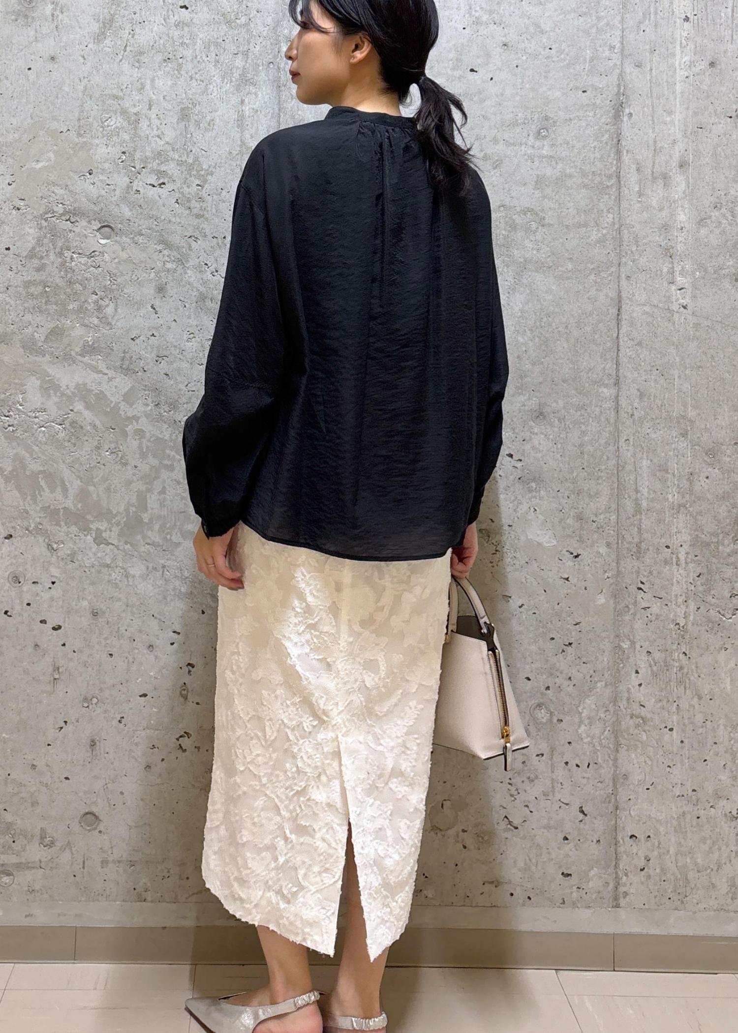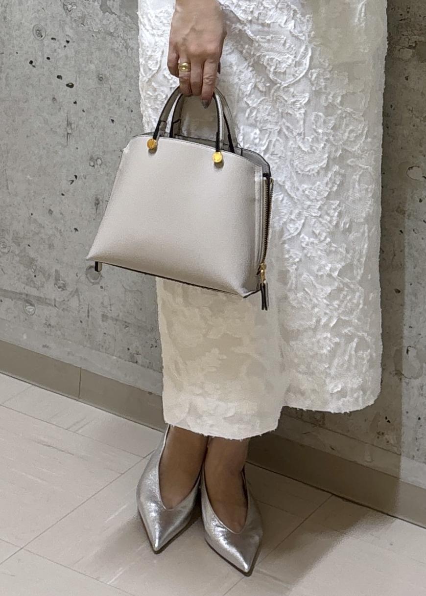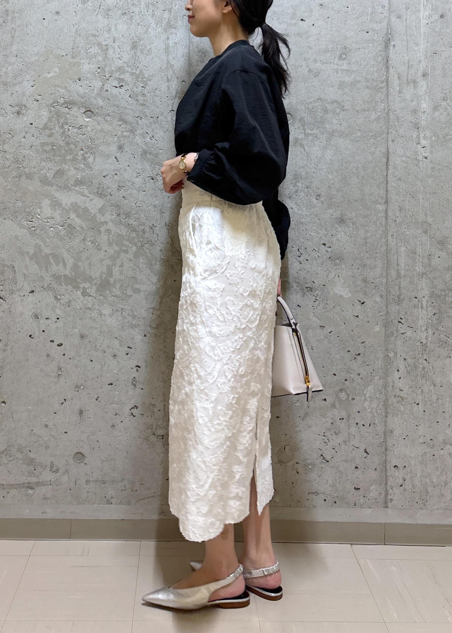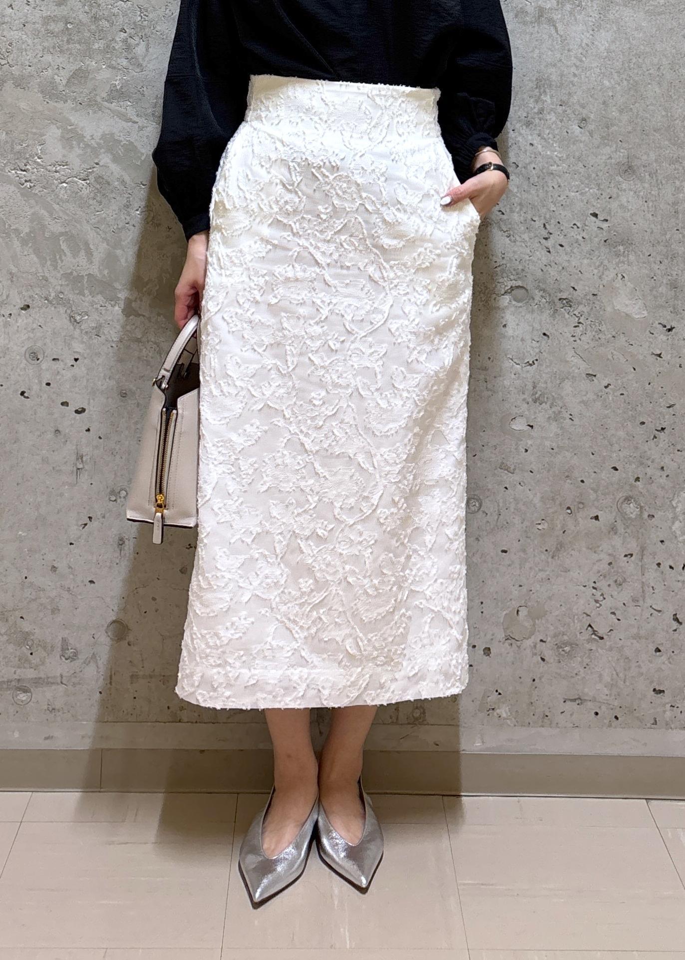 スカートは立体感のある織りが華やかで、モノトーンながら存在感を発揮します。