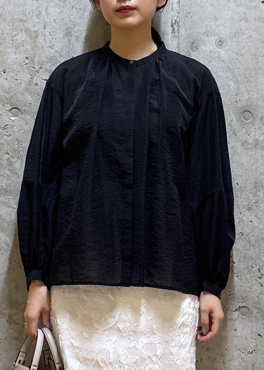 襟や袖口に細かいギャザーが入っていて、全体的にふんわりと空気をはらんだシルエットが抜け感があってお洒落です。