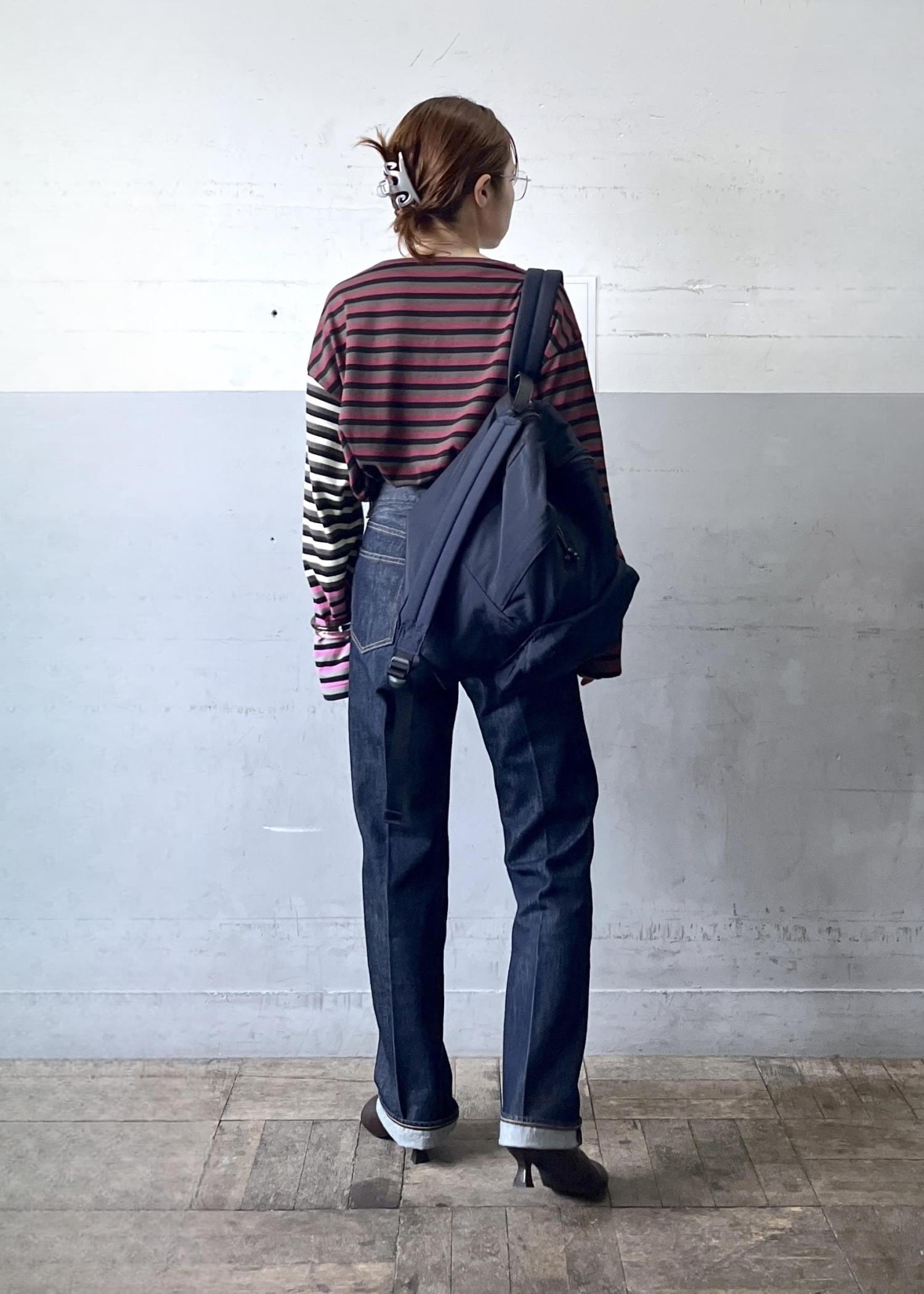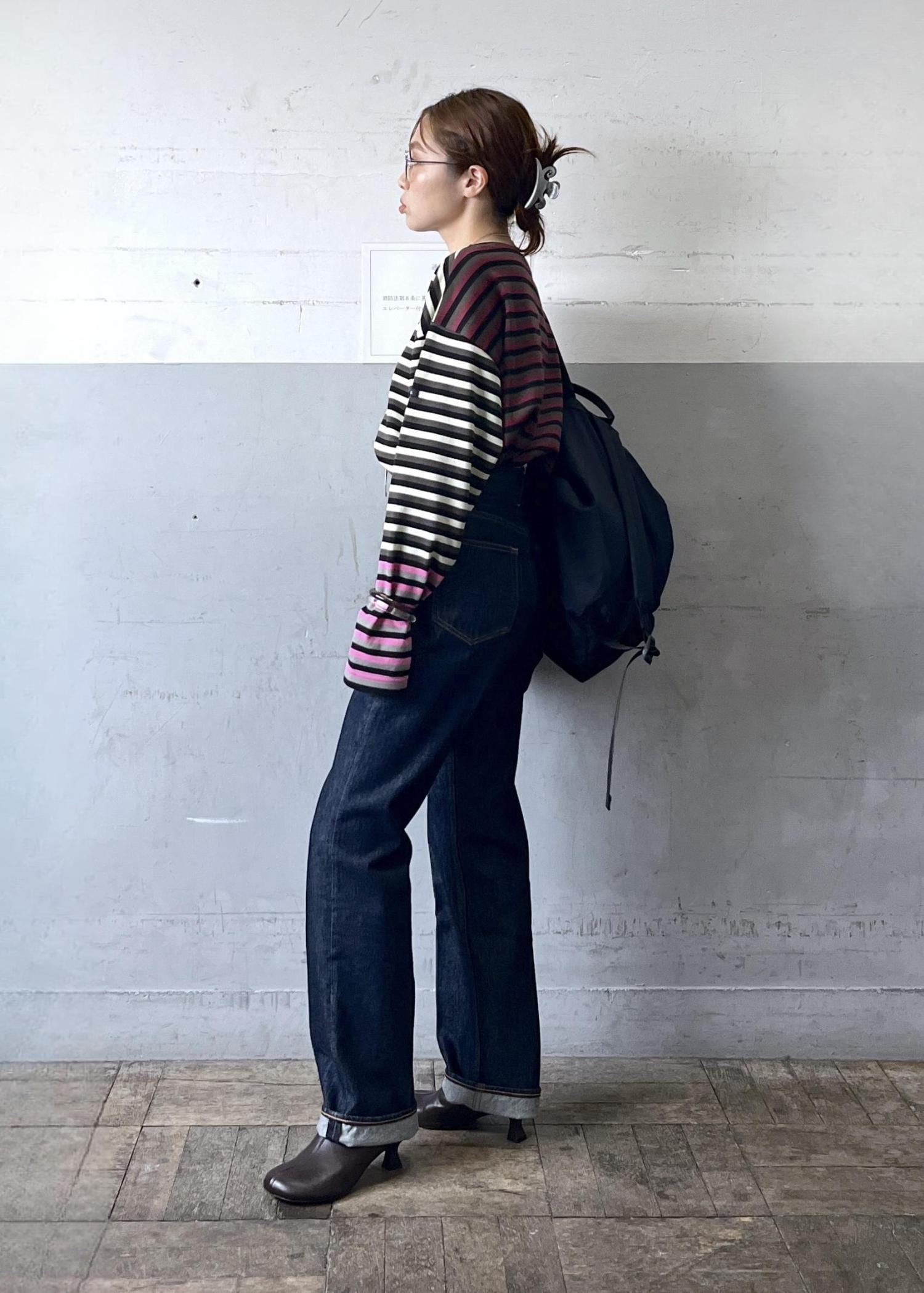 今回はトップスインしたかったので少し大きめのサイズを着用していますが、ややハリ感のある生地なのでそこまで大きく感じず。