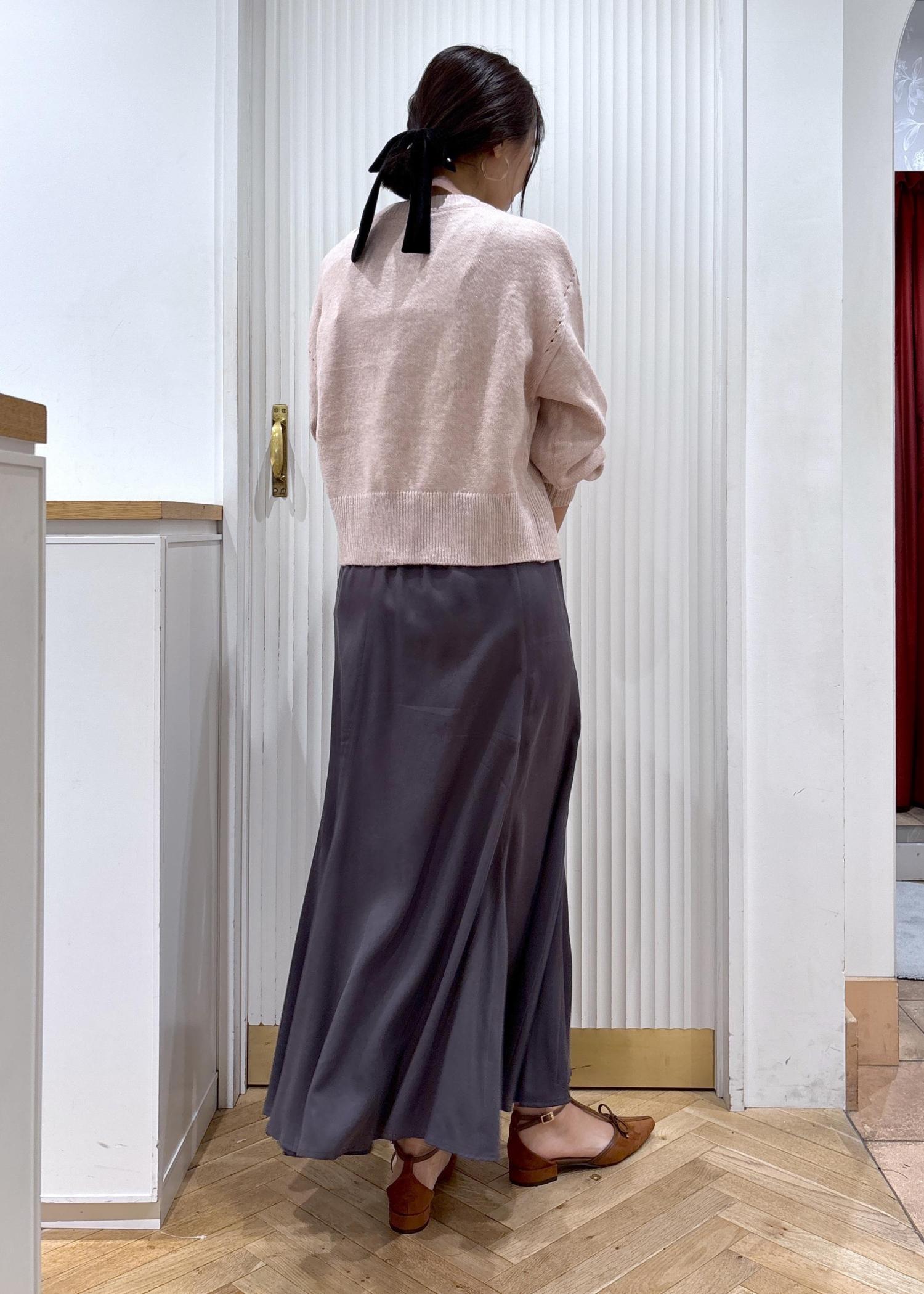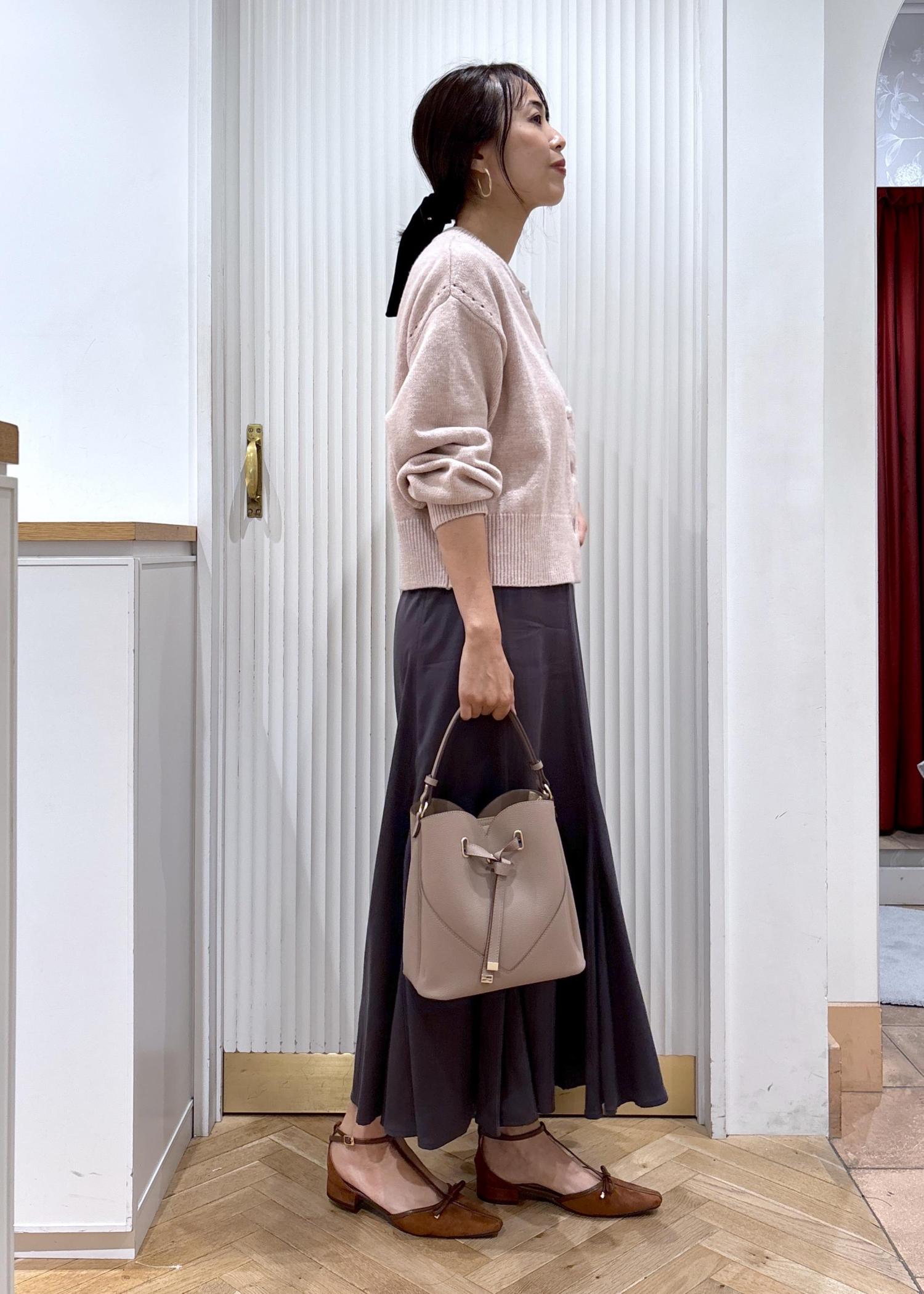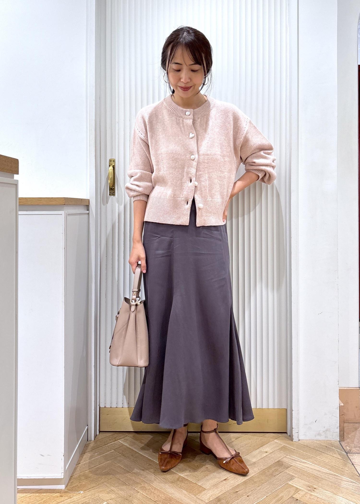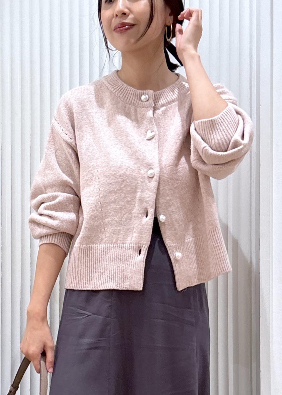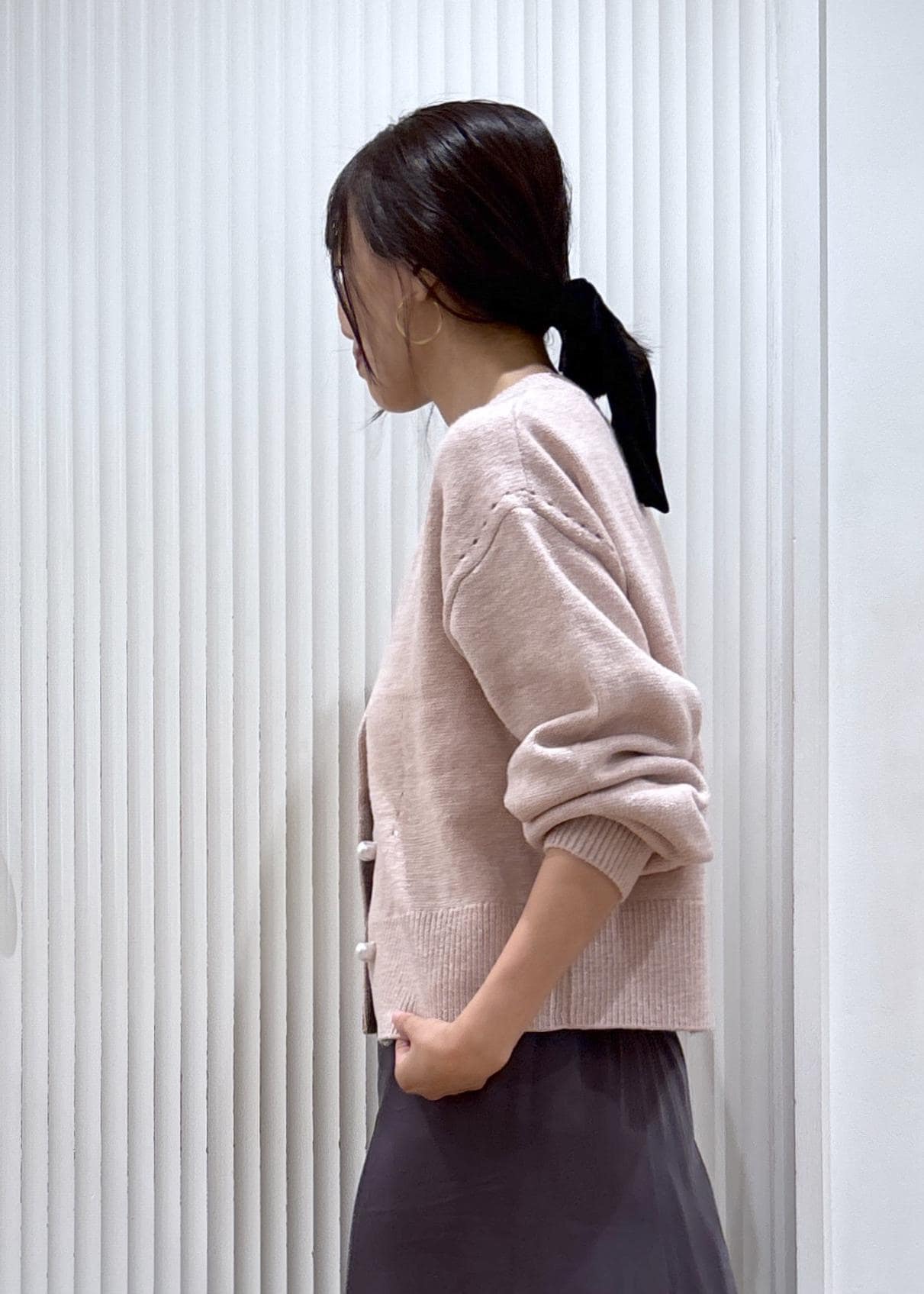 ボタンの可愛いカーディガンはピンクの色味が目を惹きます。