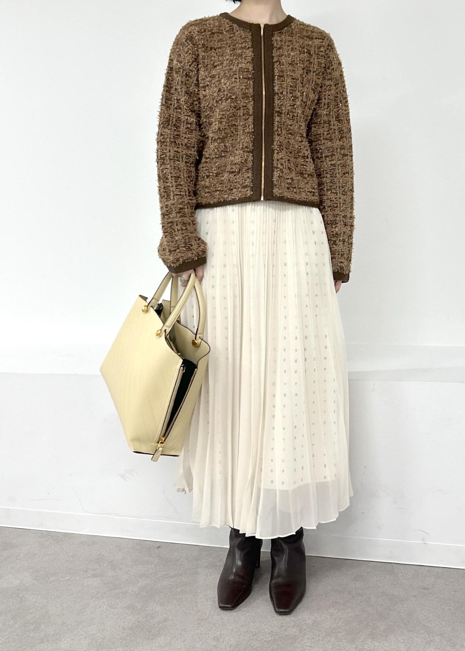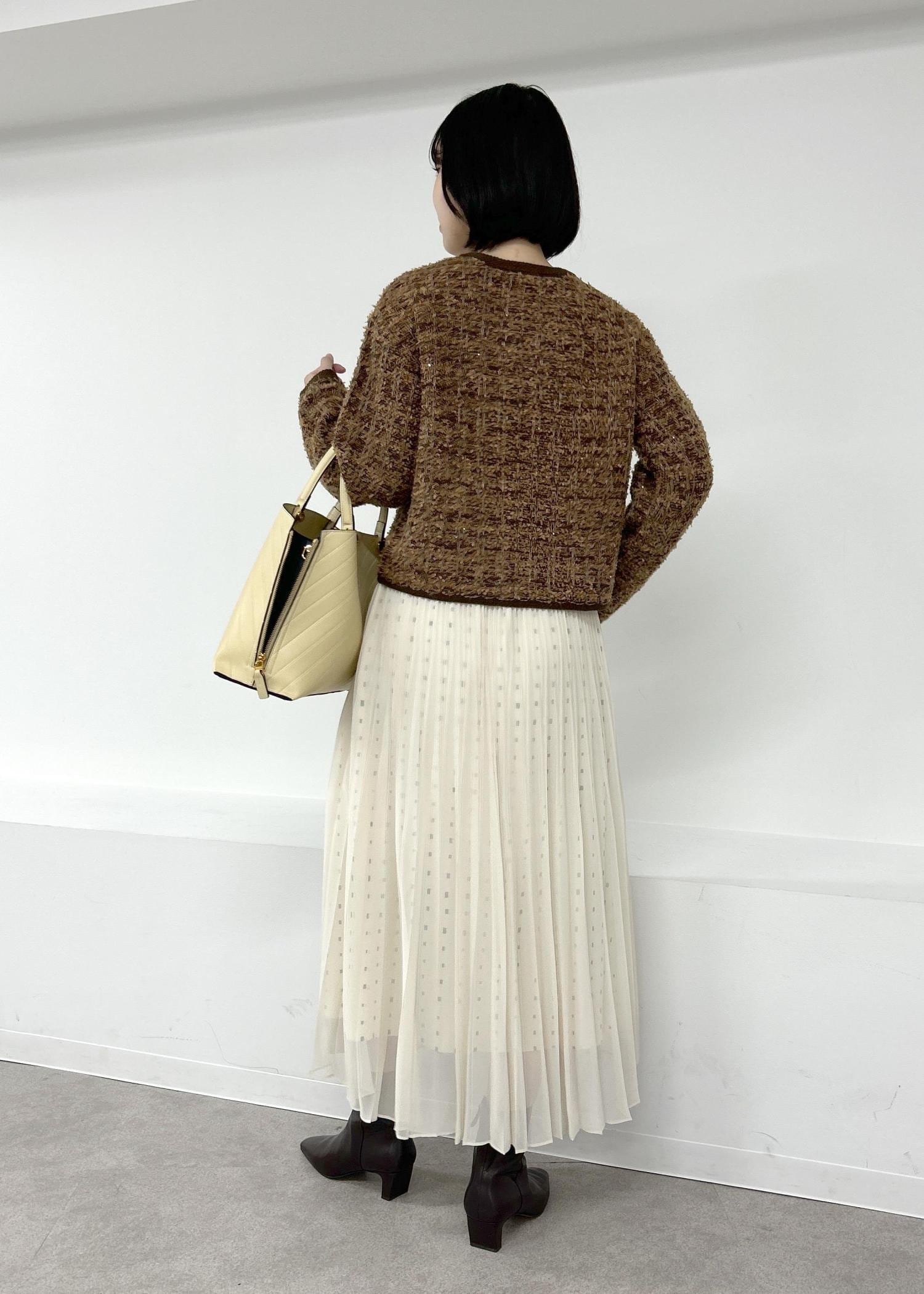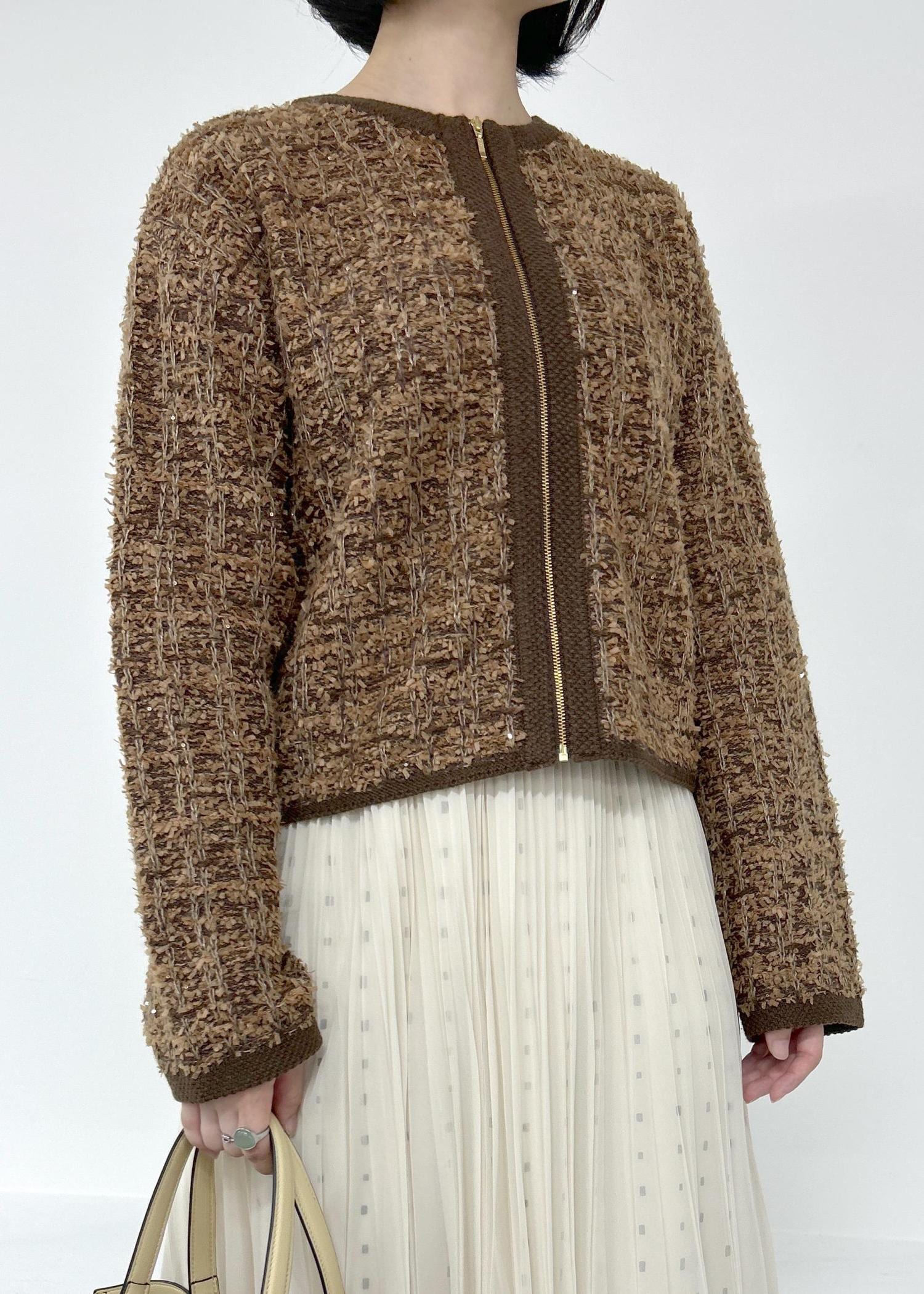 ROPÉツイードZIPノーカラーカーディガン/イージーケアブラウン / F¥25,300レビュー全体的にコンパクトなシルエットでヒップ上くらいの着丈です。お袖は手の甲が隠れるくらいの長さです。中にニット一枚着られるくらいのゆとりはあります。