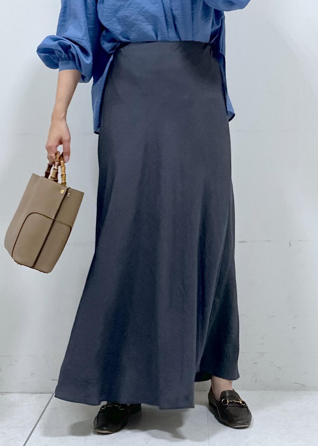 腰回りがすっきりとしたマーメイドシルエットで、ウエストが後ろゴムなので楽に着ていただけます◎ -