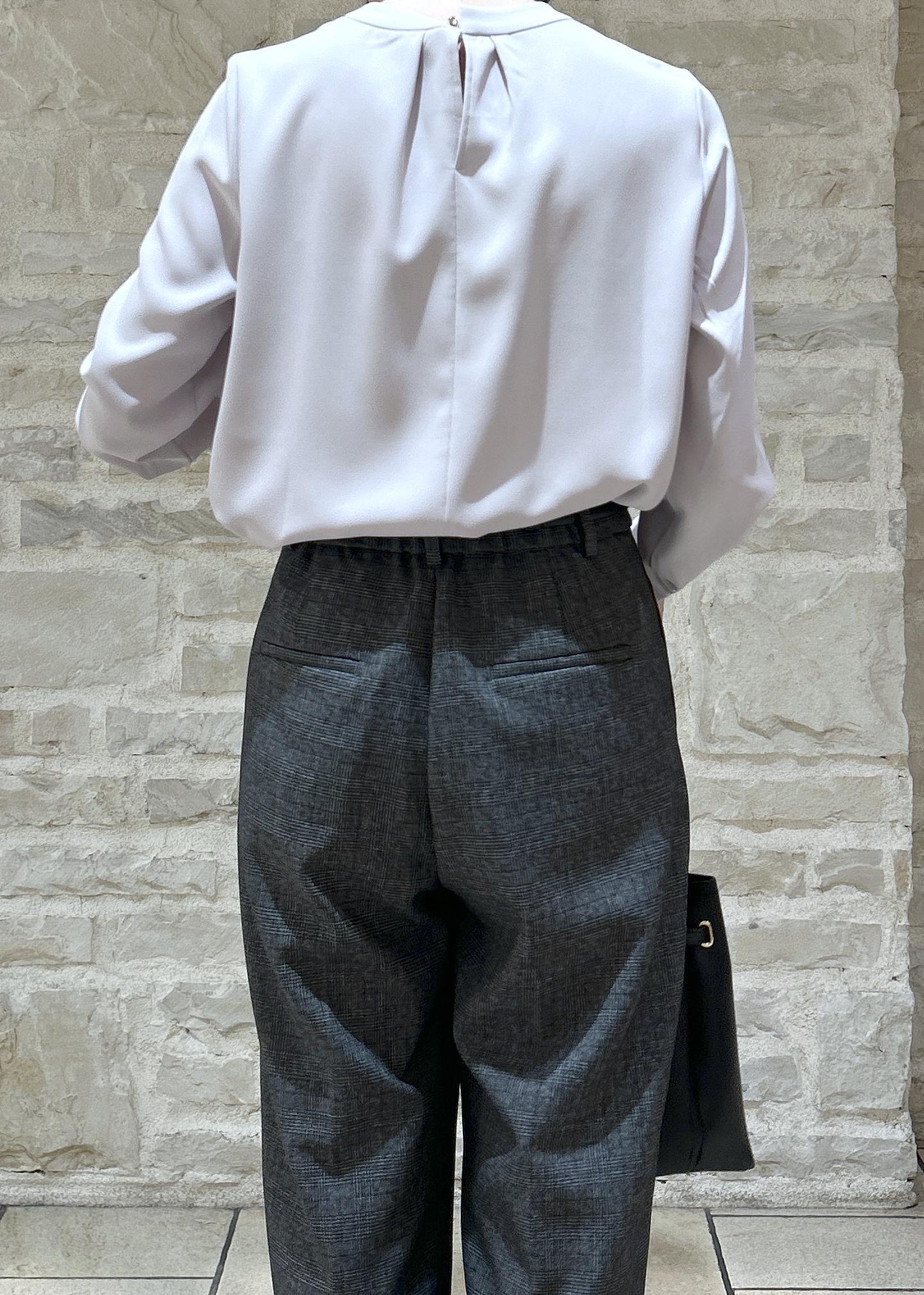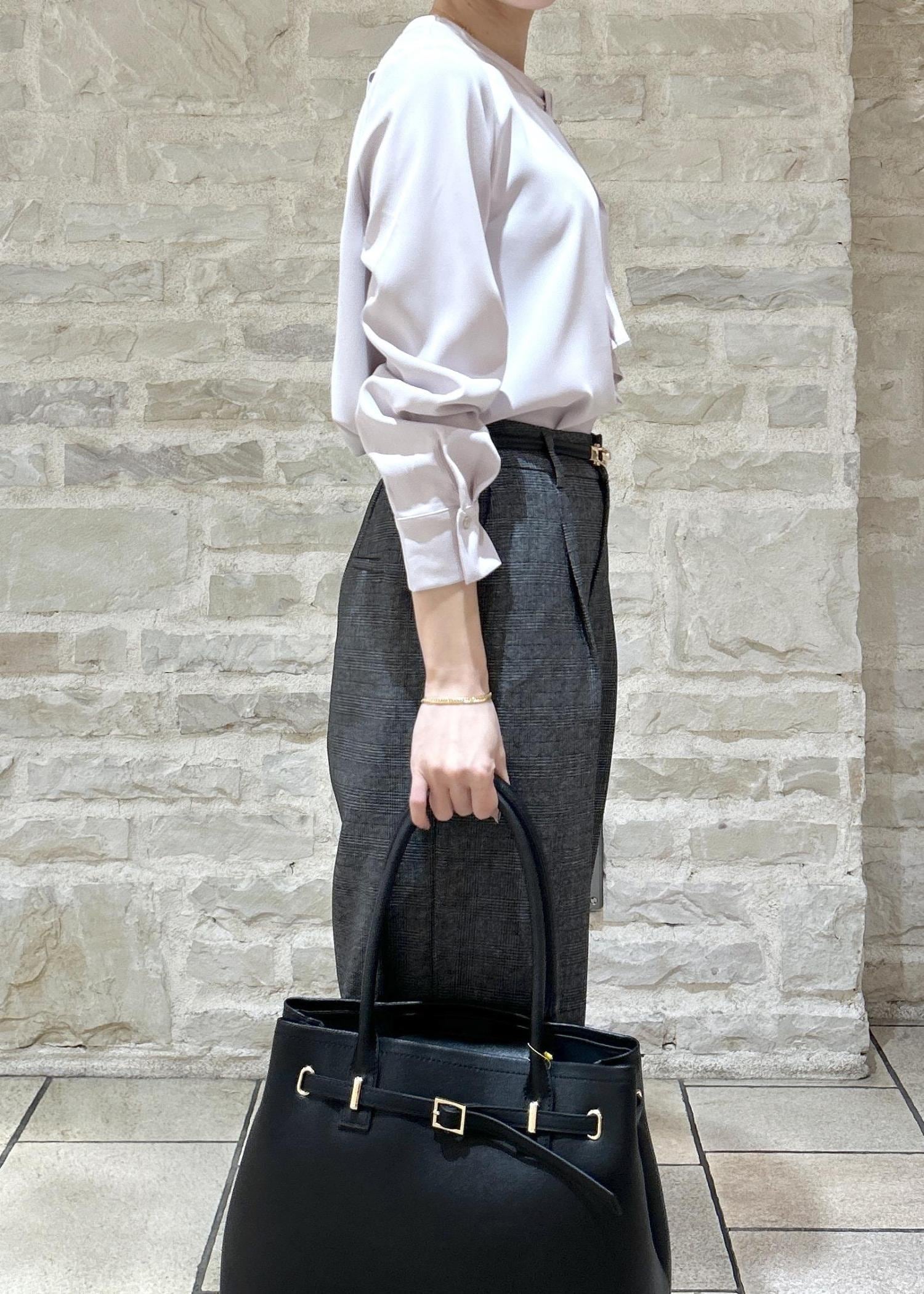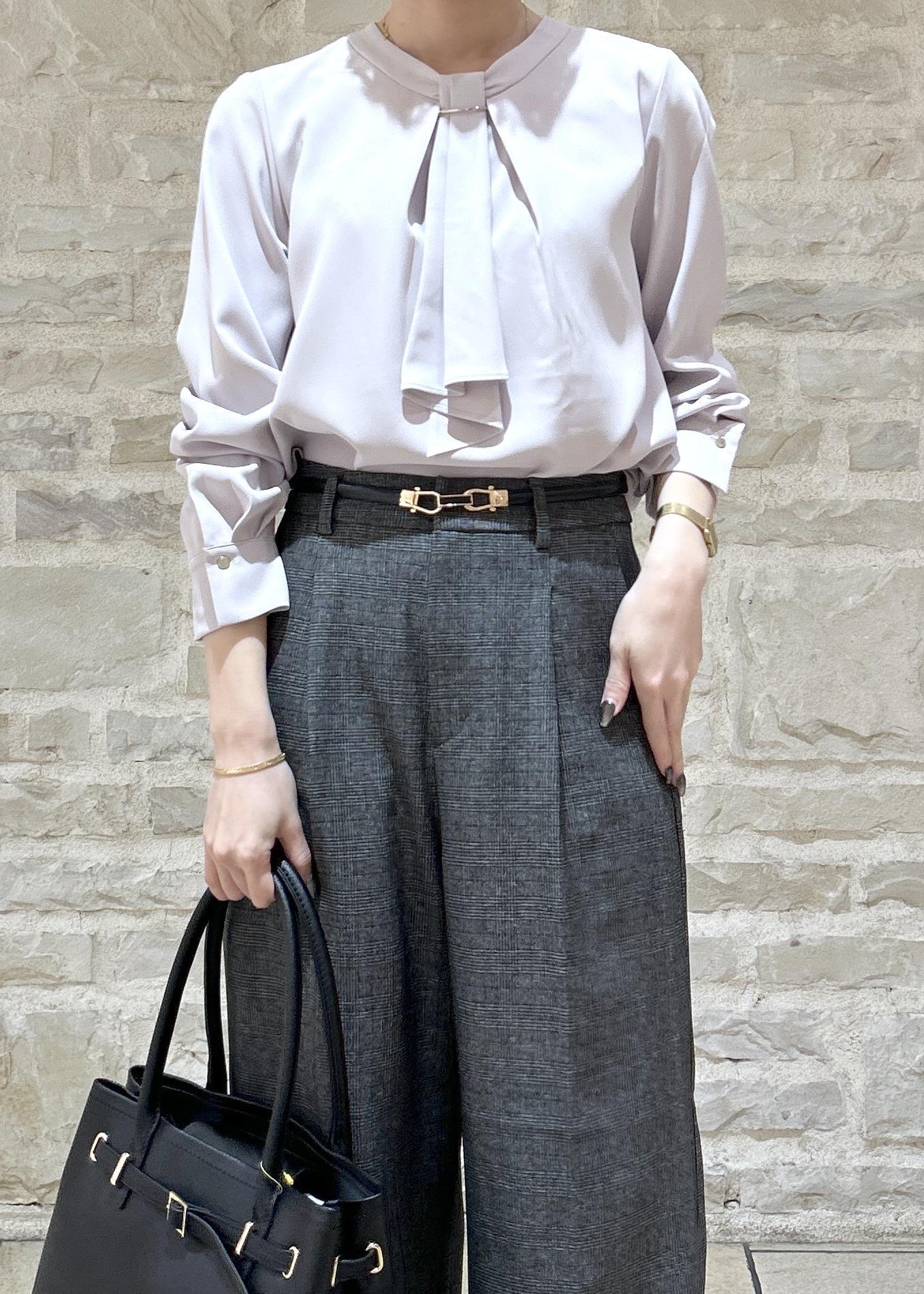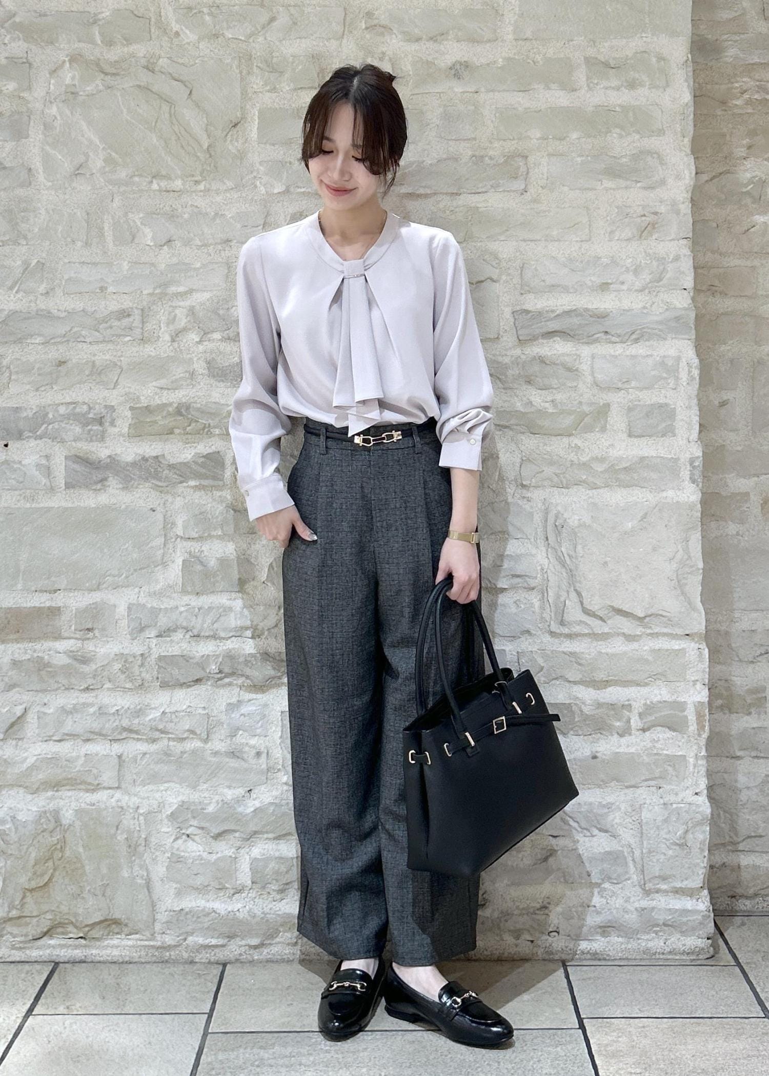 ピンクのかわいらしいブラウスにチェック柄のパンツで秋らしい通勤スタイルにしました。