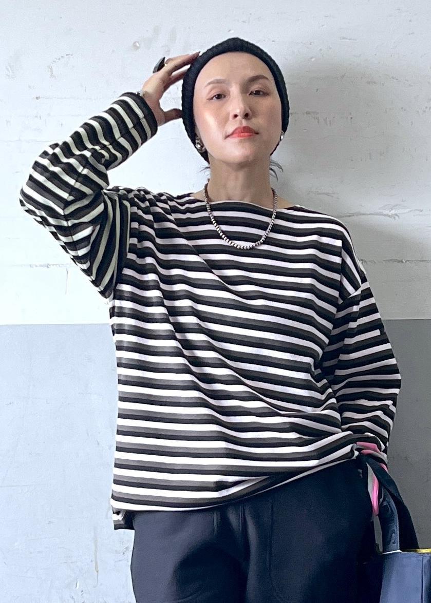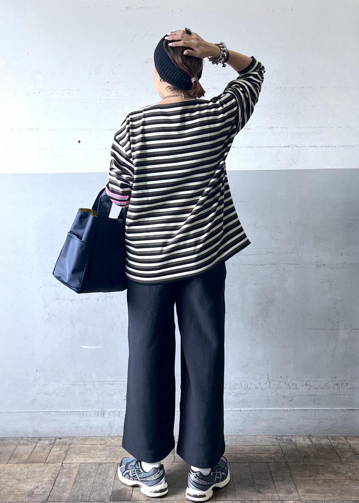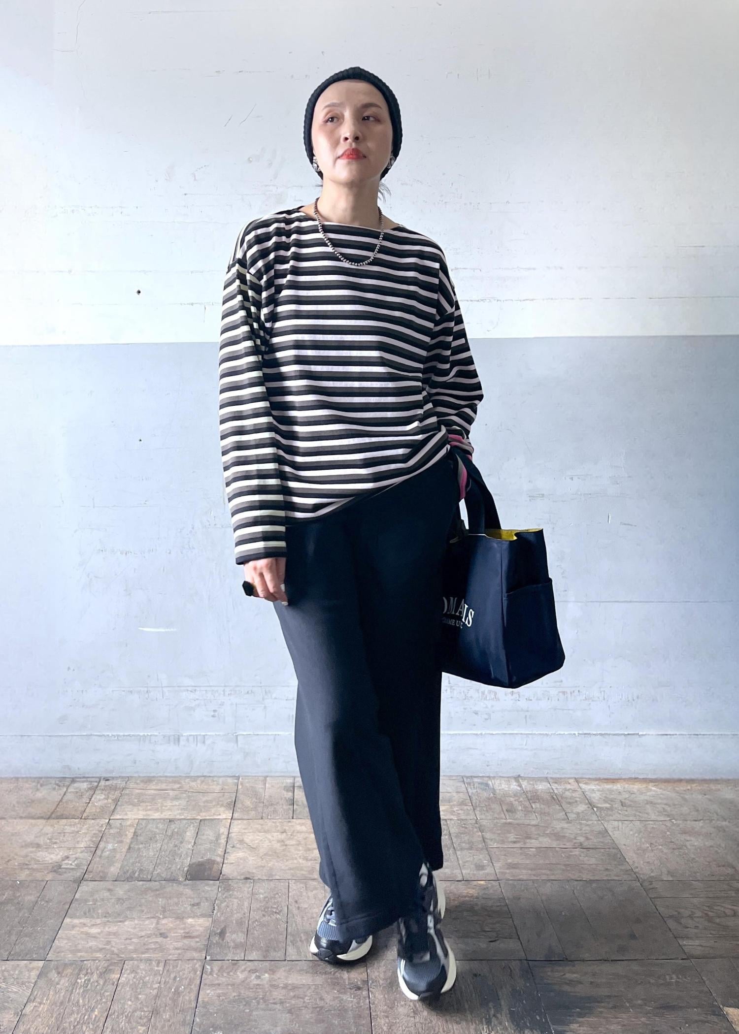 別注のChampionスウェットパンツを主役に、毎回人気のG•F•G•Sのボーダートップスで抜け感をプラスした大人のフレンチカジュアル。リラックス感がありながらきれい見えするシルエットが魅力です