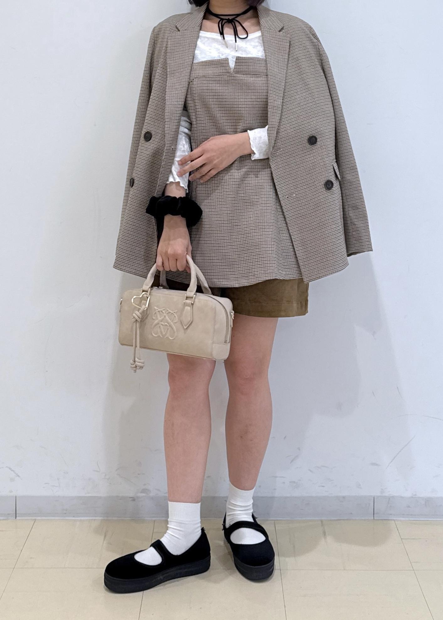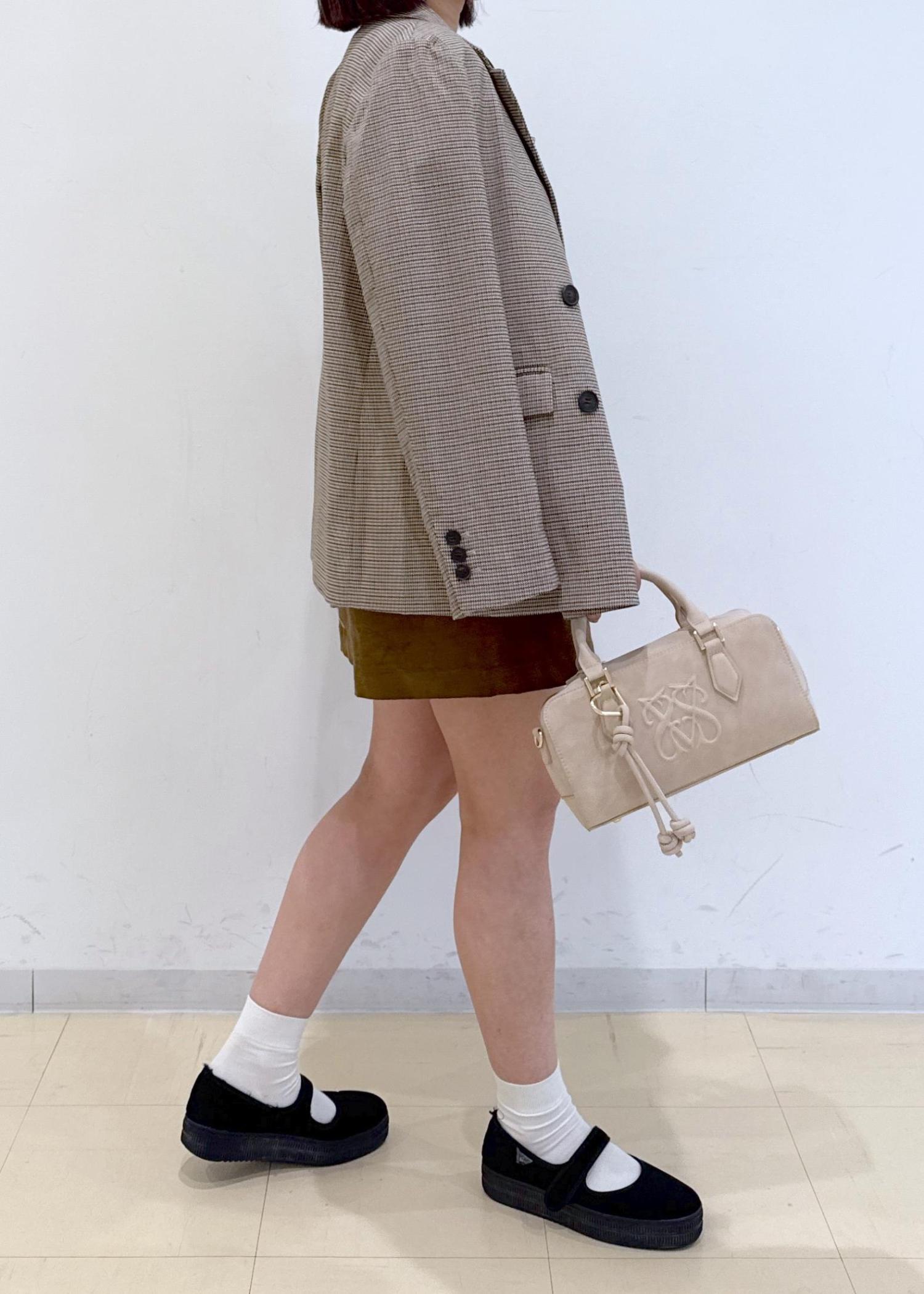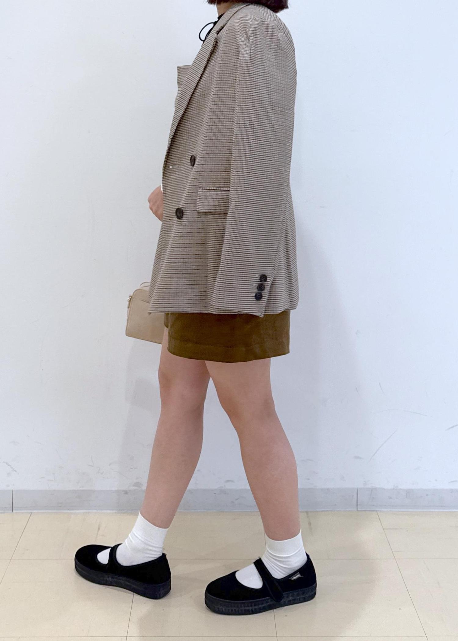 カチッとしがちなジャケットをショートパンツやベロアで合わせ、カラーは得意のベージュ系でまとめたワントーンコーデにすることで甘さをプラスしたコーディネートにしました♩
