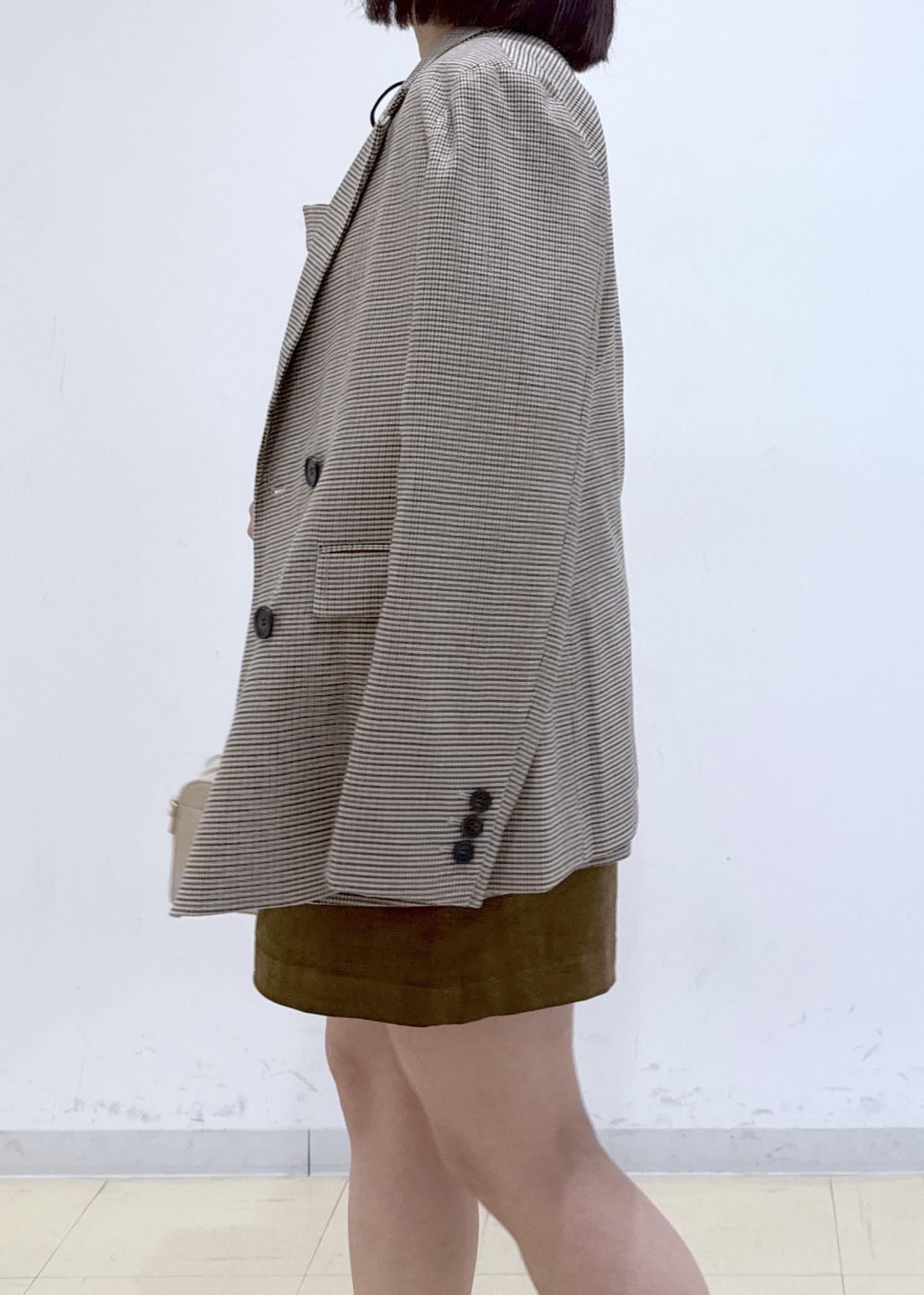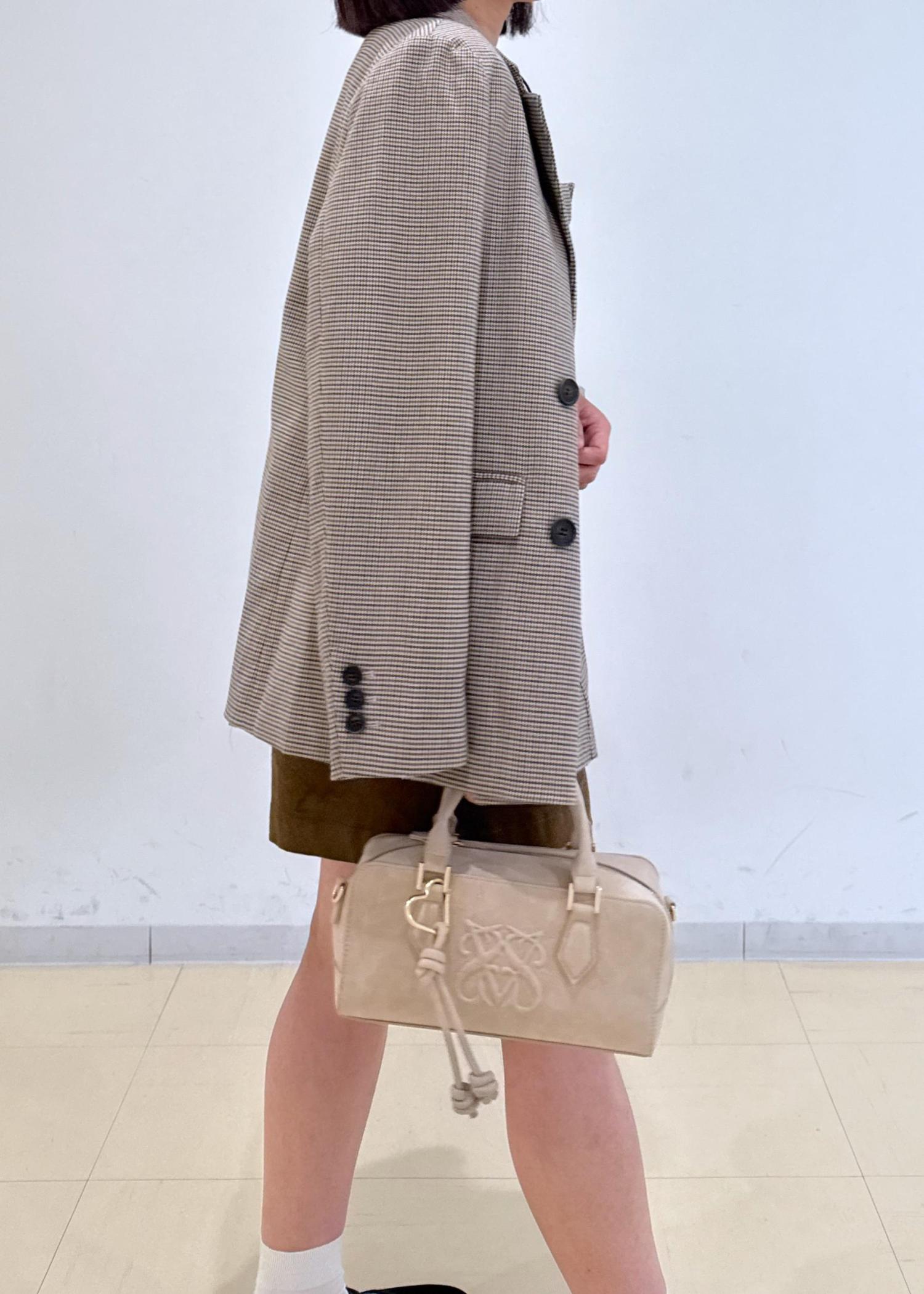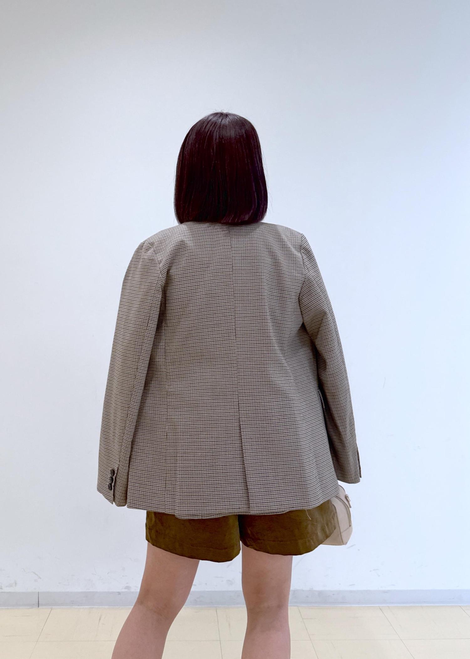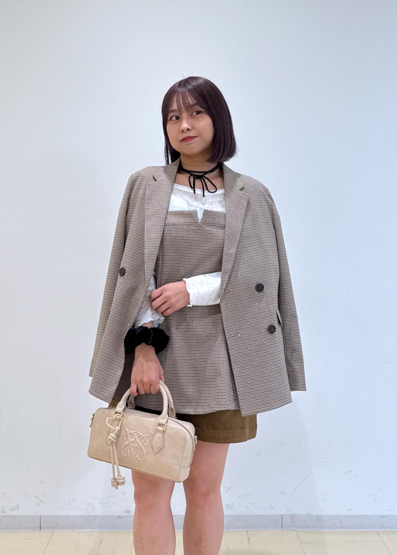 カチッとしがちなジャケットをショートパンツやベロアで合わせ、カラーは得意のベージュ系でまとめたワントーンコーデにすることで甘さをプラスしたコーディネートにしました♩