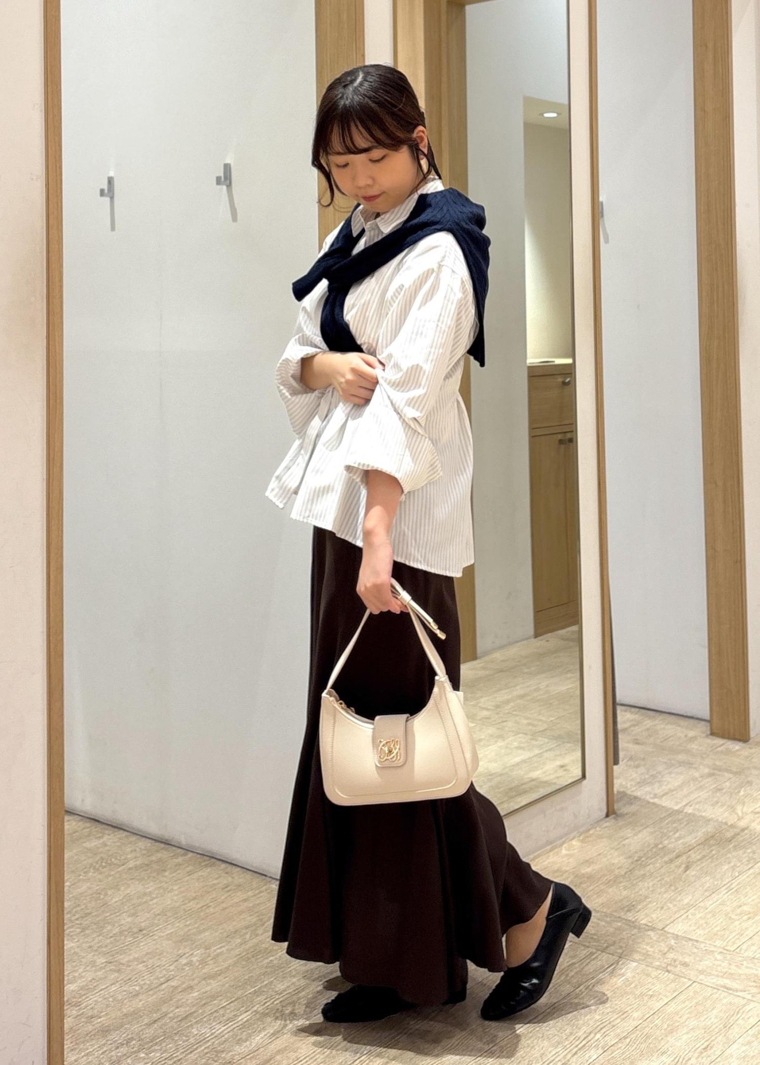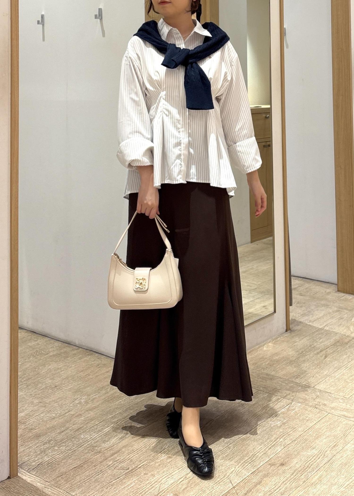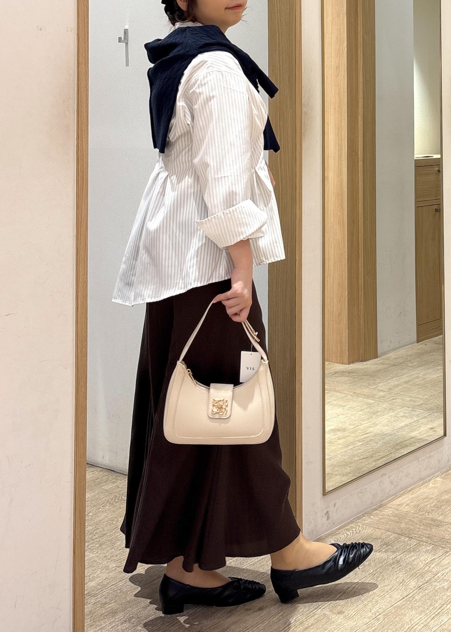 金具のワンポイントがリッチ見え。コーデ全体の柔らかいトーンとマッチし、上品なまとまり感を演出。
