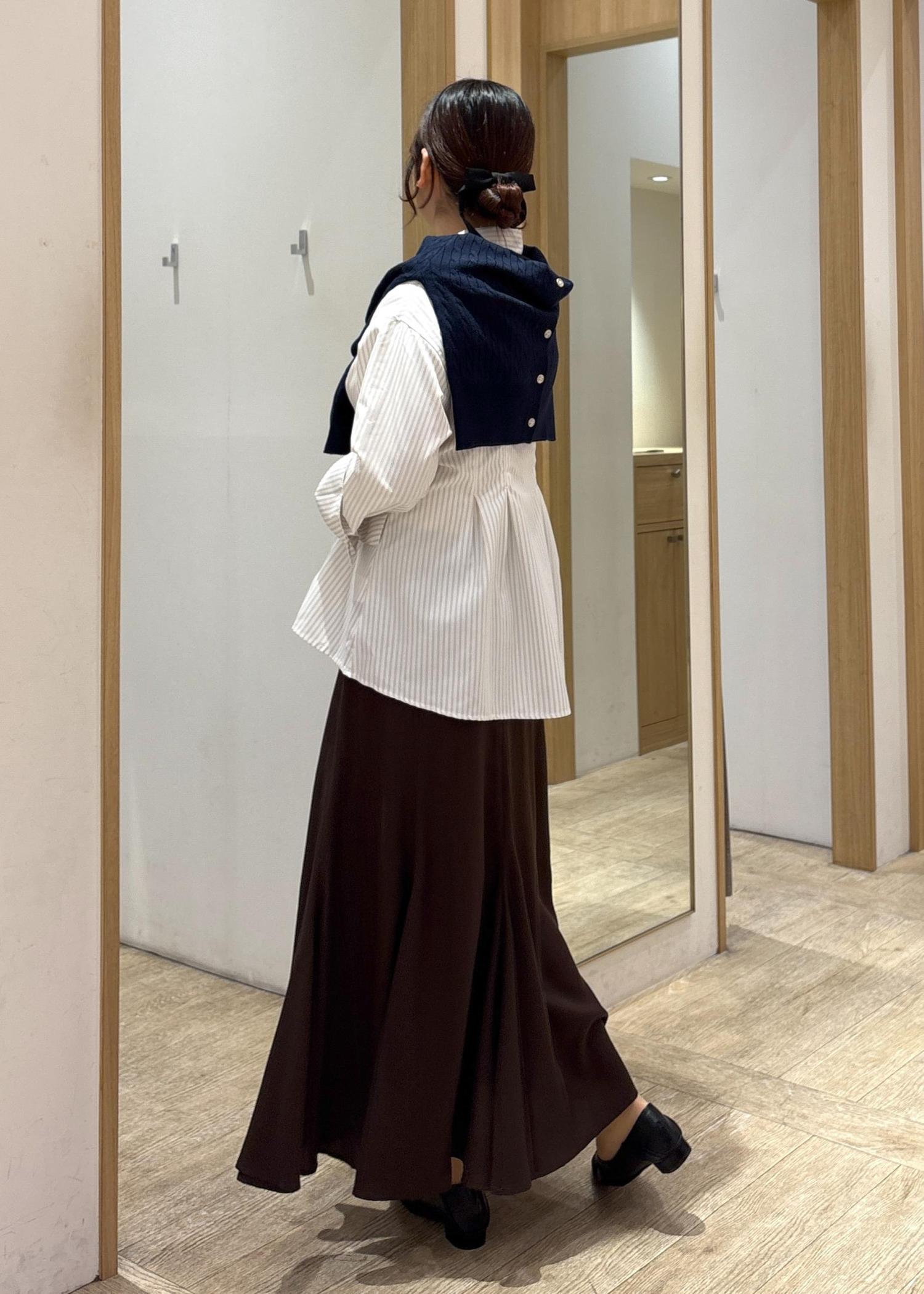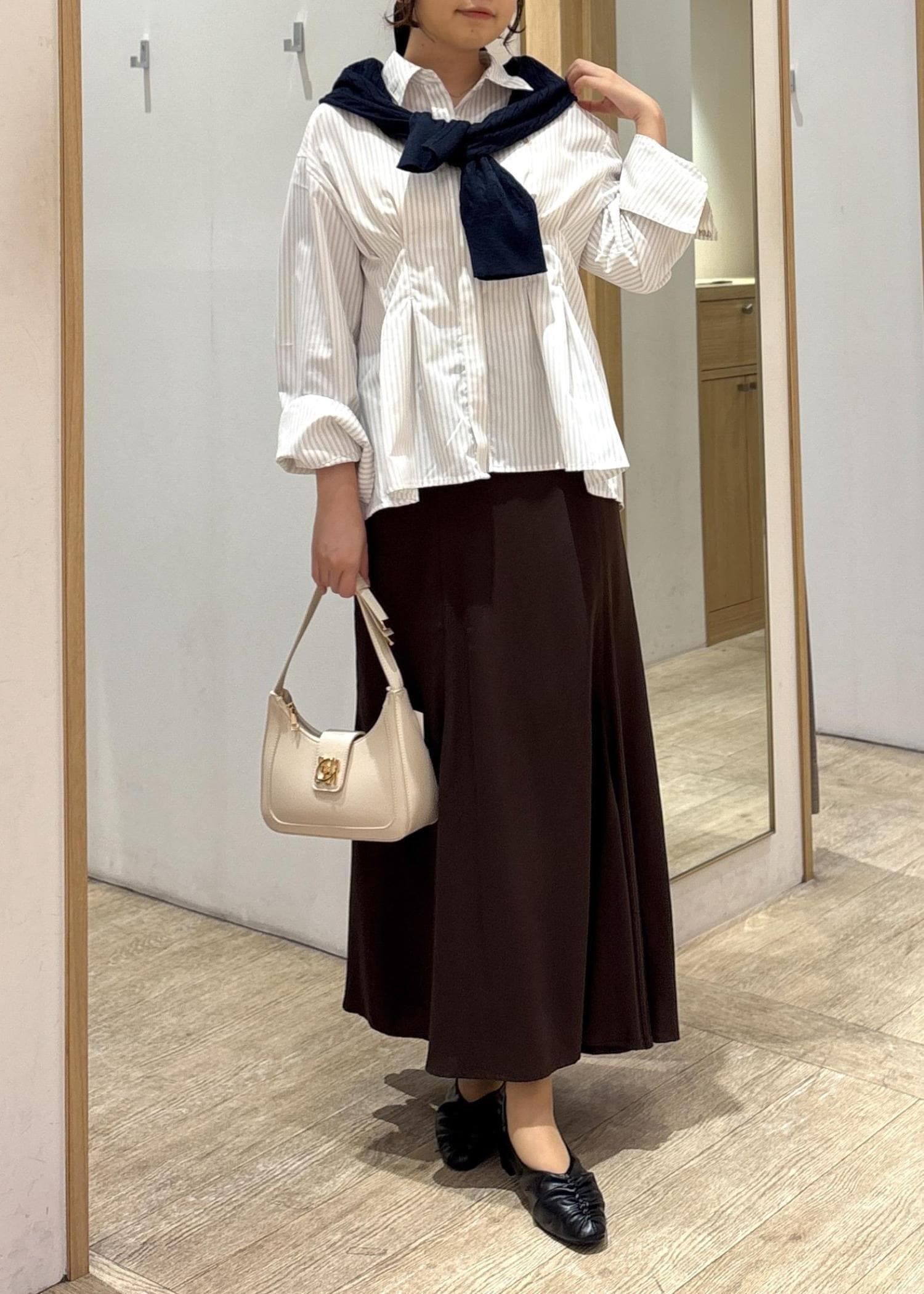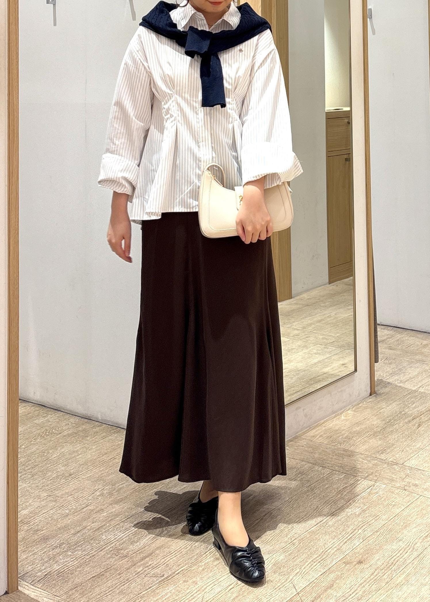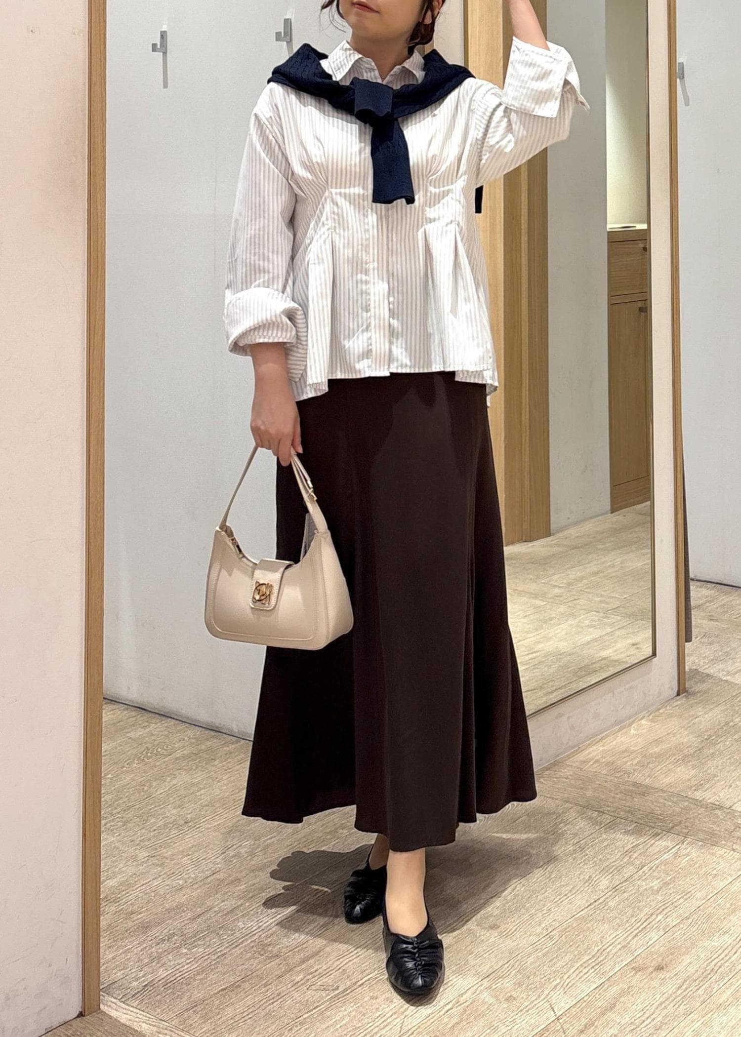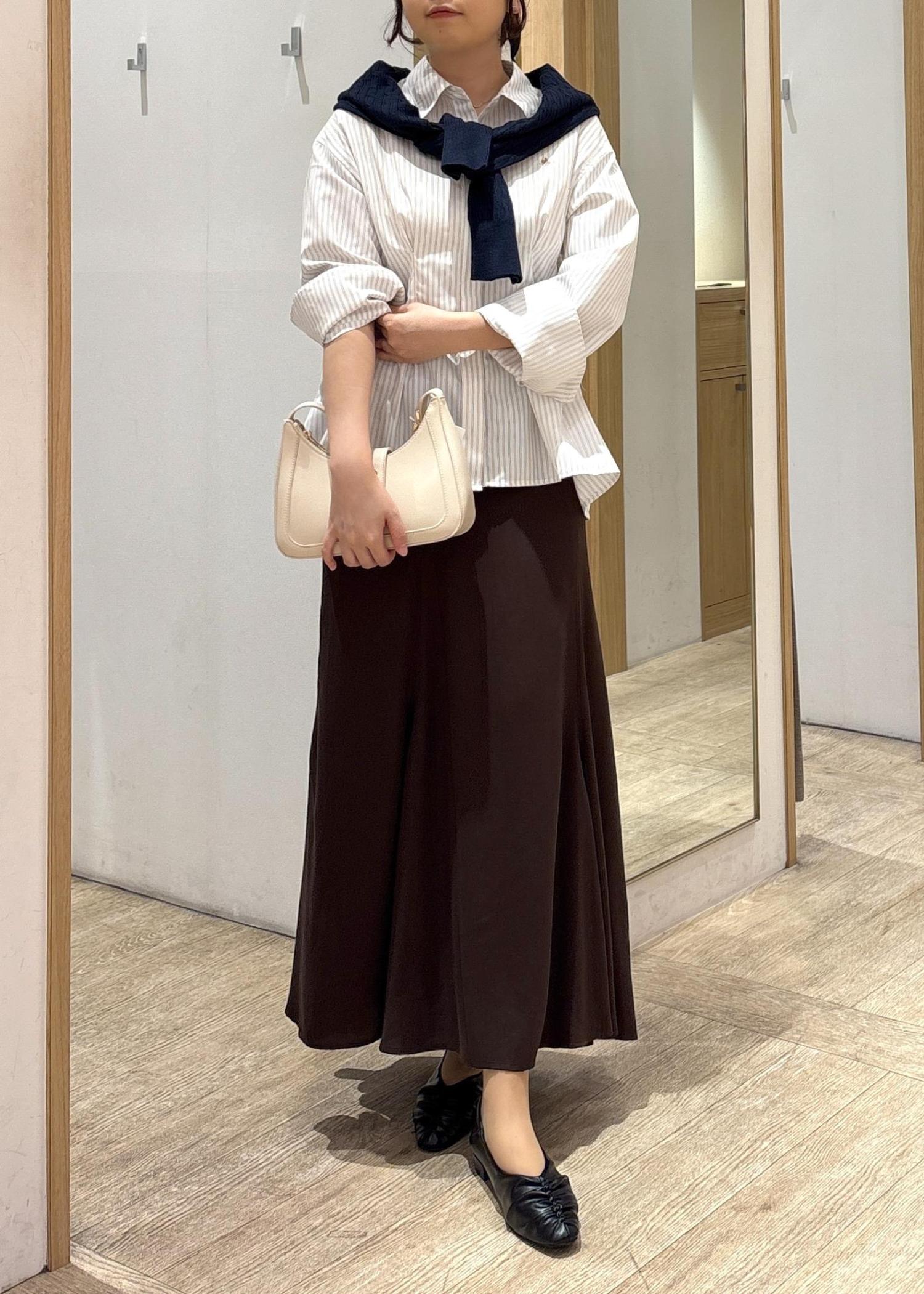 ややハリ感のある素材で、ストレート体型の立体感をきれいに活かし、裾のフレア感も腰回りを拾いにくく◎。 -