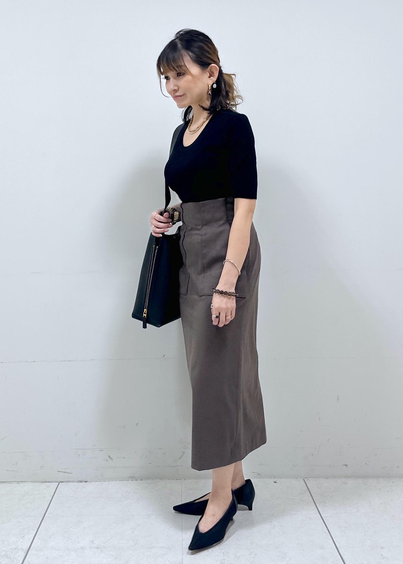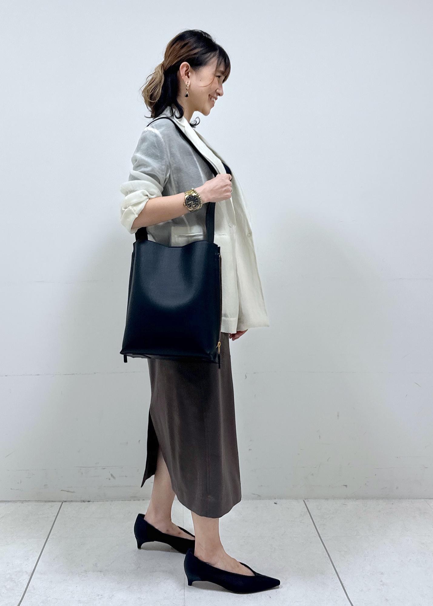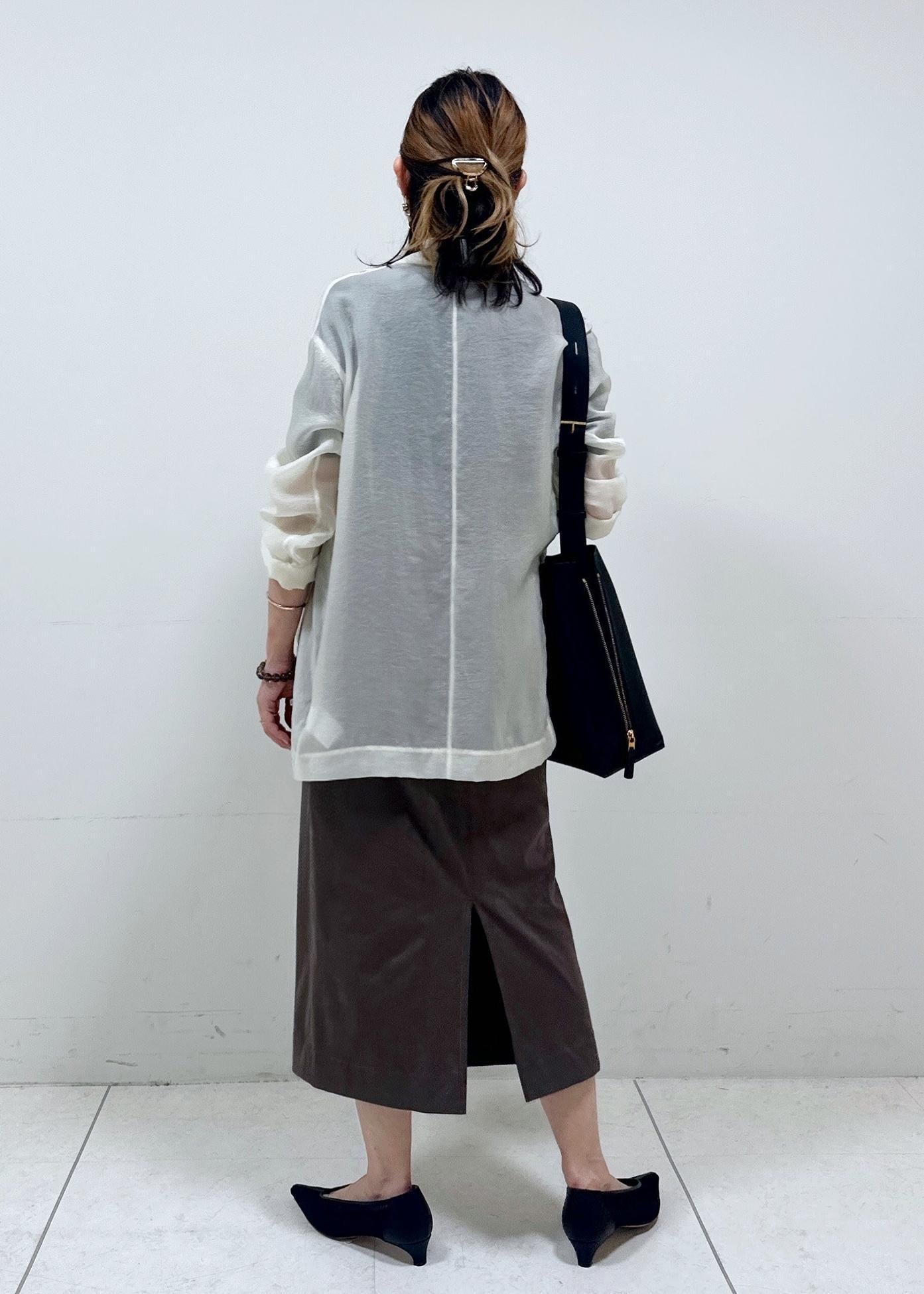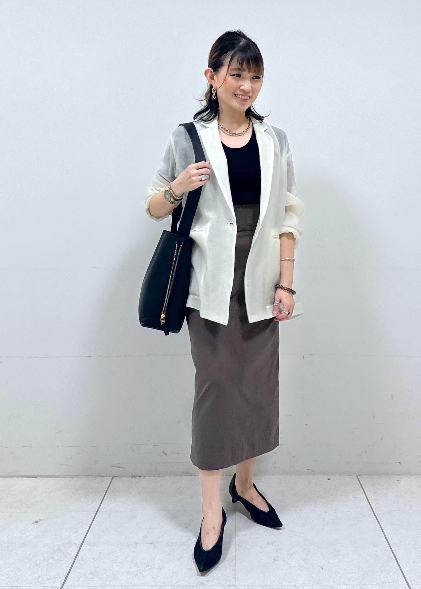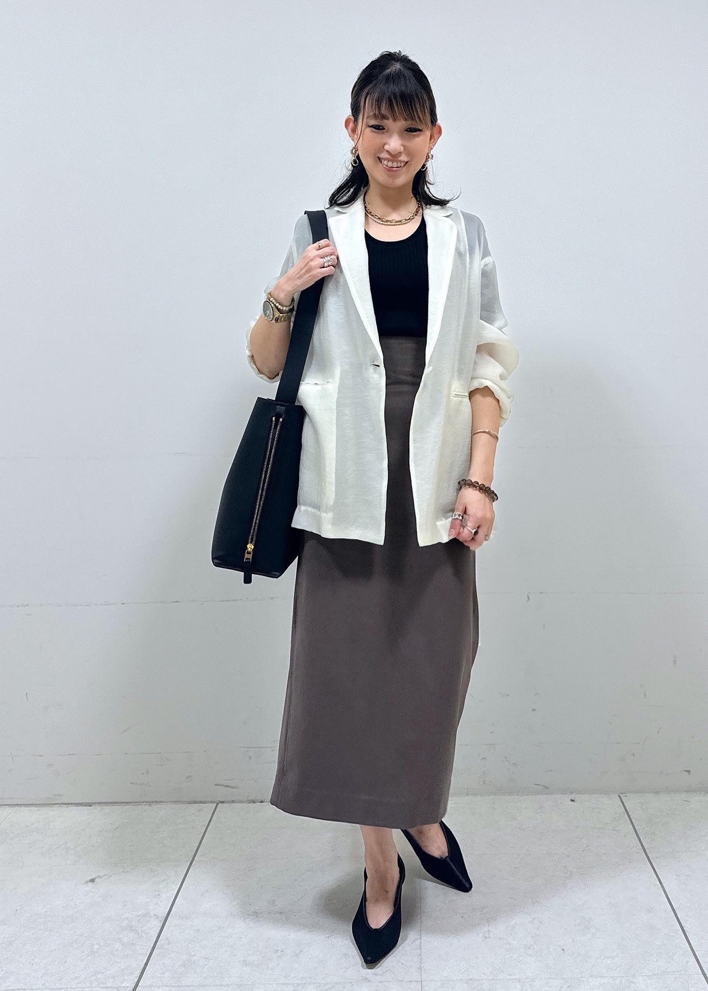 シアージャケットで抜け感を出しつつ、シンプルなインナーとスカートのスタイルで、お仕事シーンのスタイリングにしました。